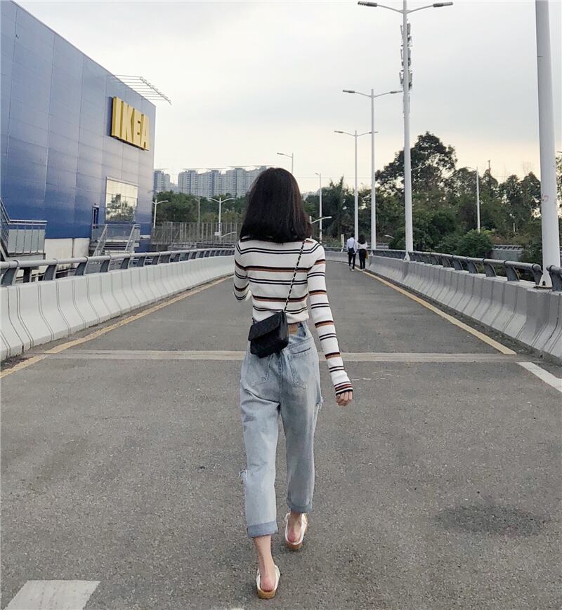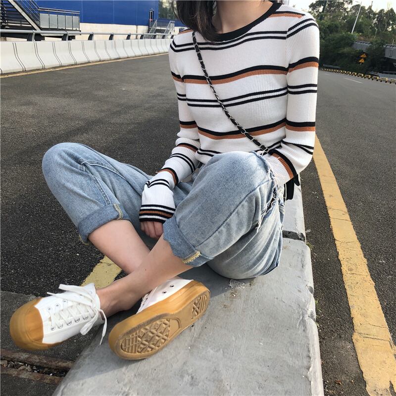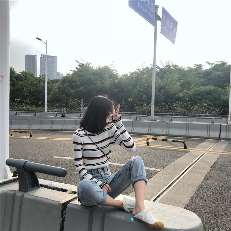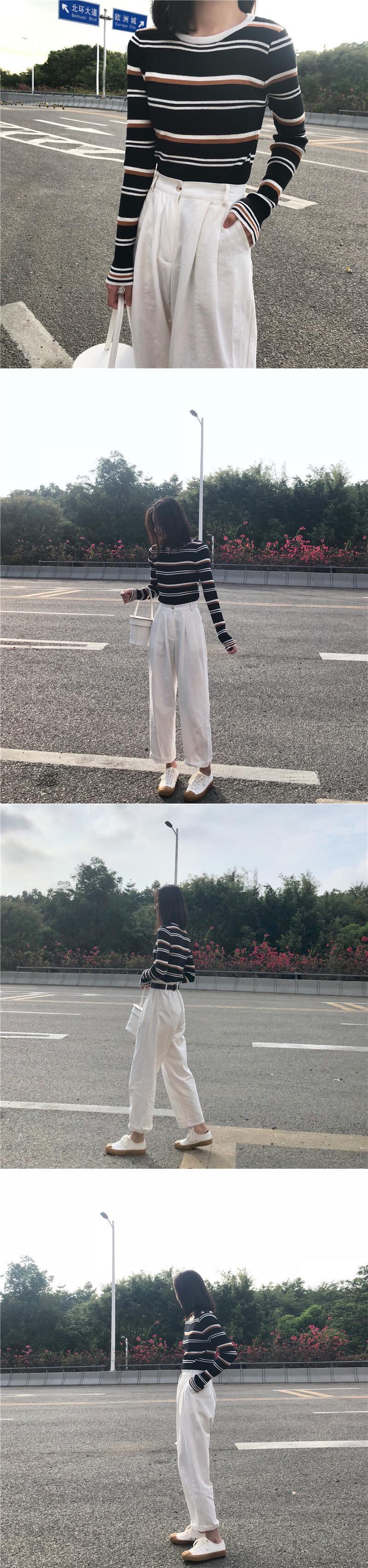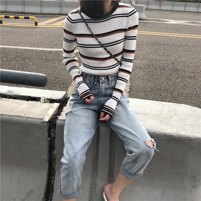 白のストライプのボトムスシャツの女性の秋と冬のリブ付きの長袖のセーターは、スリムフィットのオールマッチのニットトップを備えたeignスタイルのデザインです ロング ホワイト オータム 秋物 ウィンター 冬物 7460028092495938 | framboise21