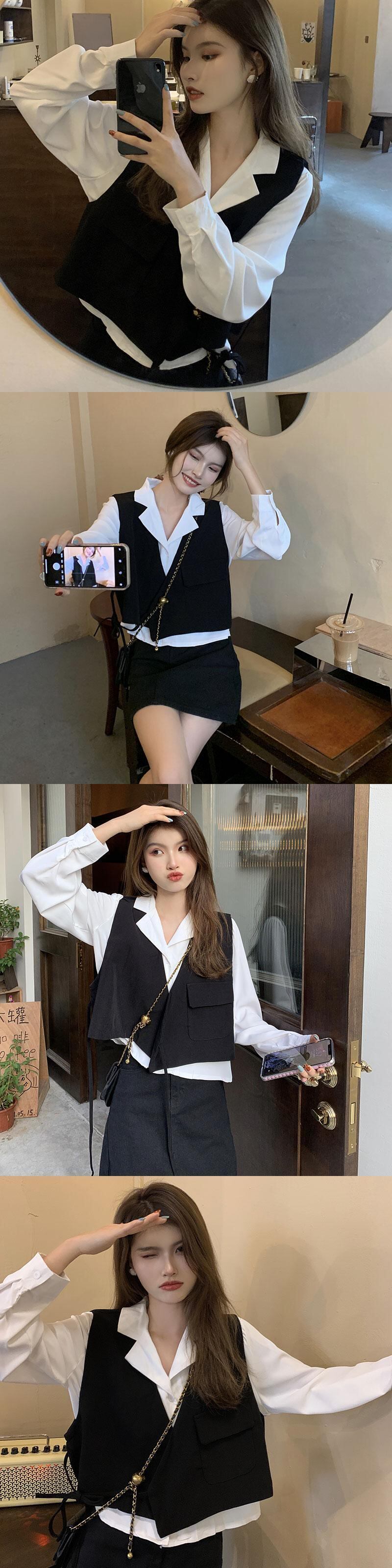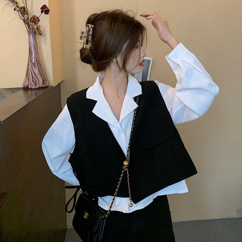 黒のスーツのベストの女性の秋と冬のショート ベスト ジャケット レイヤード チョッキ ノースリーブ ベスト シャツ ツーピース スーツ レッド ブラック オータム 秋物 ウィンター 冬物 7460086089557326 | framboise21