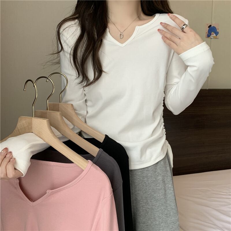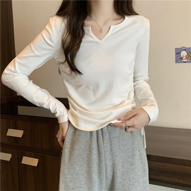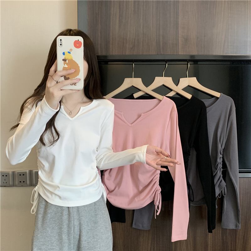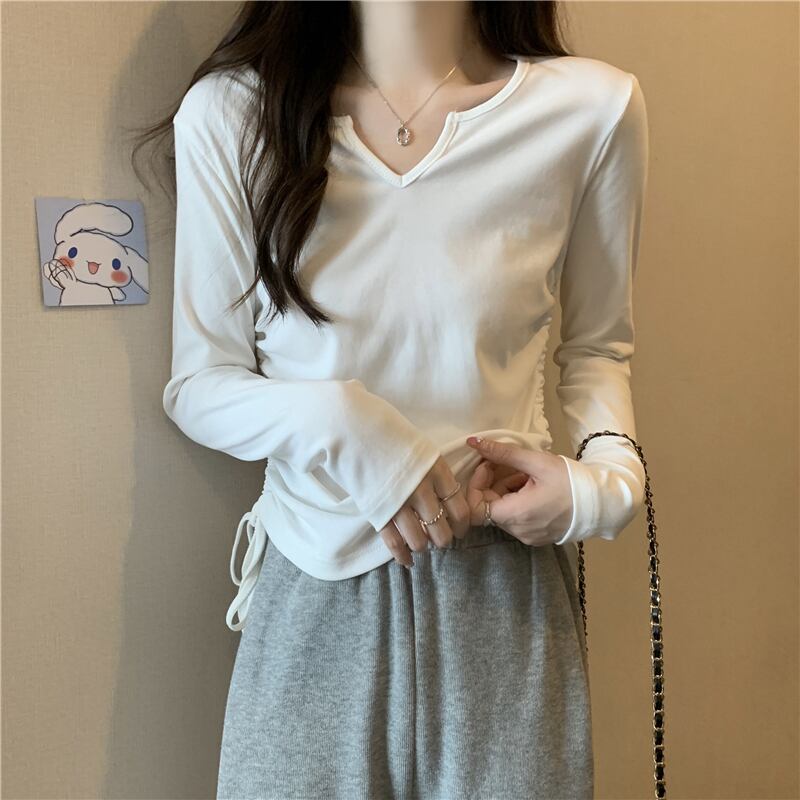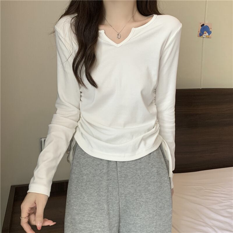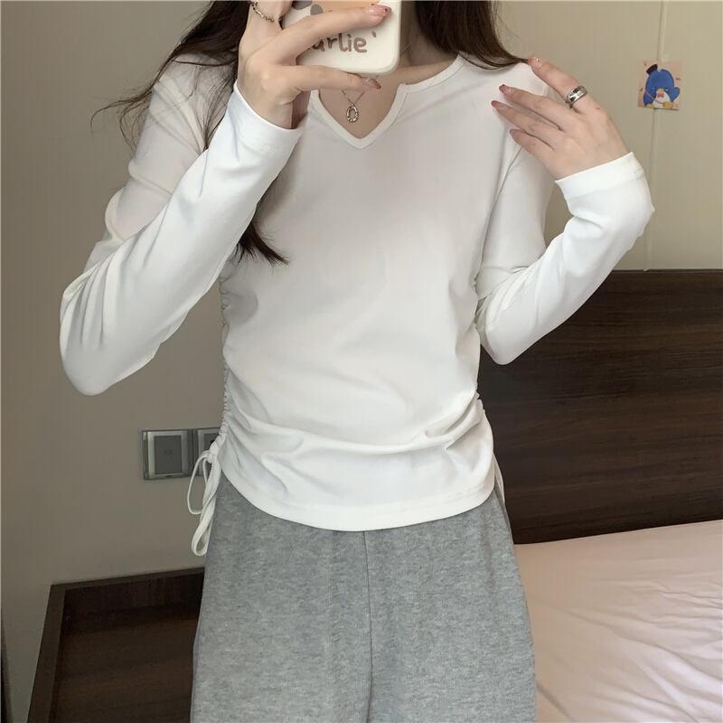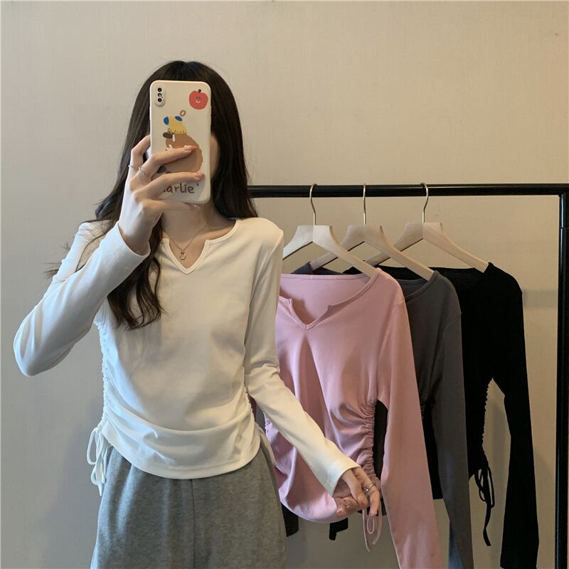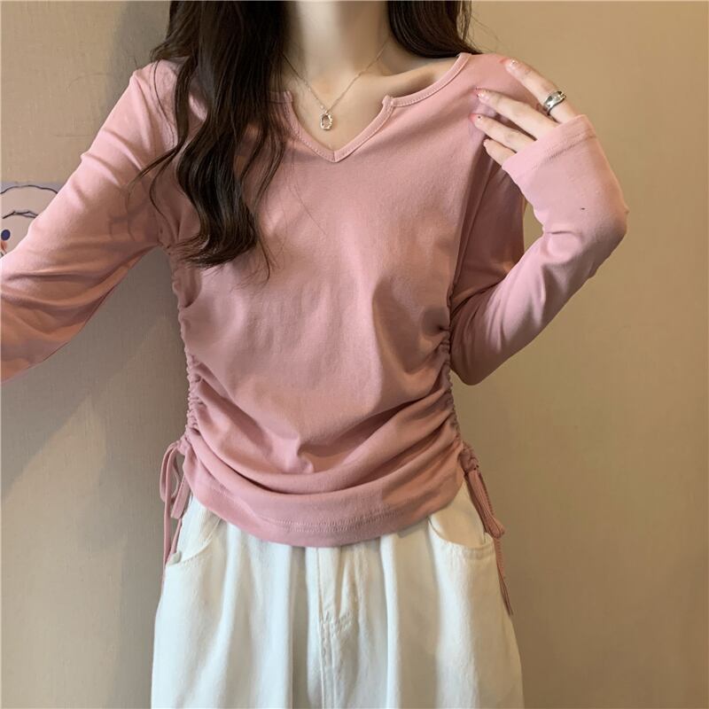 フレンチ Vネック 鎖骨 長袖 インナー Tシャツ ボトムス シャツ レディース 秋ニッチ 個性的 スペシャル 巾着 スリム ショート トップス ロング オータム 秋物 7460040008760703 | framboise21