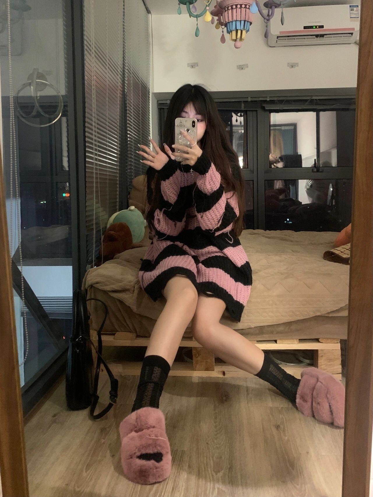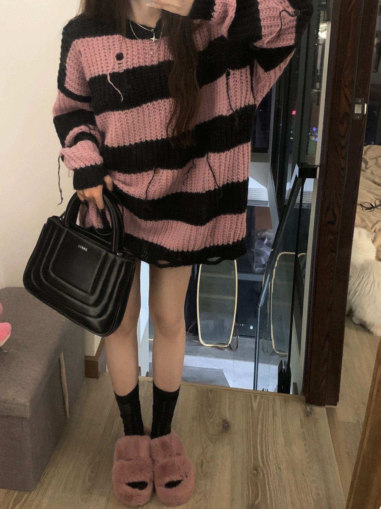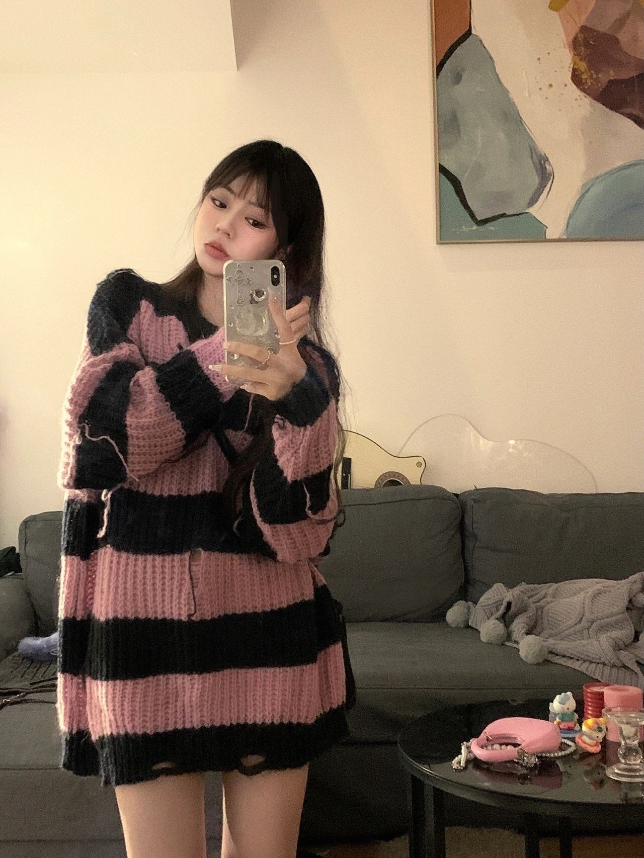 リップド セーター レディース 秋冬 ピンク ストライプ ニット セーター コート ゆったり アウター ゆったり プルオーバー 太め ライン 長袖 トップス ロング オータム 秋物 ウィンター 冬物 746005318157373 | framboise21