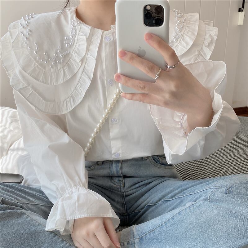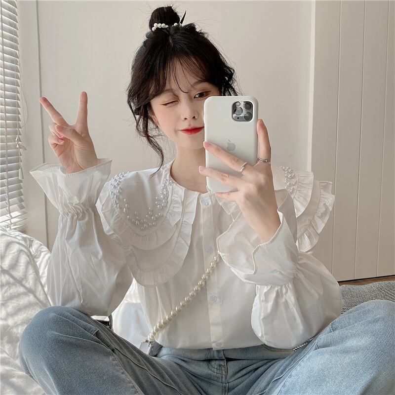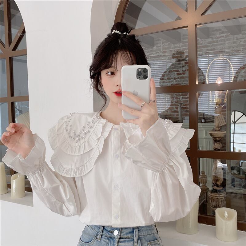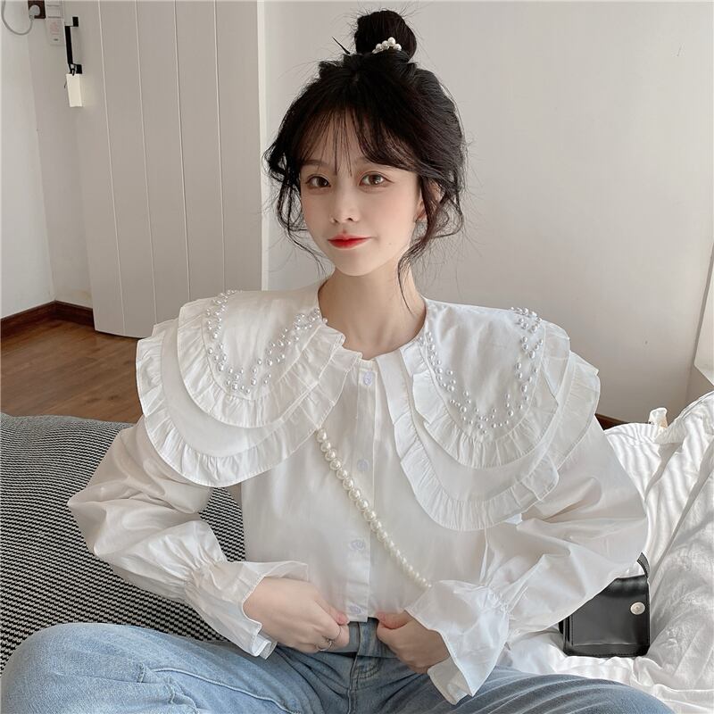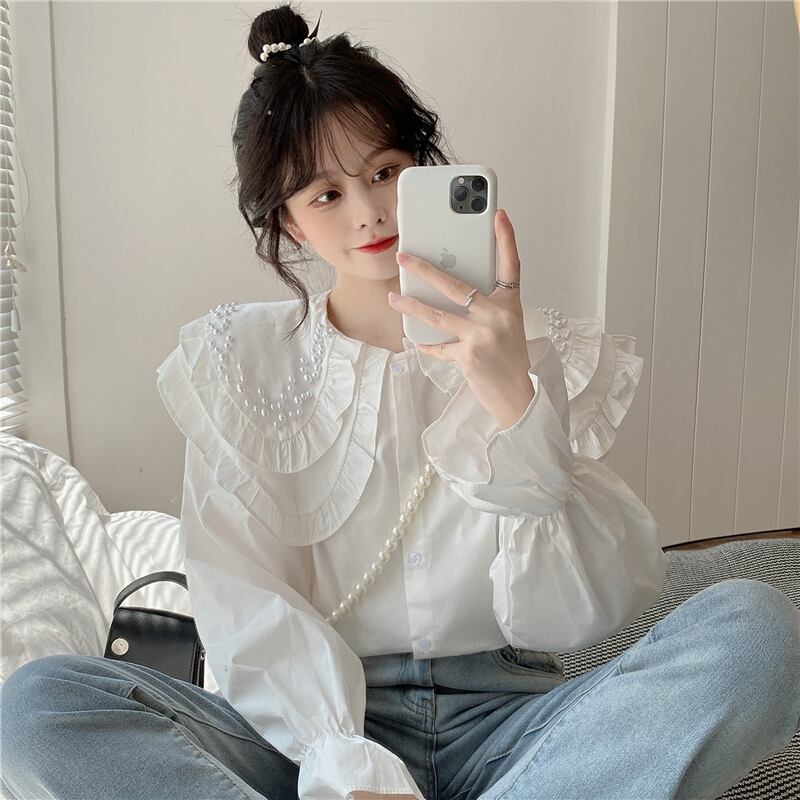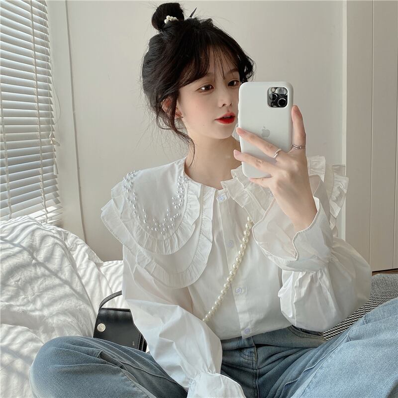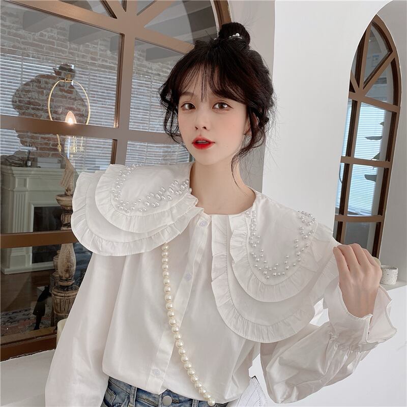 白いビーズの二層人形の襟のシャツの女性の春と秋のデザインのニッチなスモックシャツフレンチシックなトップ ホワイト スプリング 春物 オータム 秋物 7460078132296430 | framboise21