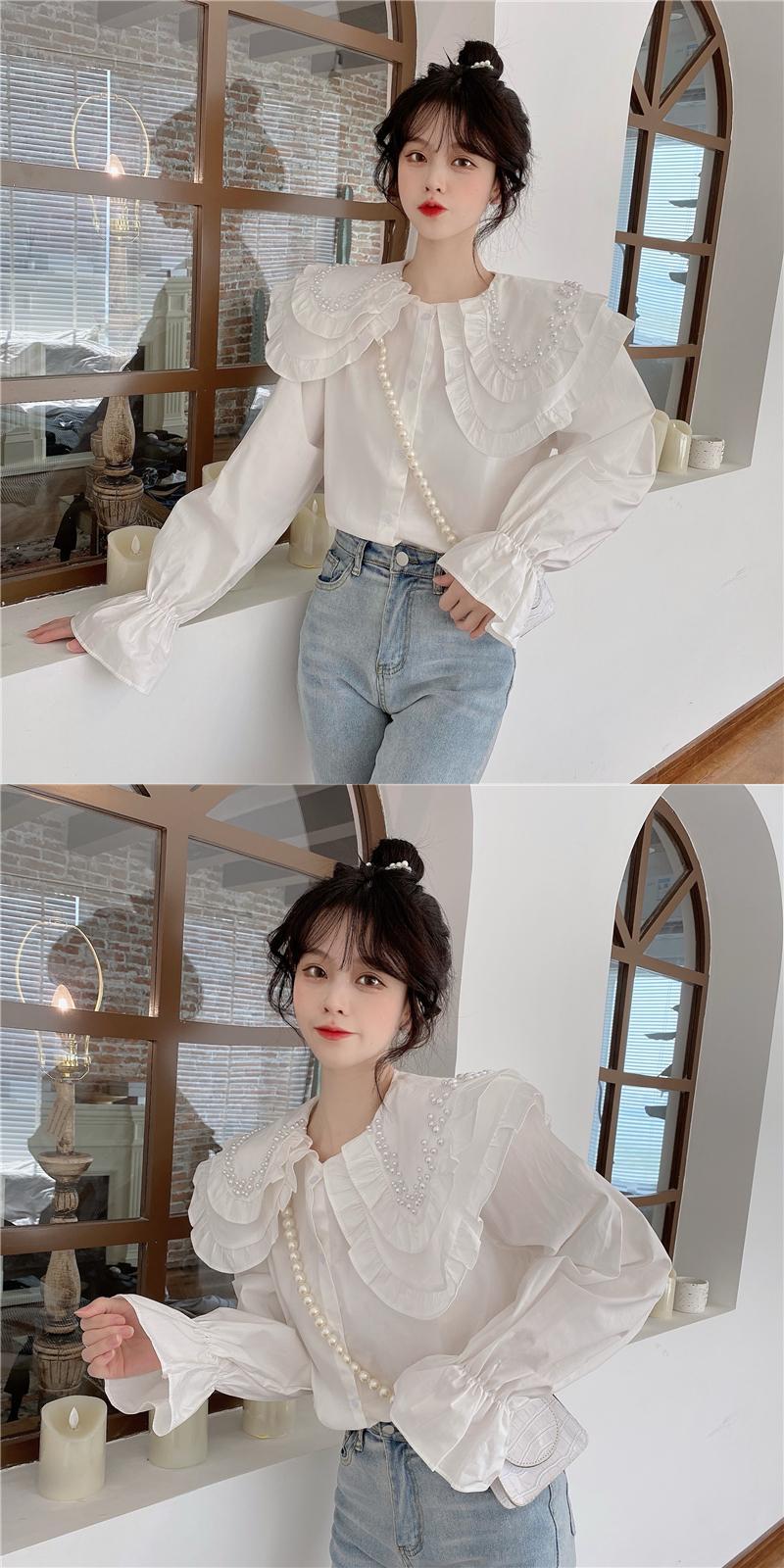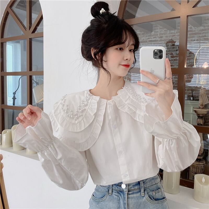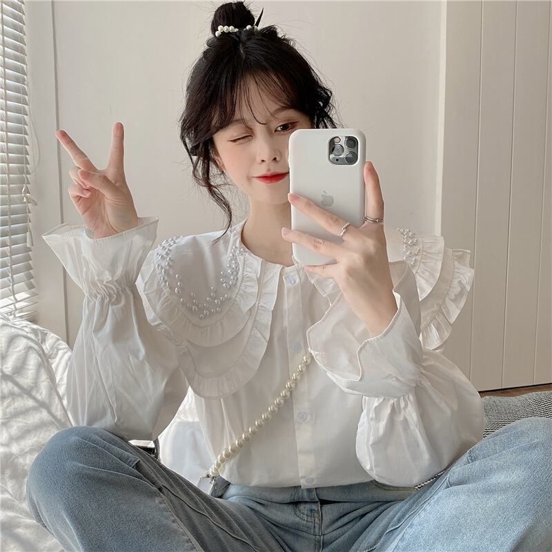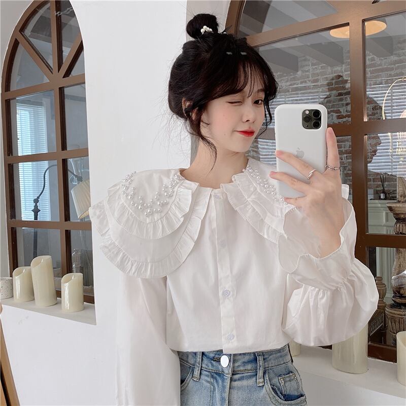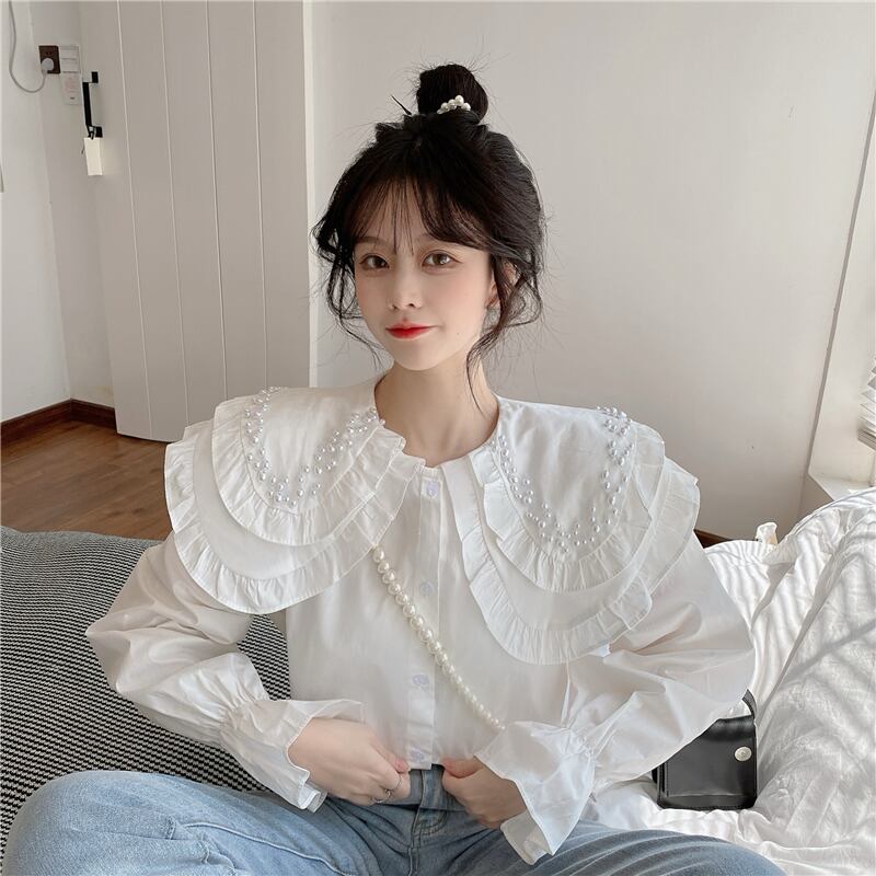 白いビーズの二層人形の襟のシャツの女性の春と秋のデザインのニッチなスモックシャツフレンチシックなトップ ホワイト スプリング 春物 オータム 秋物 7460078132296430 | framboise21