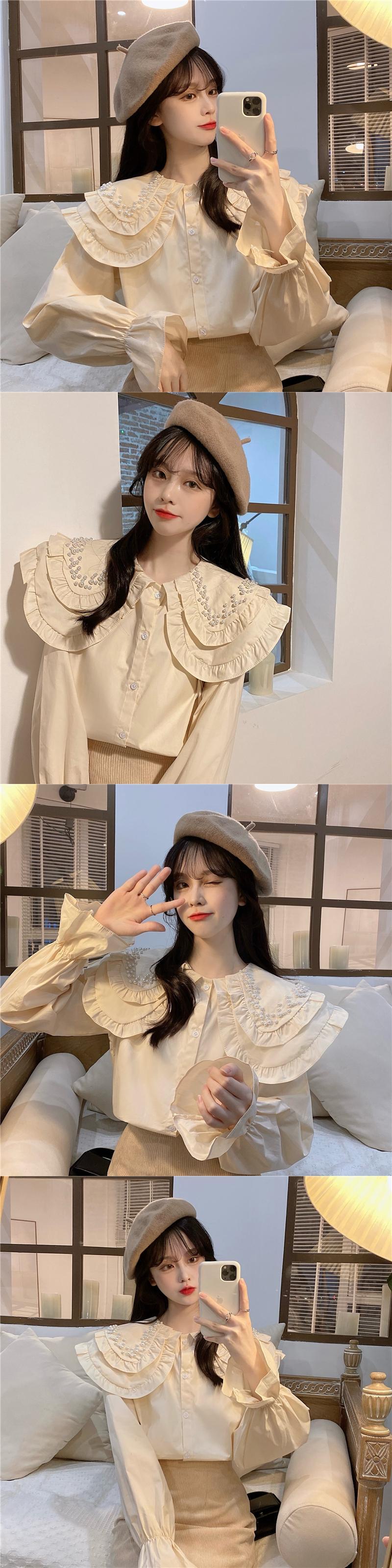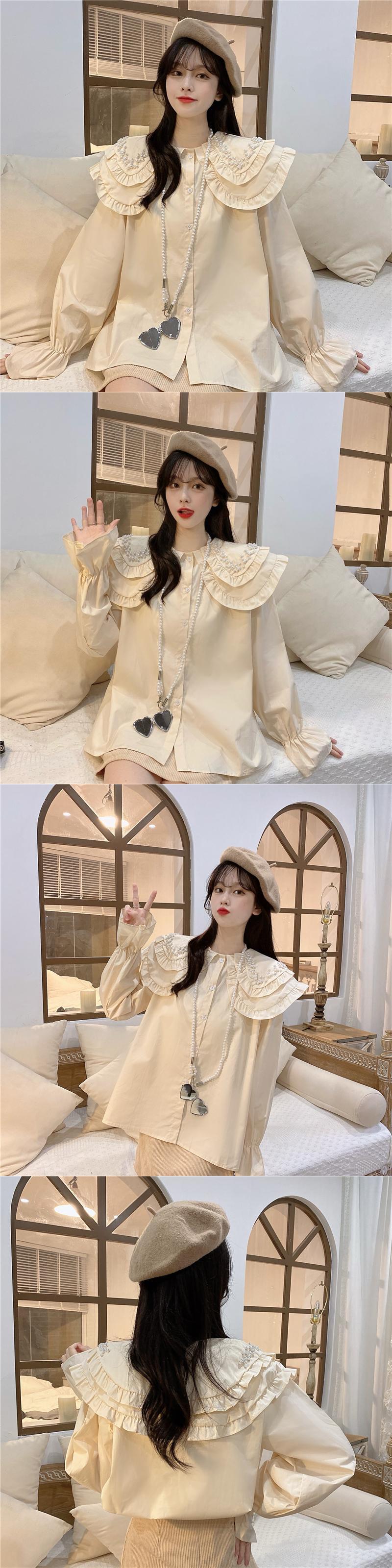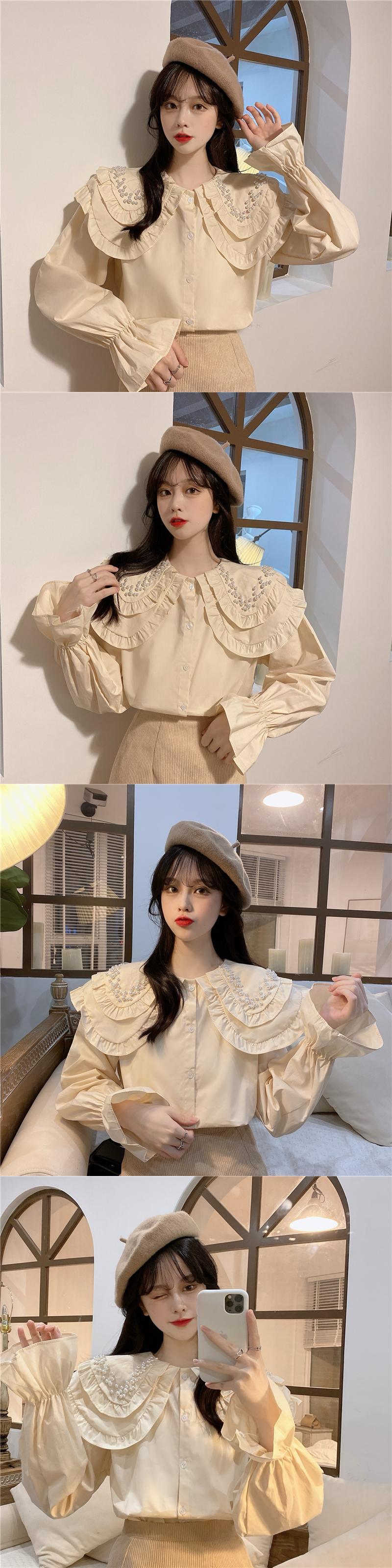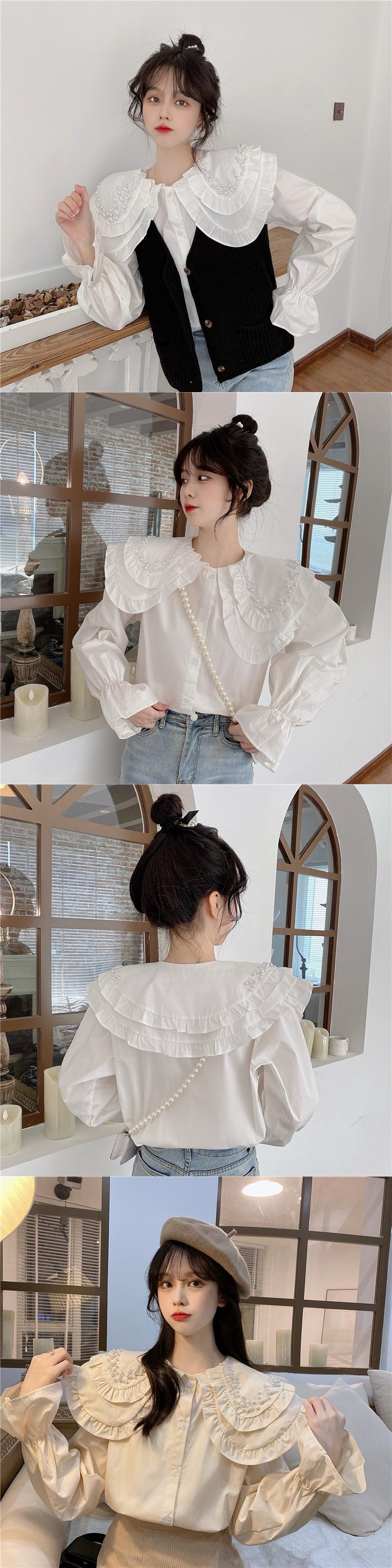 白いビーズの二層人形の襟のシャツの女性の春と秋のデザインのニッチなスモックシャツフレンチシックなトップ ホワイト スプリング 春物 オータム 秋物 7460078132296430 | framboise21