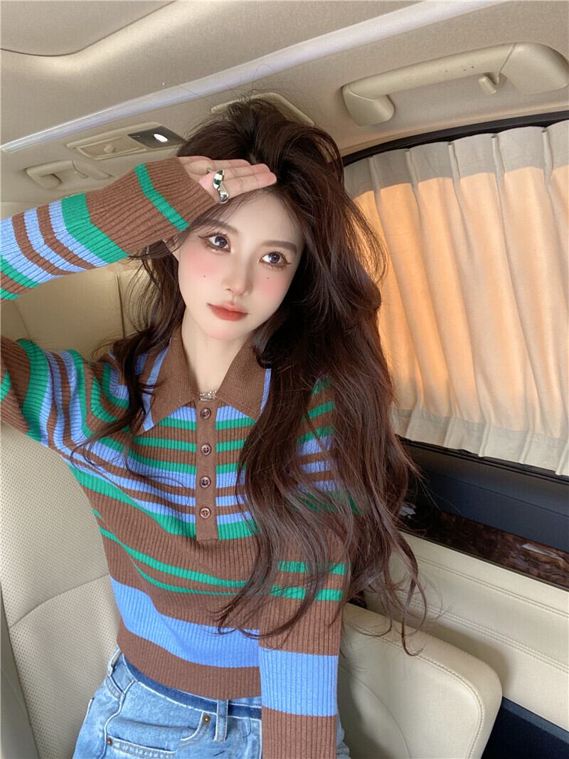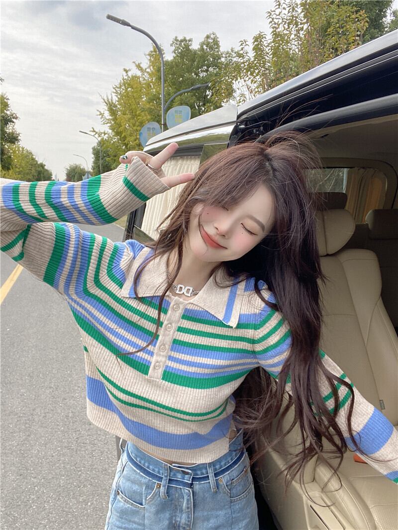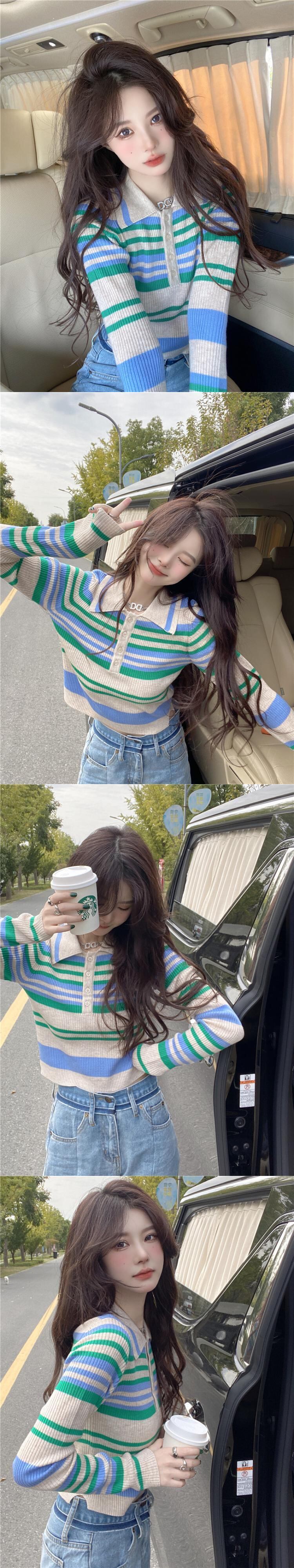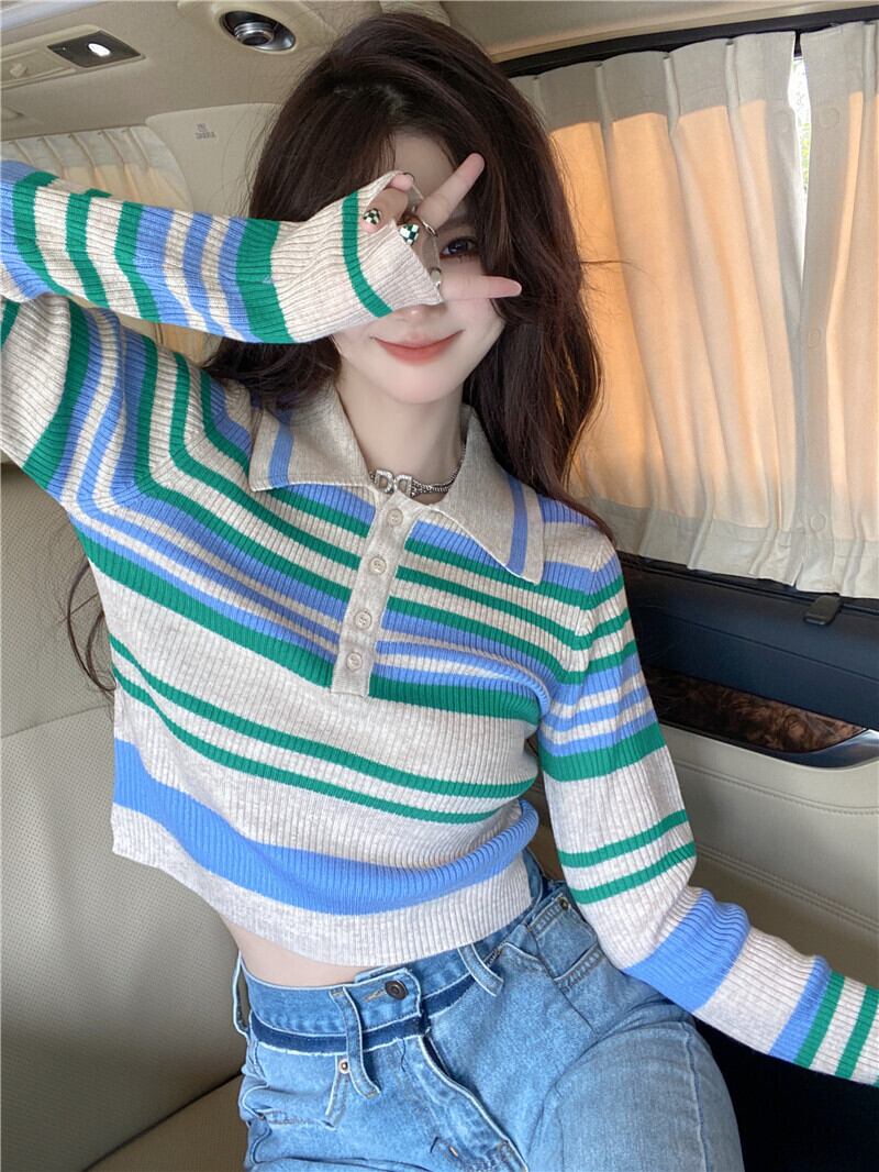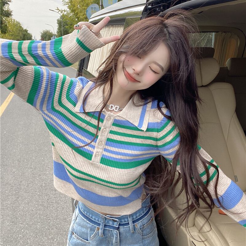 秋冬セーターレディースデザインセンスニッチハイウエストショートセクション長袖ポロ襟ストライプニットセーターボトムスシャツトップ女性 ロング オータム 秋物 ウィンター 冬物 7460069811858709 | framboise21