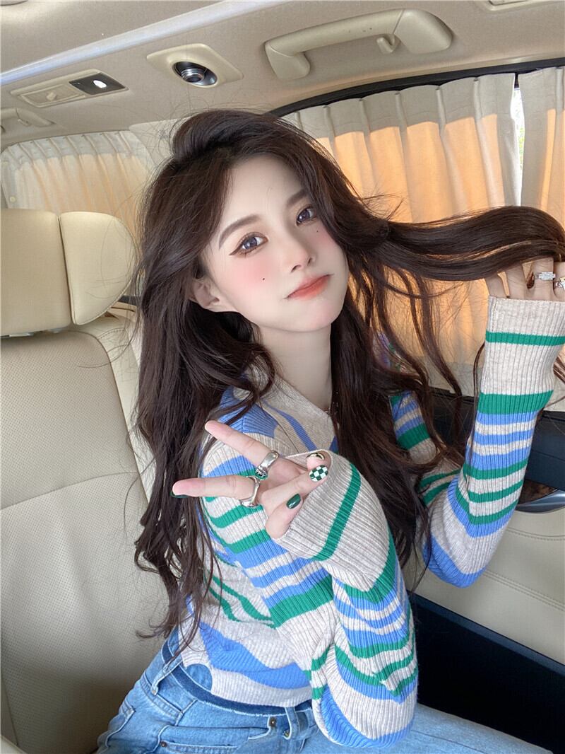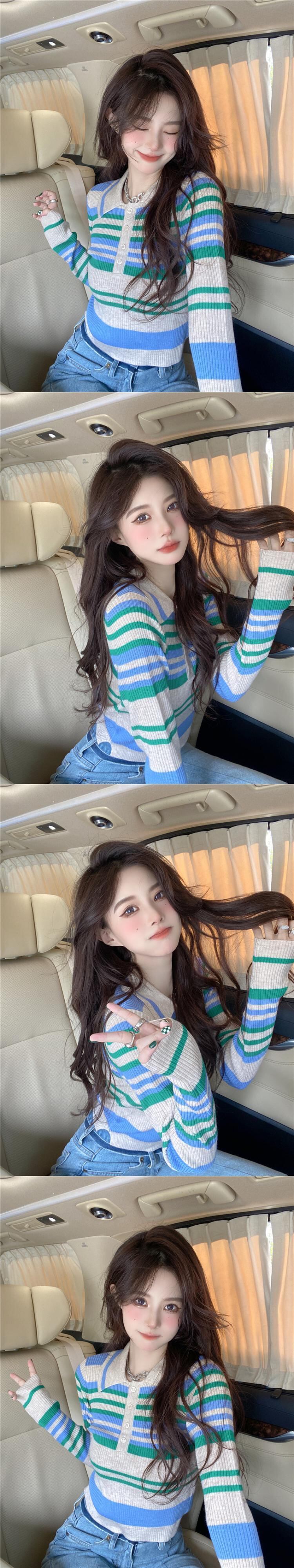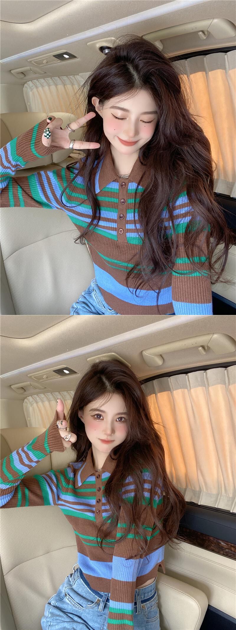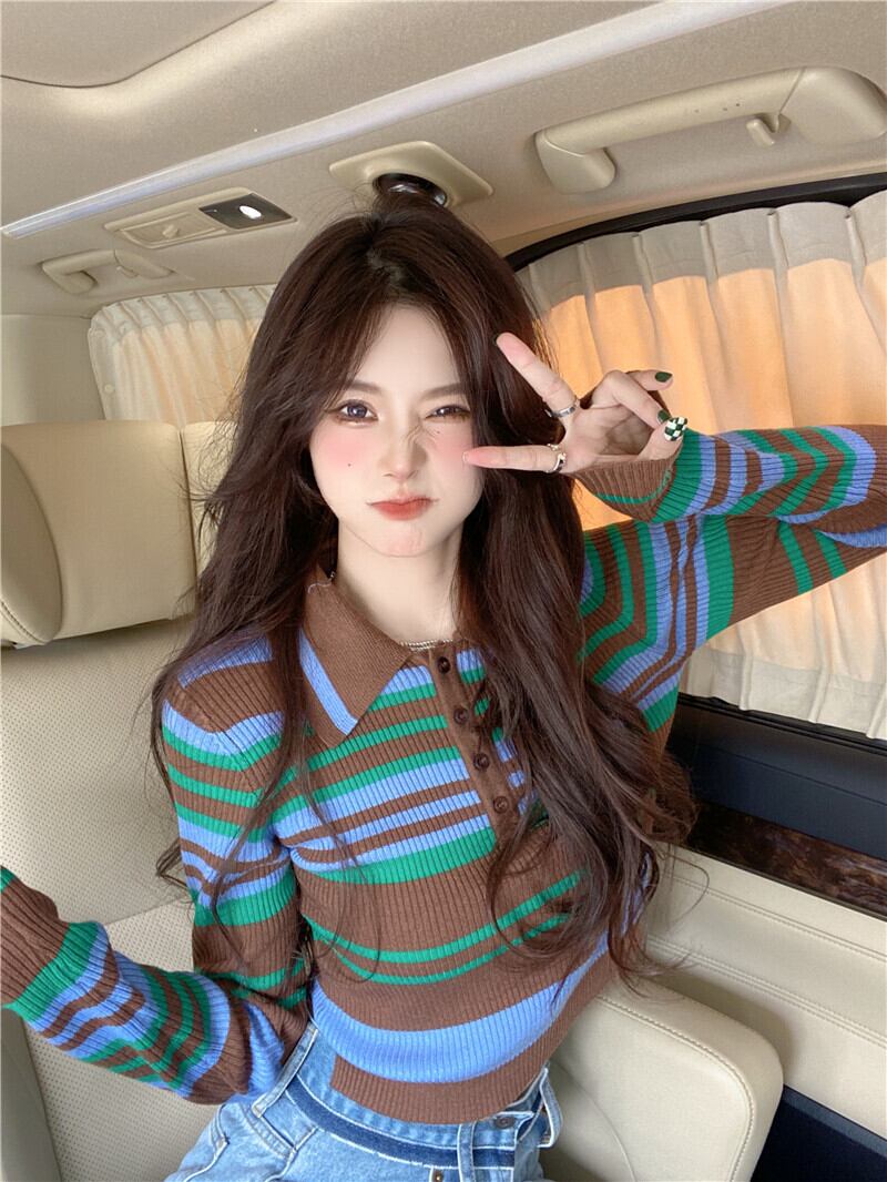 秋冬セーターレディースデザインセンスニッチハイウエストショートセクション長袖ポロ襟ストライプニットセーターボトムスシャツトップ女性 ロング オータム 秋物 ウィンター 冬物 7460069811858709 | framboise21