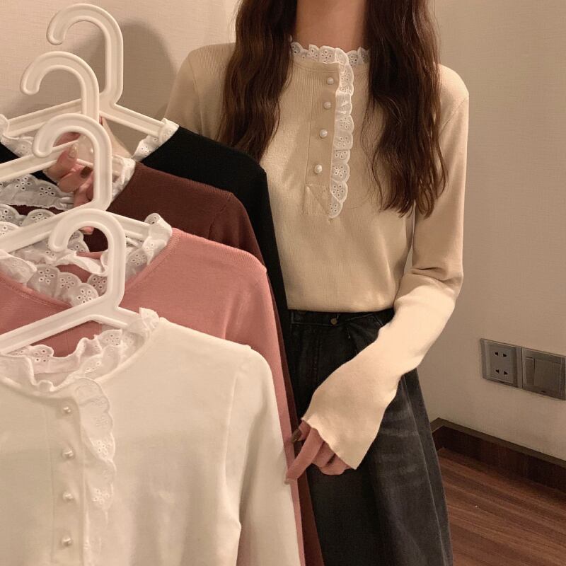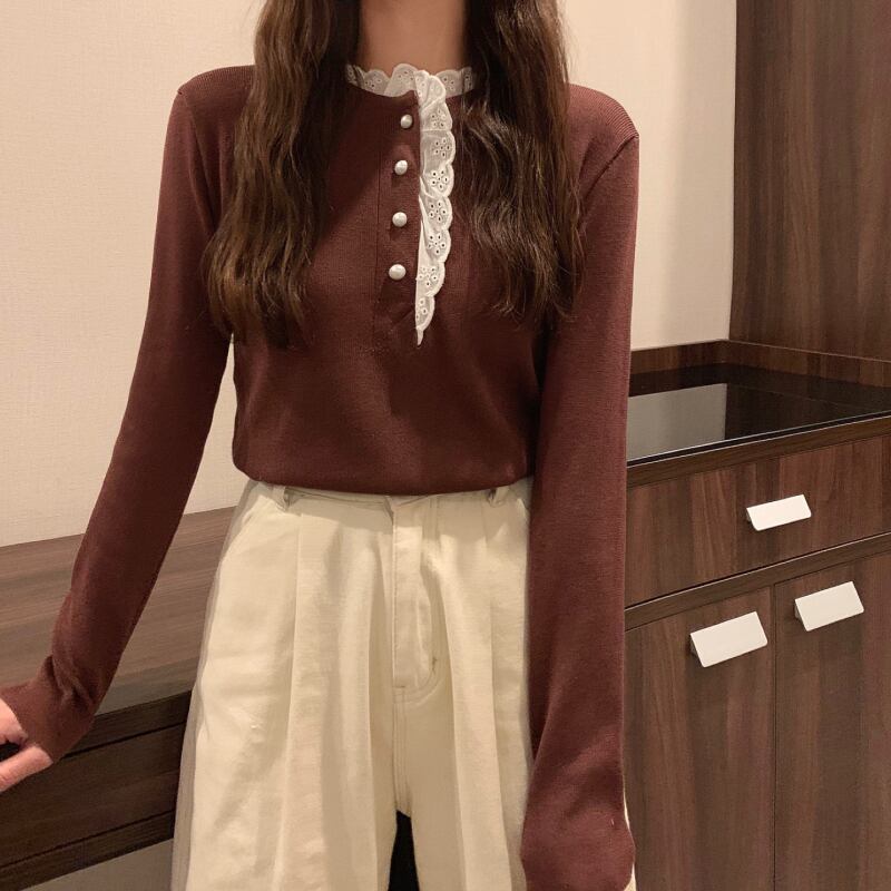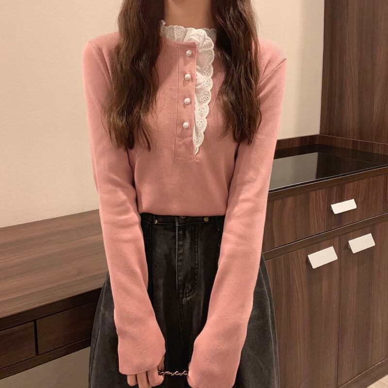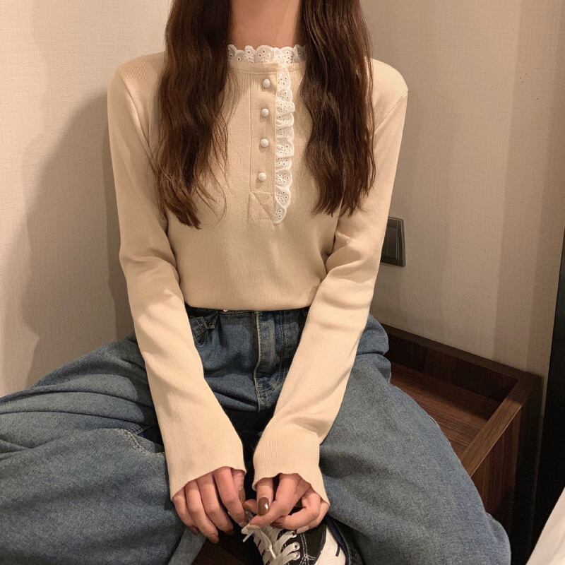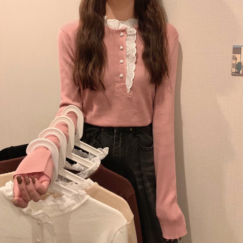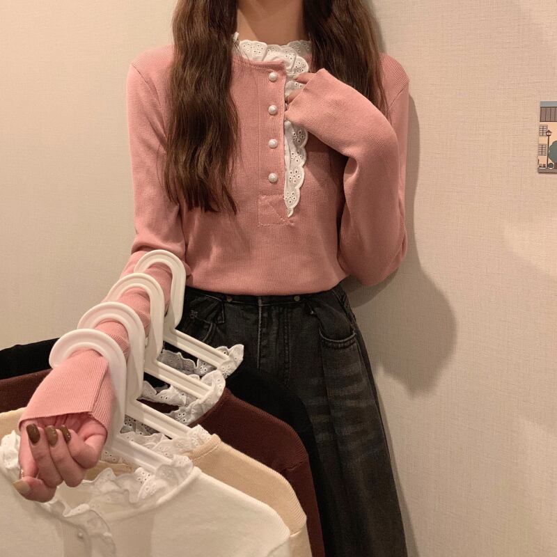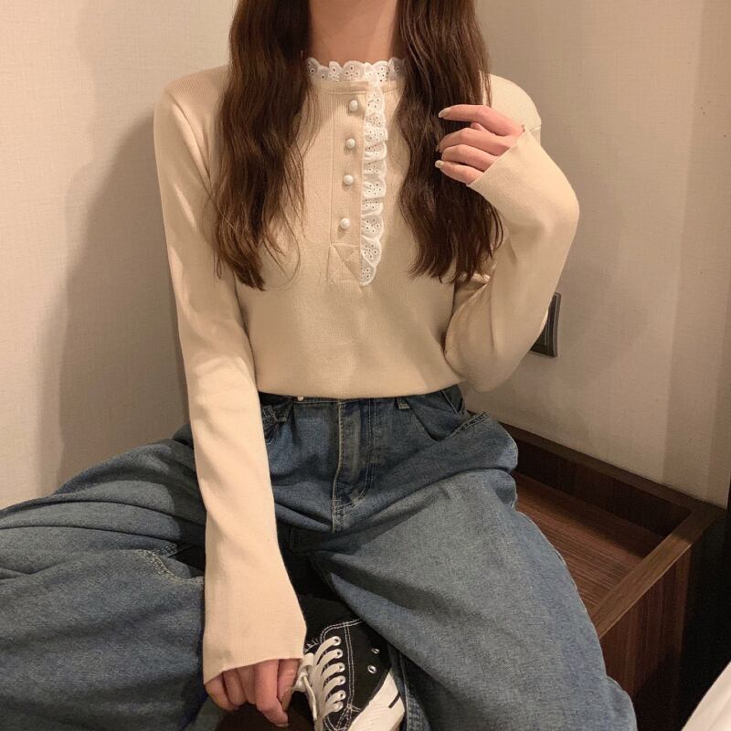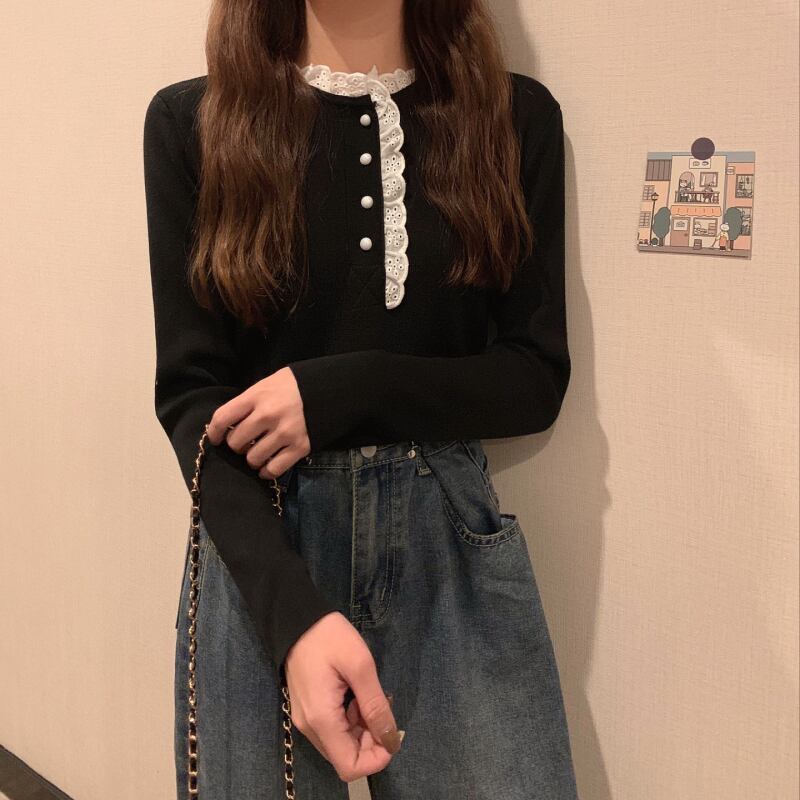 レース ボトムス シャツ レディース 秋冬 レース ニット セーター デザイン センス スーツ 付き エインスタイル ラウンドネック 長袖 トップス ブラック ロング オータム 秋物 ウィンター 冬物 Oネック 7460095377053982 | framboise21