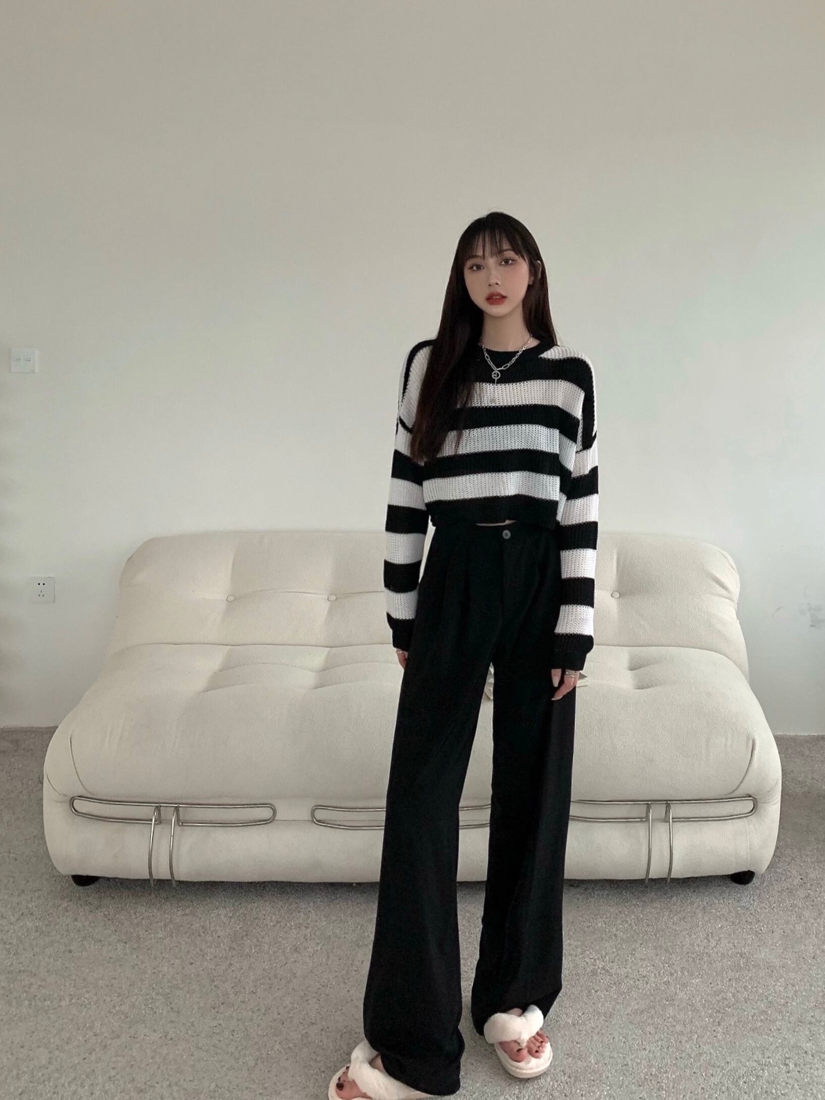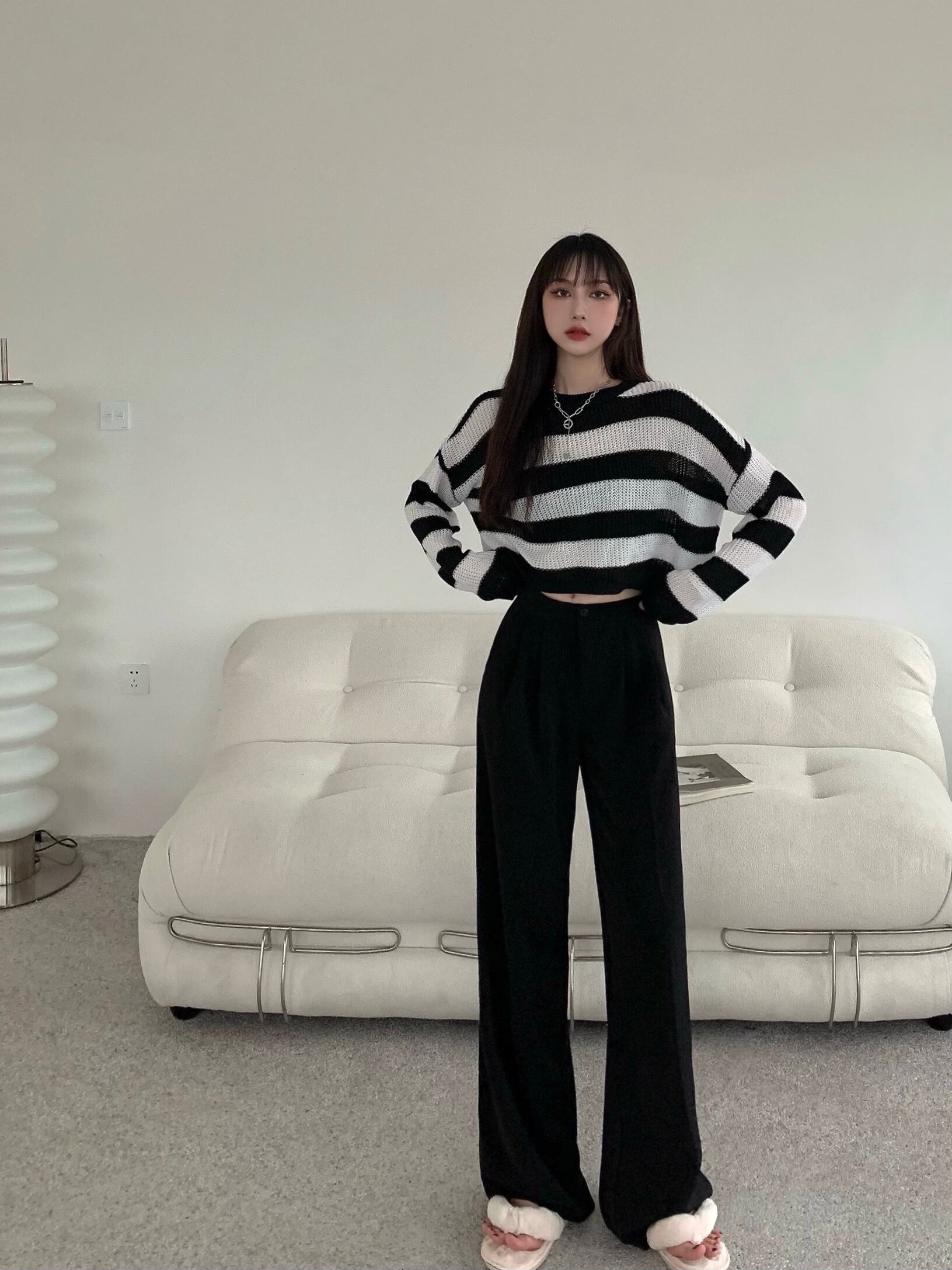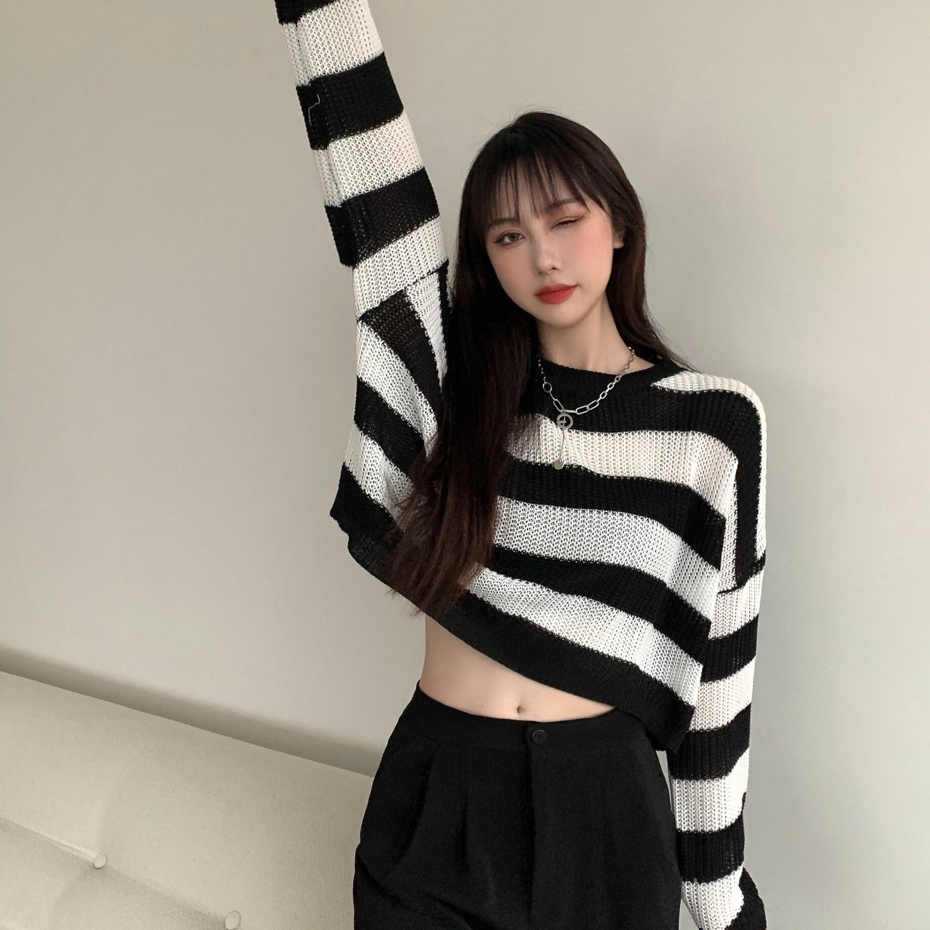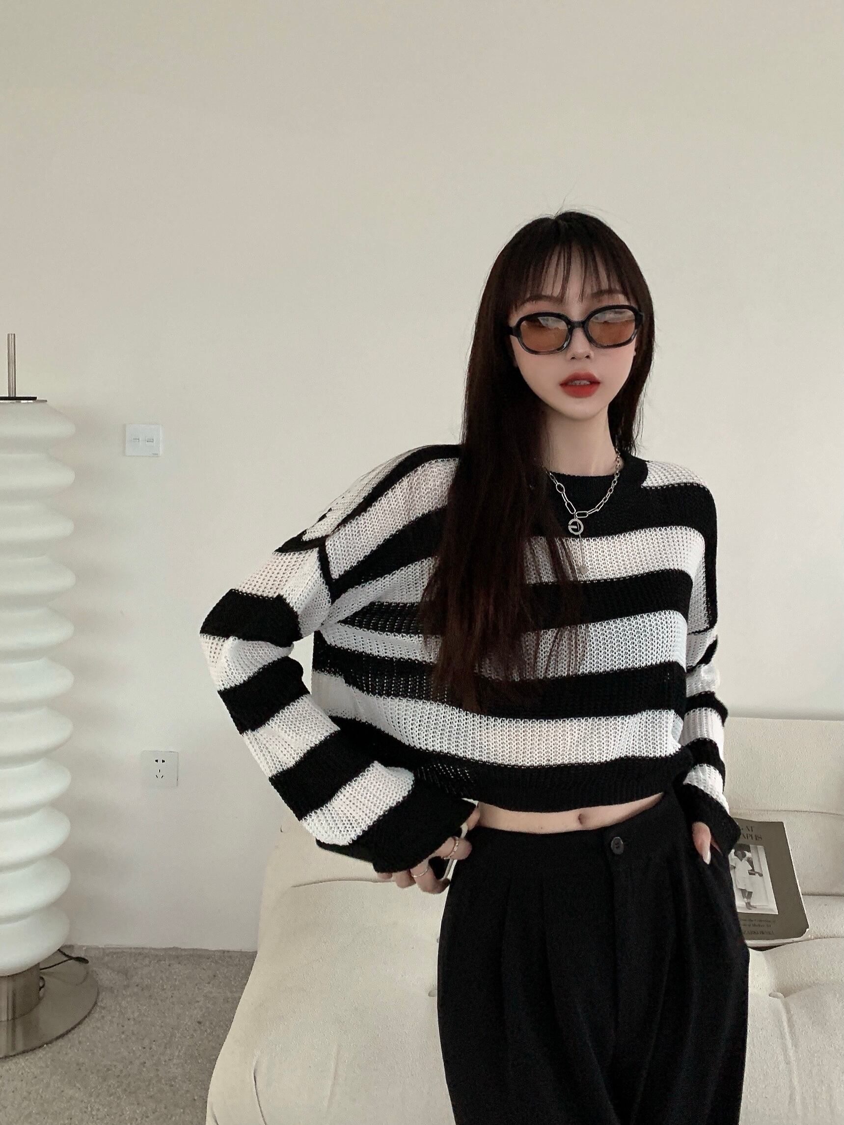 白黒 ストライプ セーター レディース 秋冬 薄手セーター 長袖 ブラウス 洋風 ゆったり ショート ボトムス シャツ トップス トレンド ロング ホワイト ブラック オータム 秋物 ウィンター 冬物 7460084288372664 | framboise21