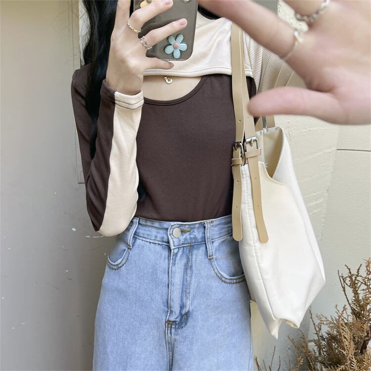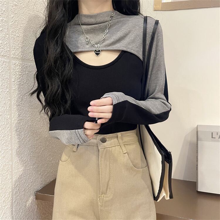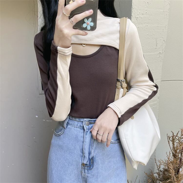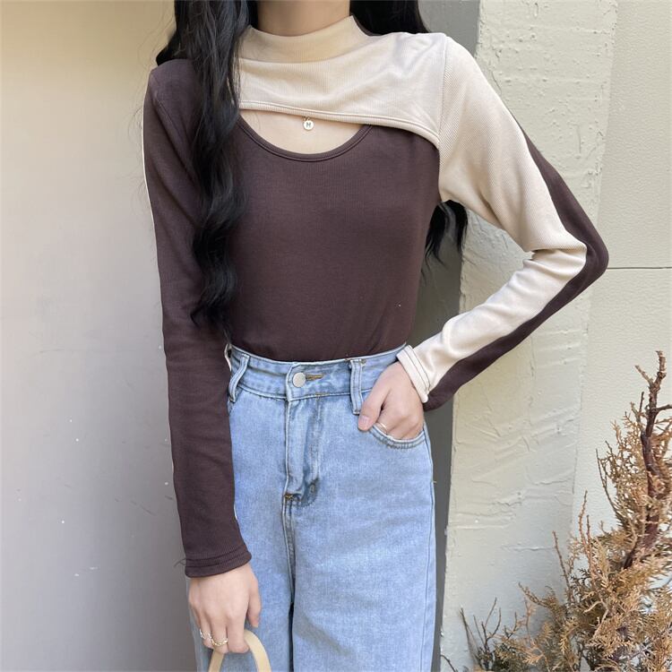 レトロ コントラストカラー ステッチ ハーフ タートルネック トップス レディース 春秋 インナー ボトムス シャツ デザイン ニッチ 長袖 シック Tシャツ ロング スプリング 春物 オータム 秋物 7460035255879522 | framboise21