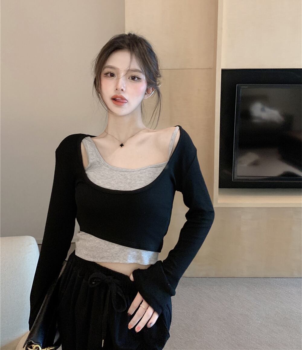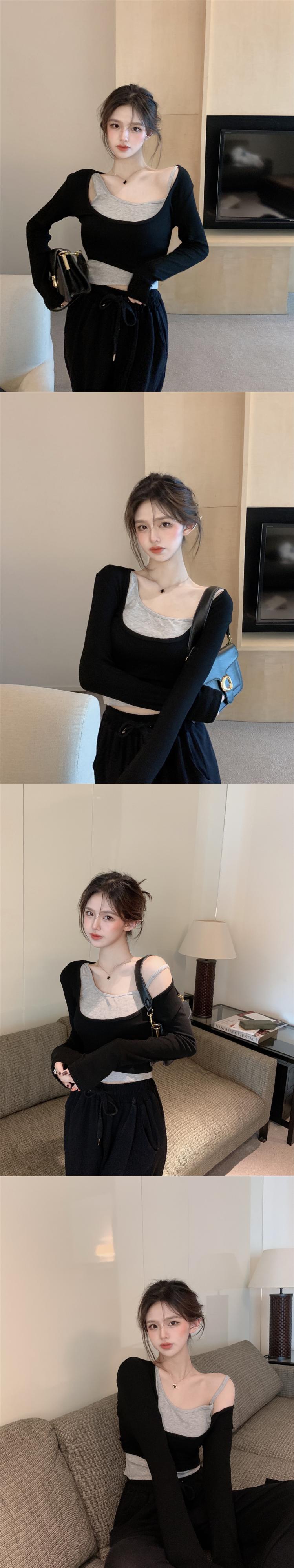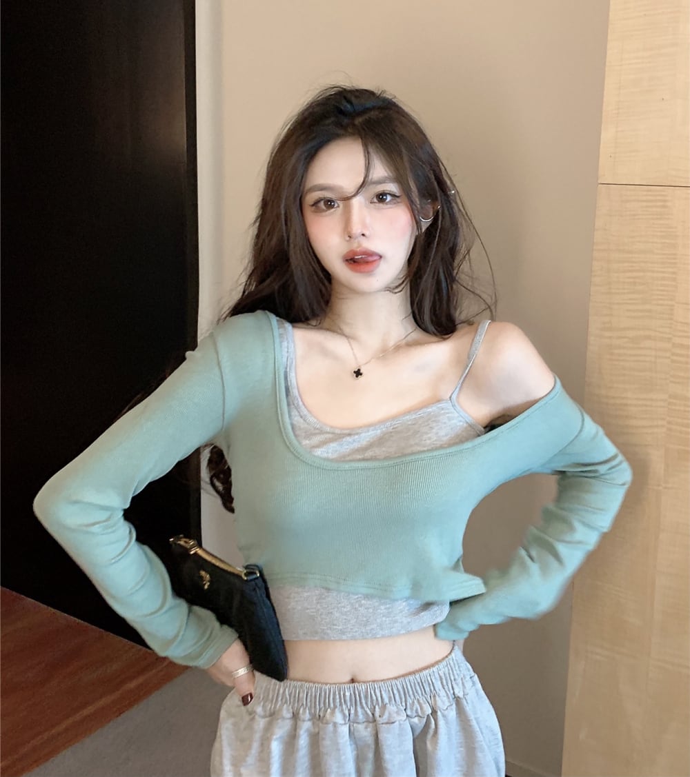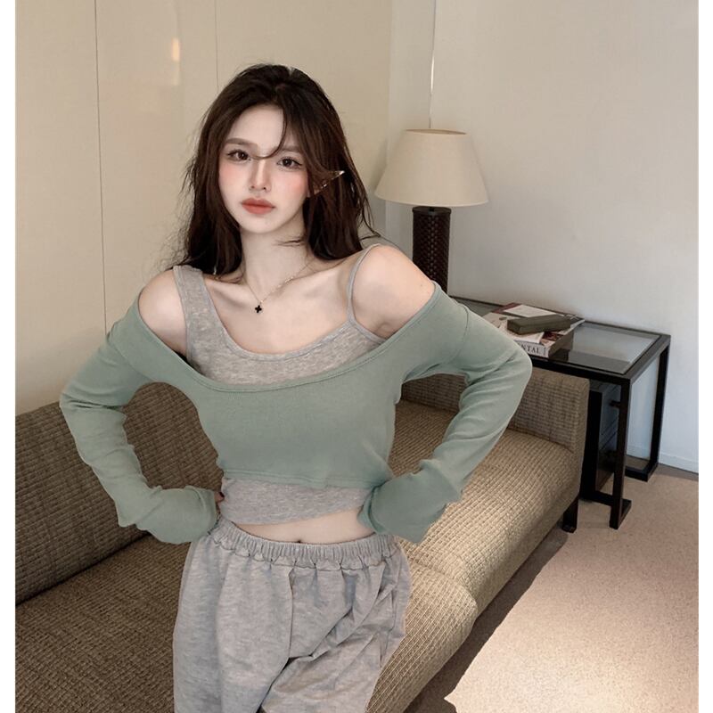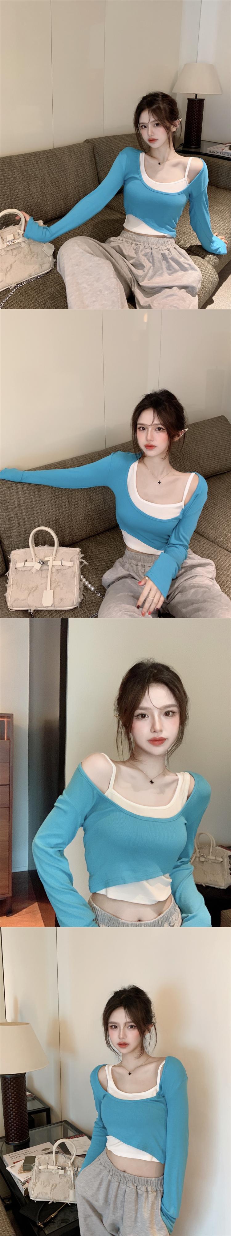 淡いヨーロピアン&アメリカンな雰囲気のデザインニッチな長袖Tシャツ レディース 初秋着 ワンショルダー ジャズ ショートトップス ロング オータム 秋物 7460044586757637 | framboise21