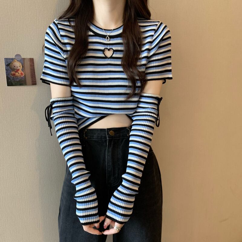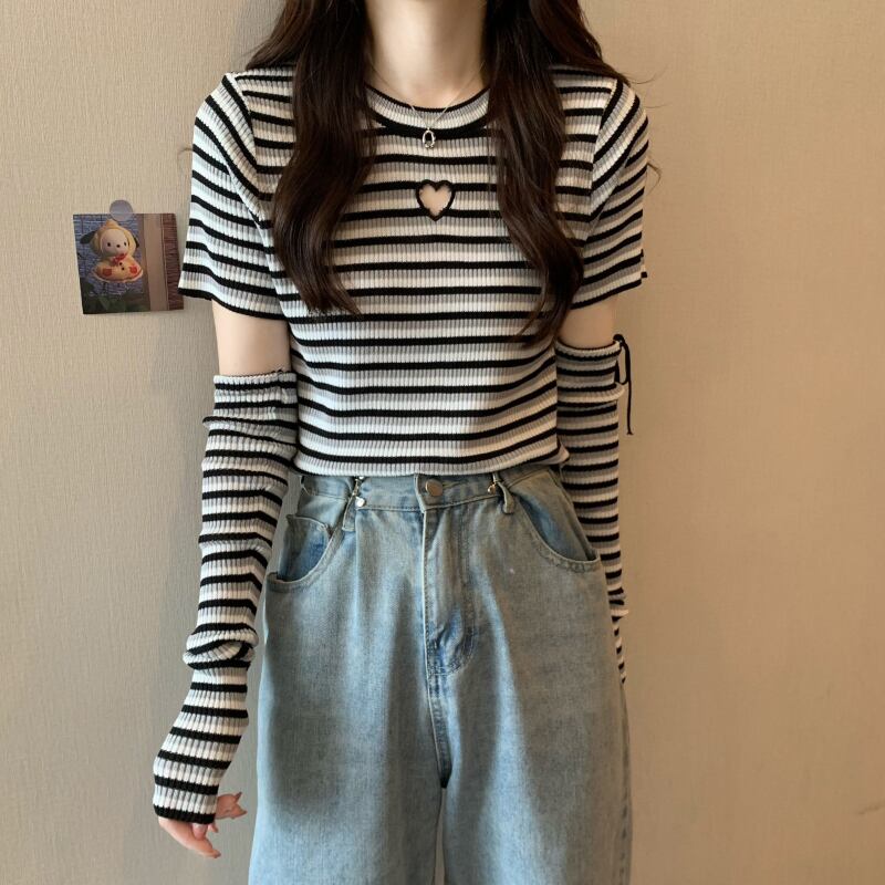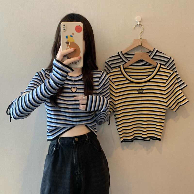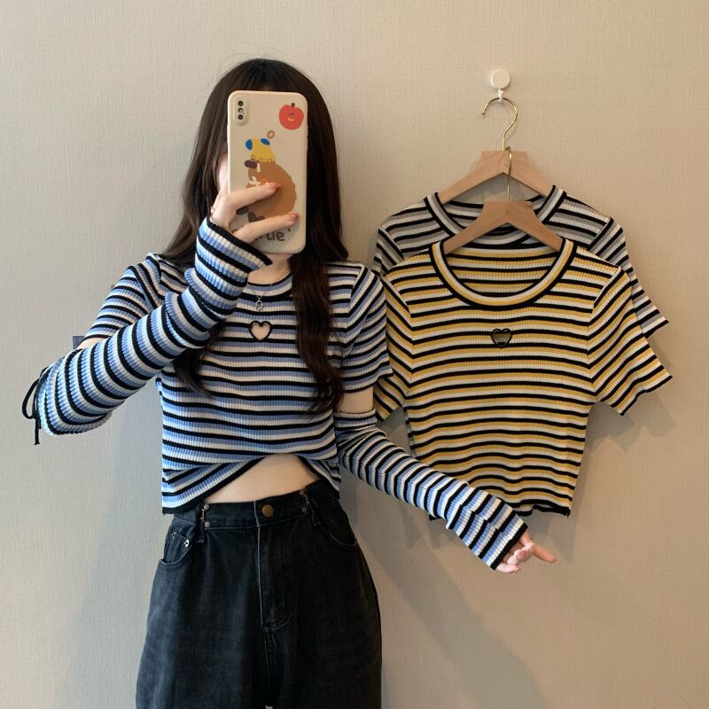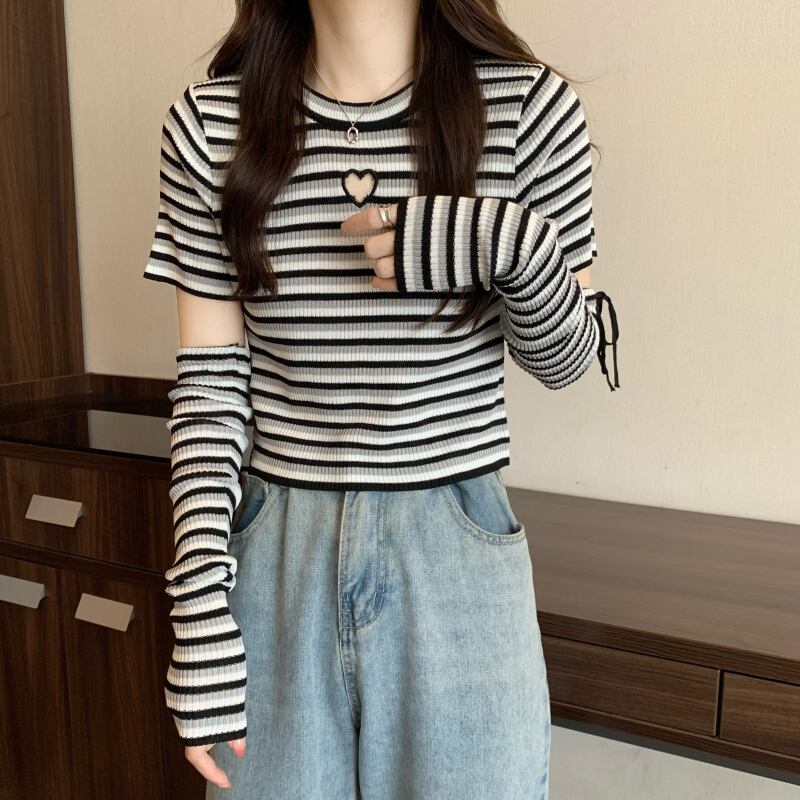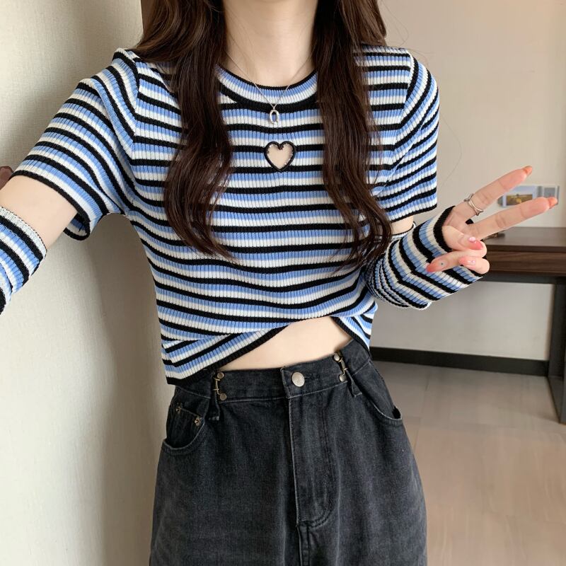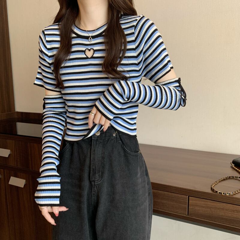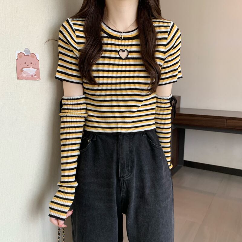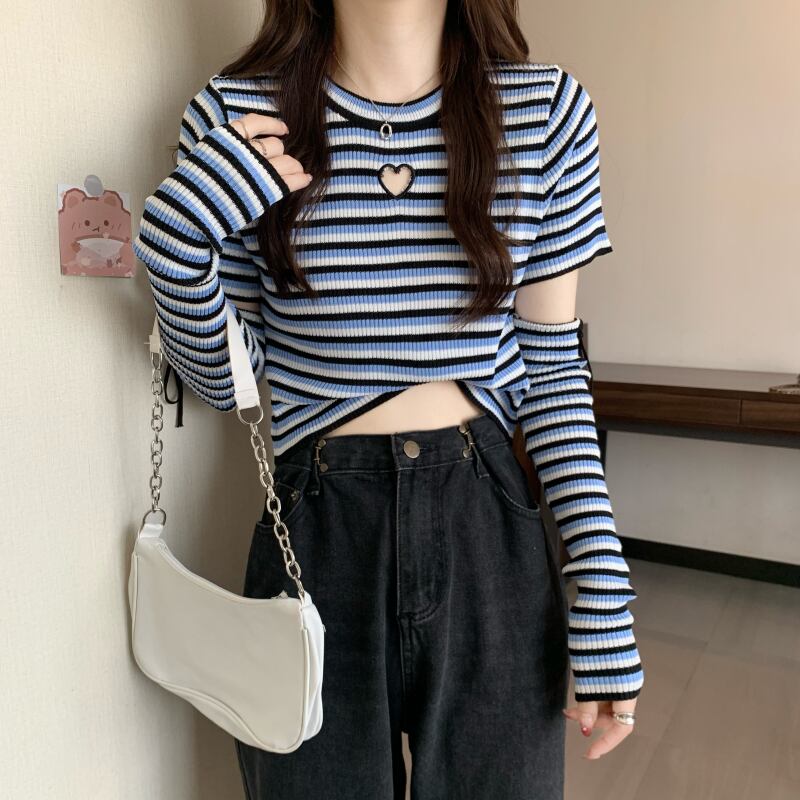 取り外し可能 長袖 ストライプ フロント ショルダー tシャツ レディース 中空 デザイン センス ニッチ スリム 半袖 ニット セーター ショート トップ ロング 7460055876602177 | framboise21