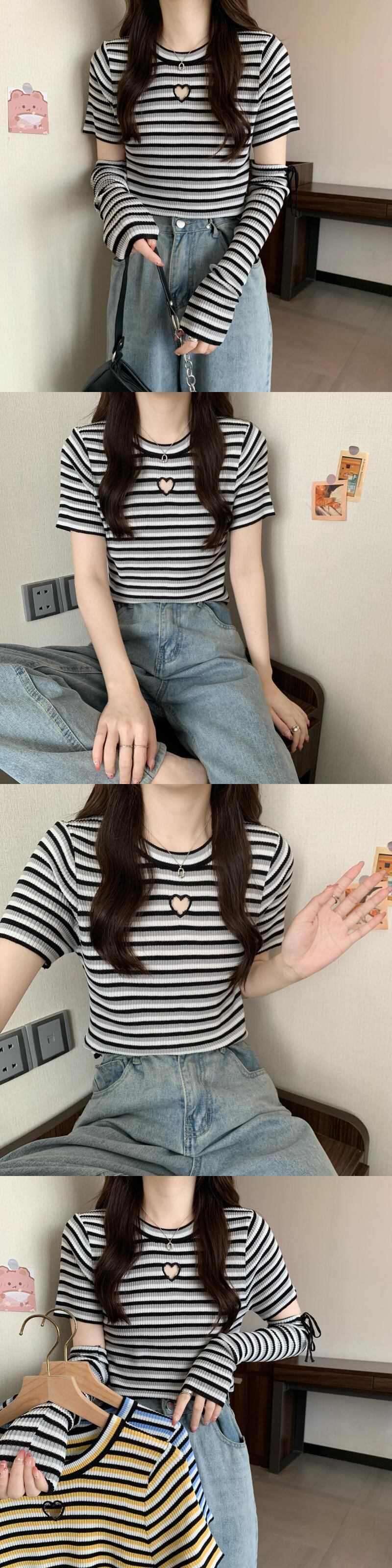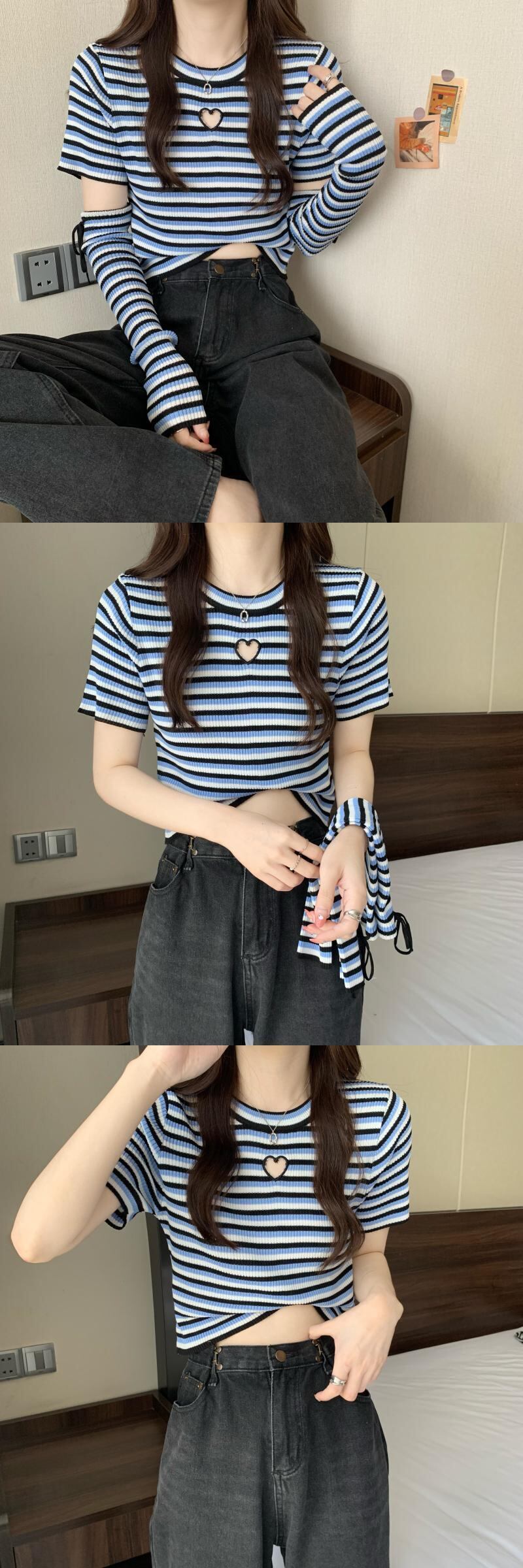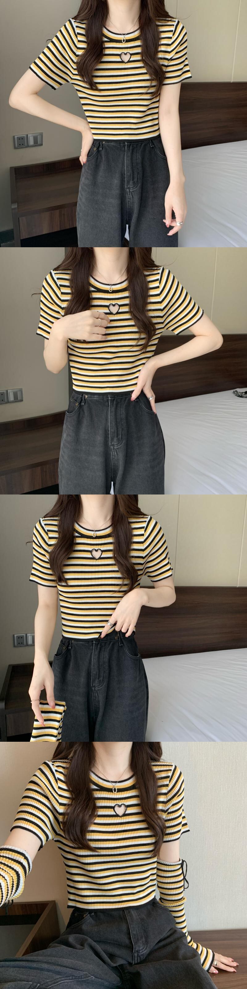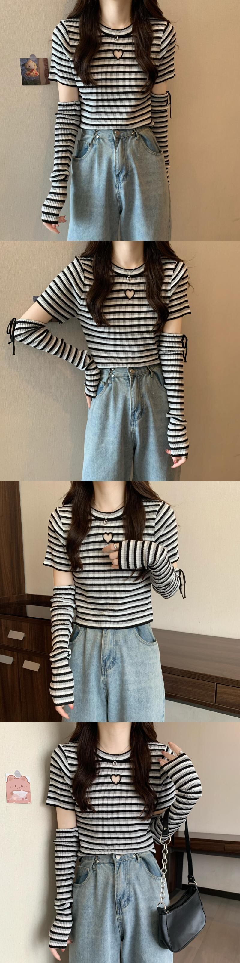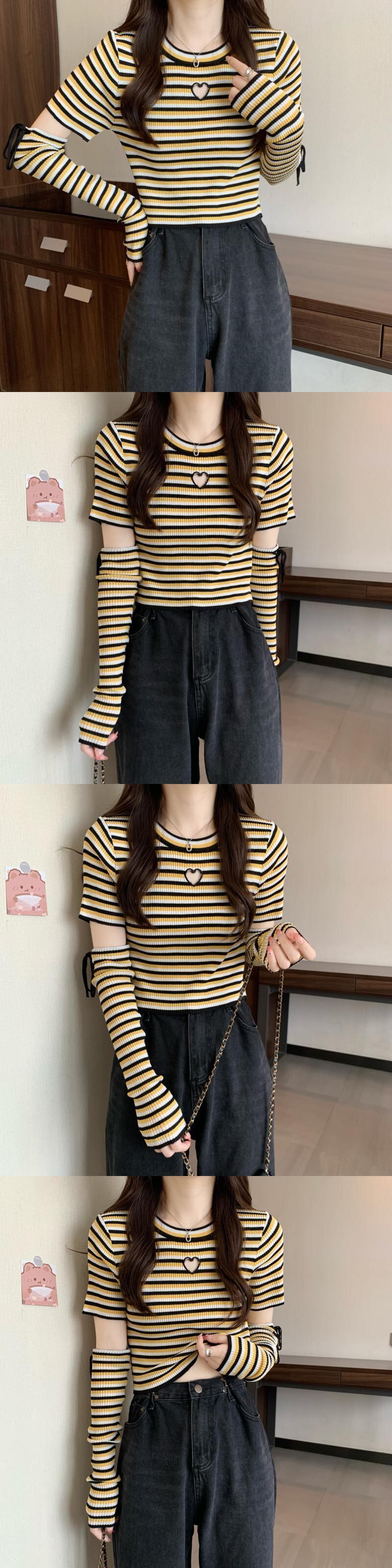 取り外し可能 長袖 ストライプ フロント ショルダー tシャツ レディース 中空 デザイン センス ニッチ スリム 半袖 ニット セーター ショート トップ ロング 7460055876602177 | framboise21