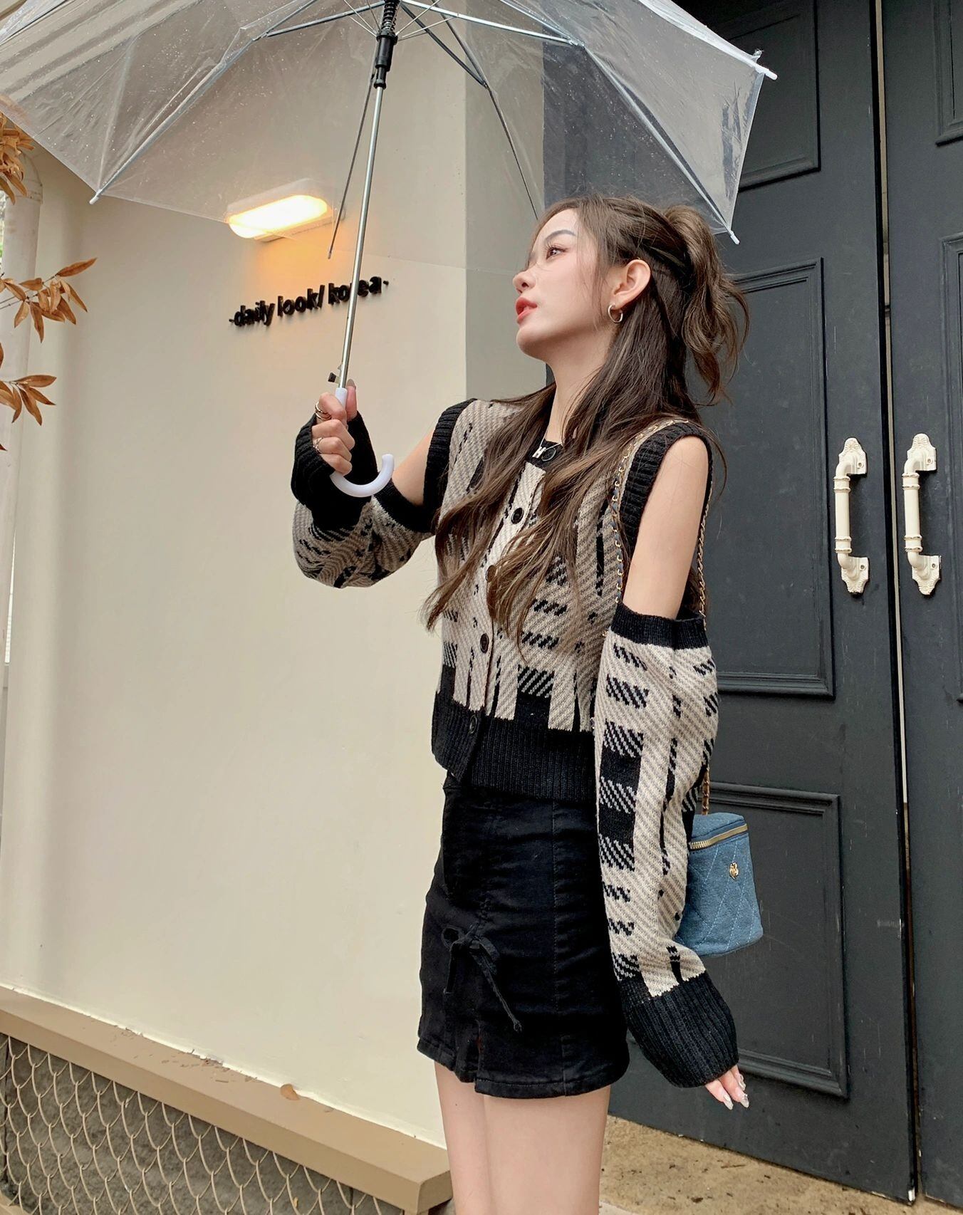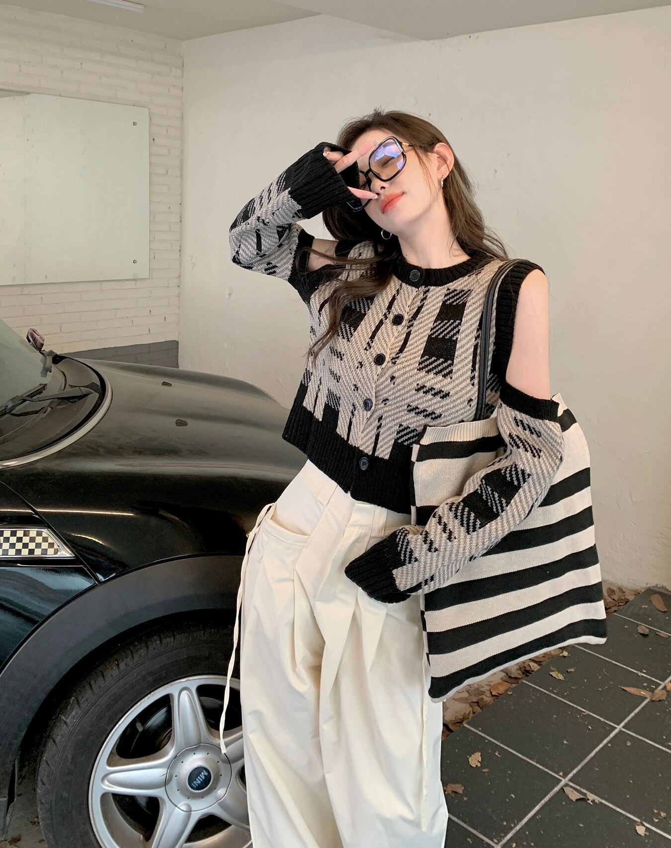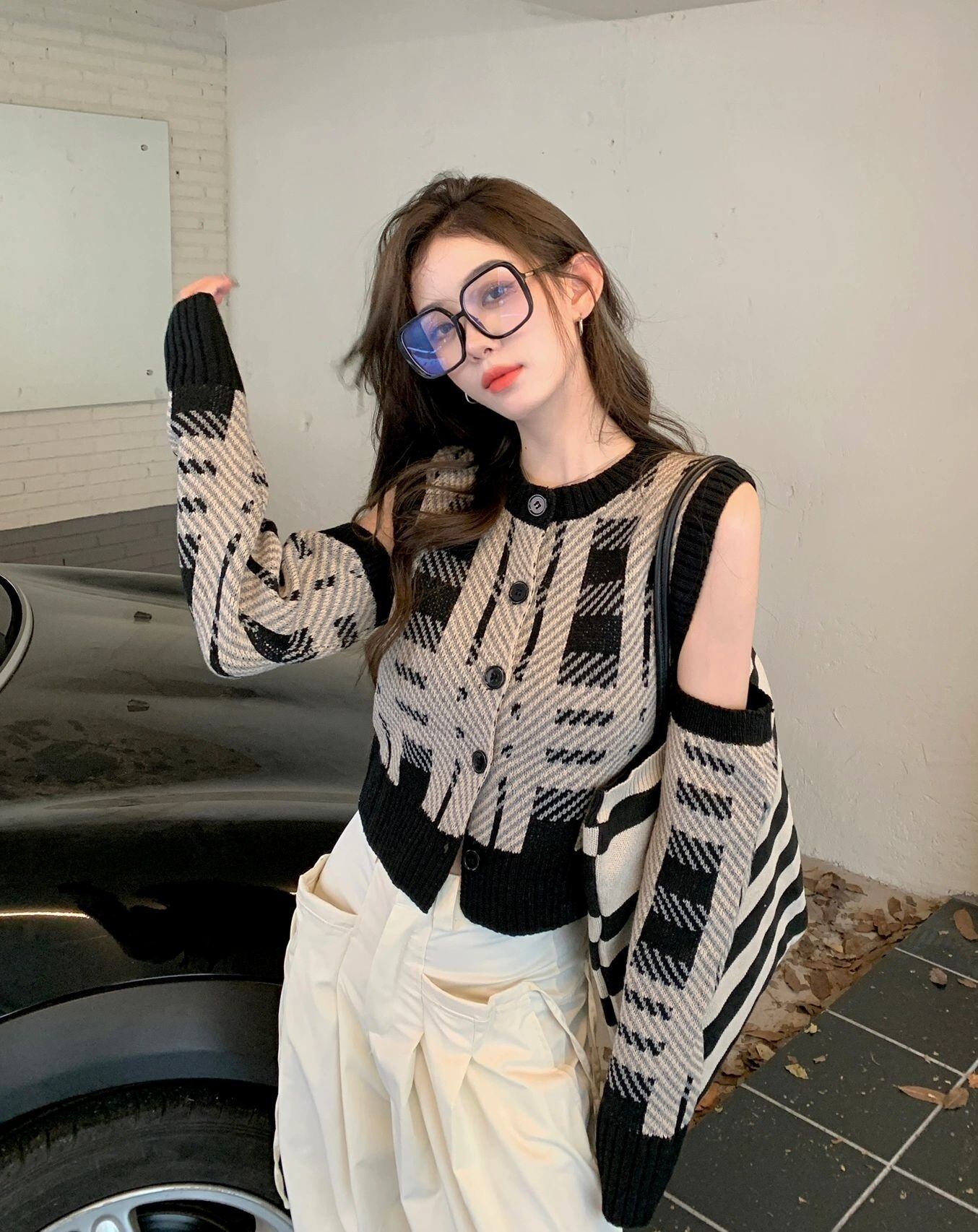 チェック セーター コート レディース 秋冬 ショート ニット カーディガン レトロ アウターウェア イーグル スタイル くりぬいた オフショルダー 長袖 トップス トレンド ロング オータム 秋物 ウィンター 冬物 7460042548831878 | framboise21