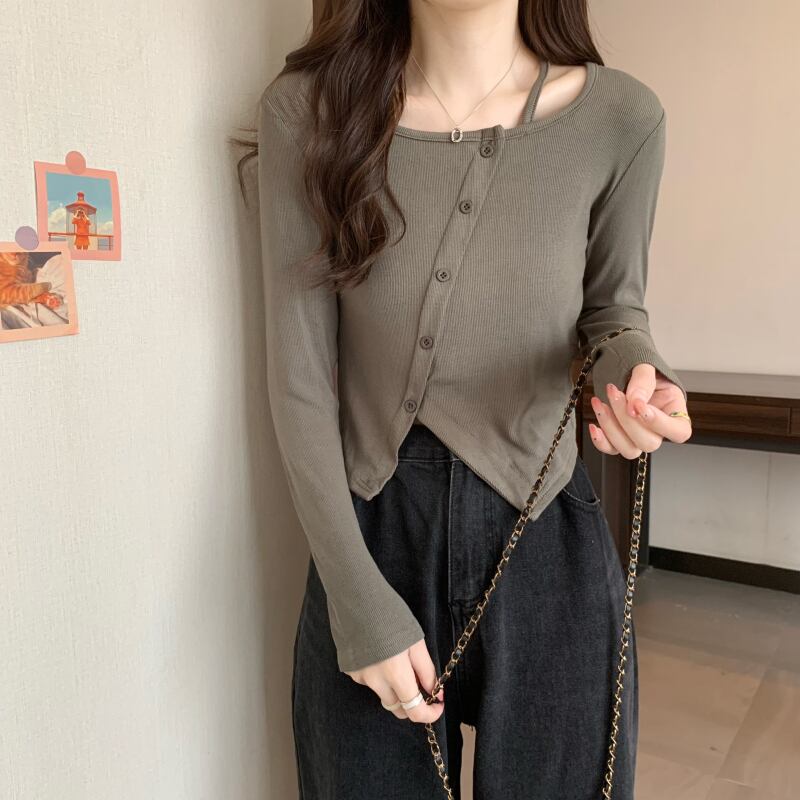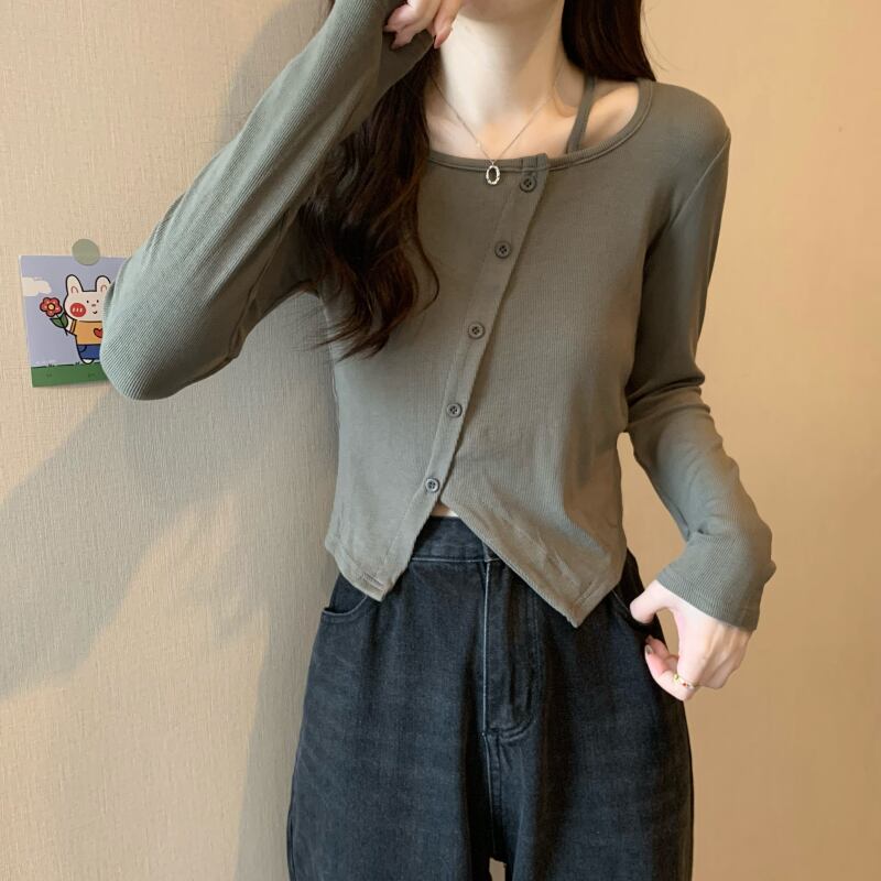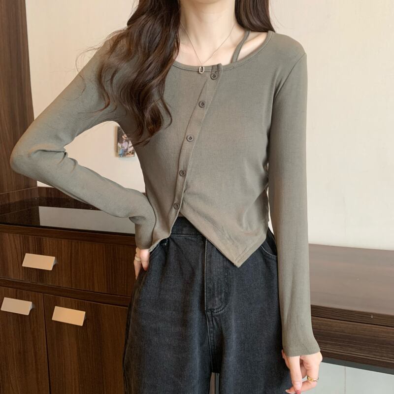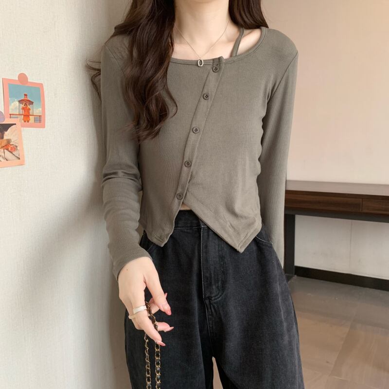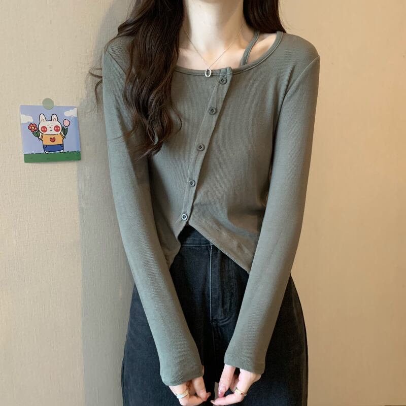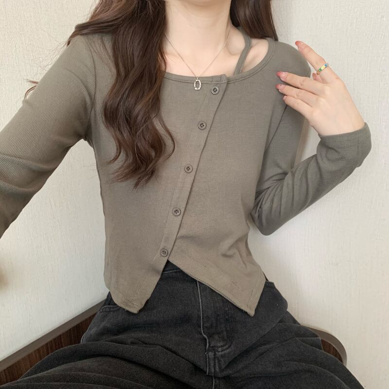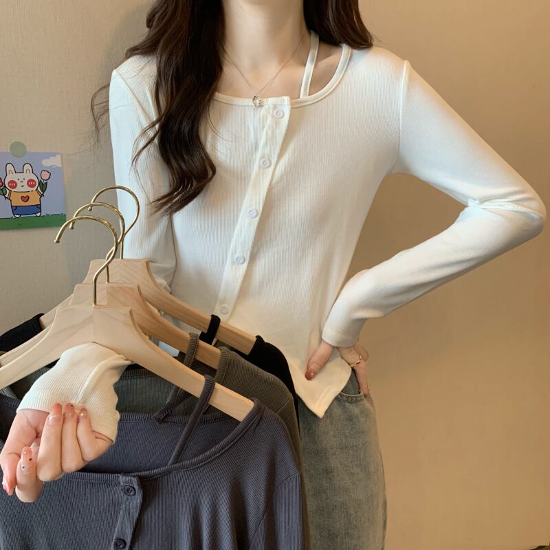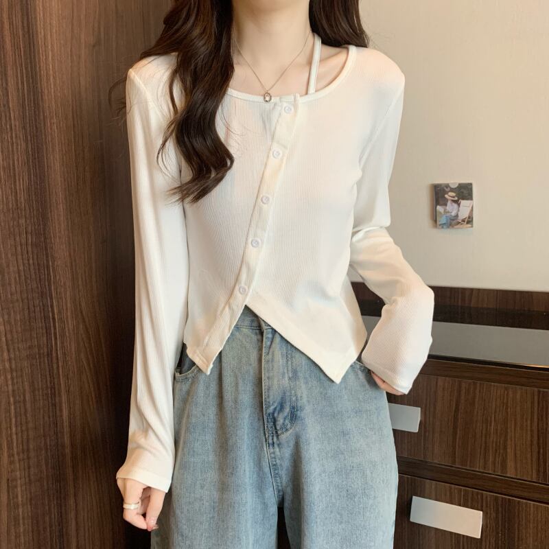 ホワイトスプリットフロントショルダーロングスリーブTシャツイレギュラーピュアホワイトトップレディース秋デザインニッチピュアコットンボトムスシャツ オータム 秋物 7460075762468449 | framboise21