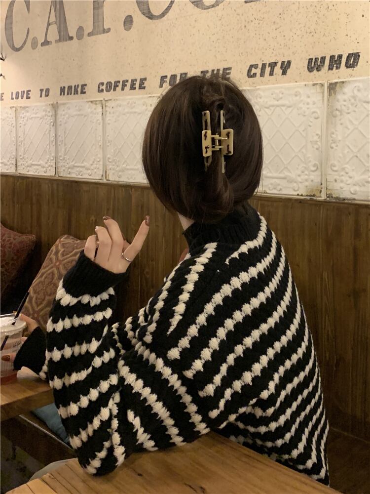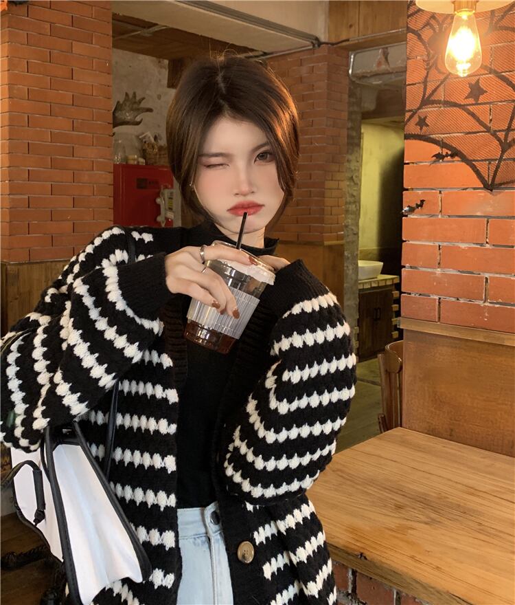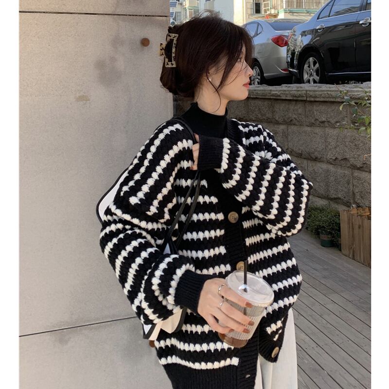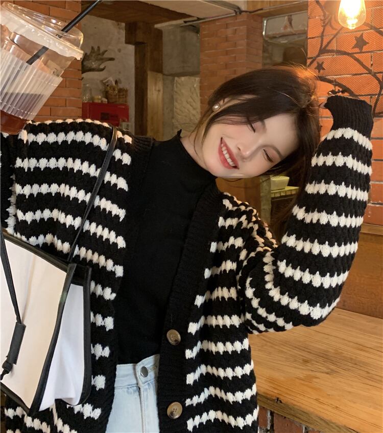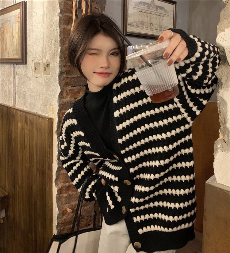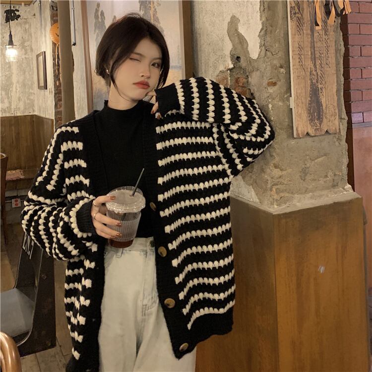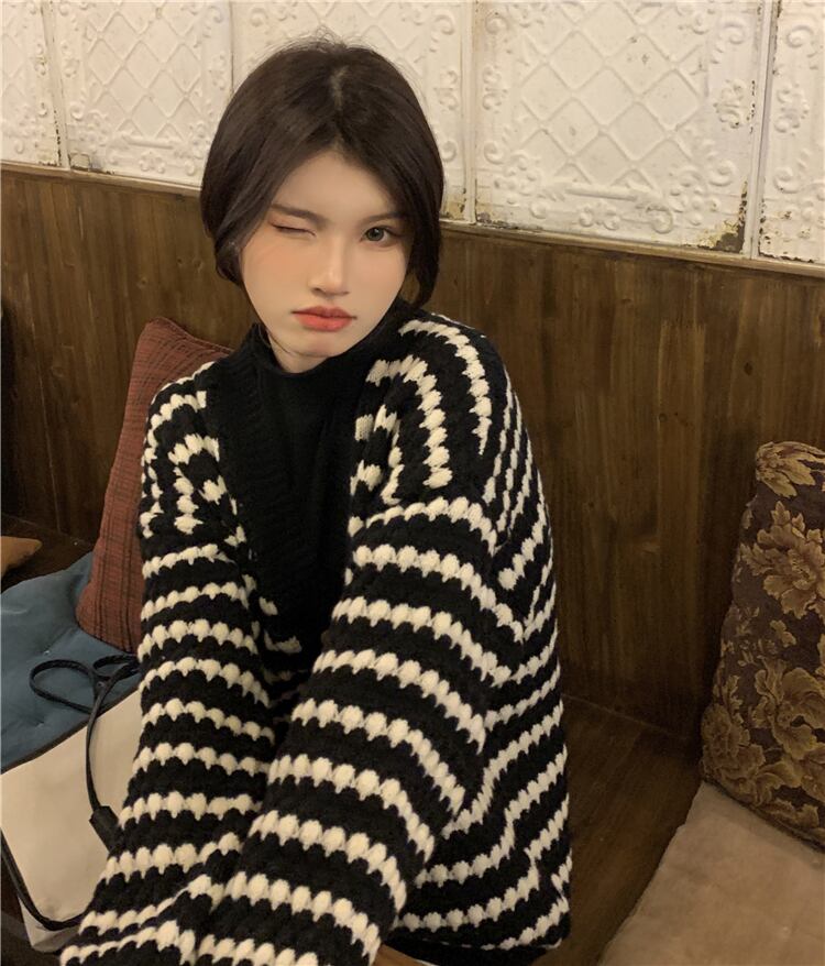 Xiaoxiangfeng ニットカーディガン秋 2022 新しいスタイルの外でシックな怠惰なストライプ V ネック肥厚セーターコート女性 オータム 秋物 Vネック 7460027566251014 | framboise21