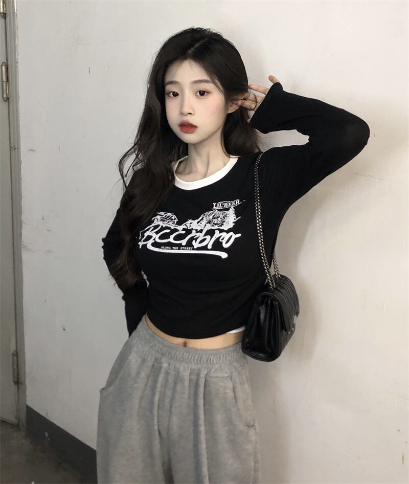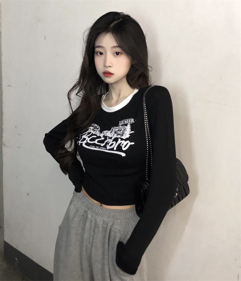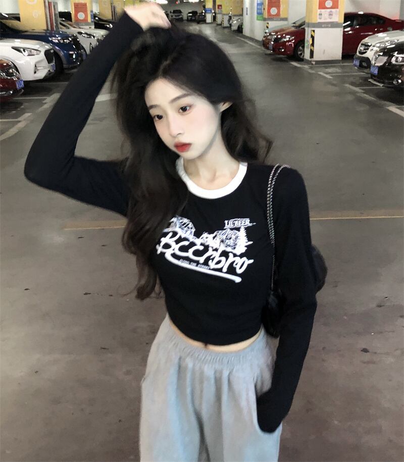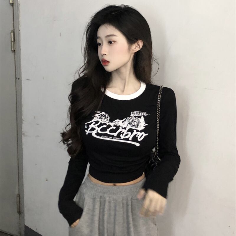 フロントショルダーロングスリーブトップ女性の秋ホットガールショート Tシャツシックなセンスシンナータイト底入れシャツイン 長袖 オータム 秋物 7460078015148634 | framboise21