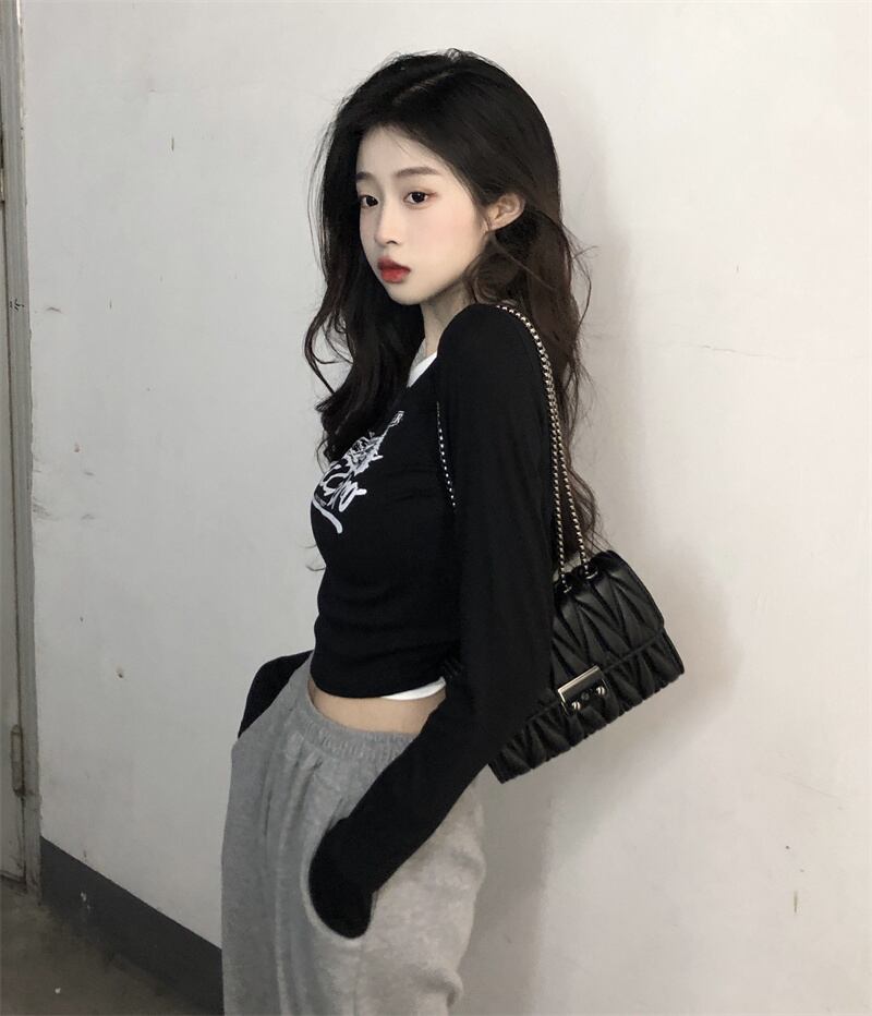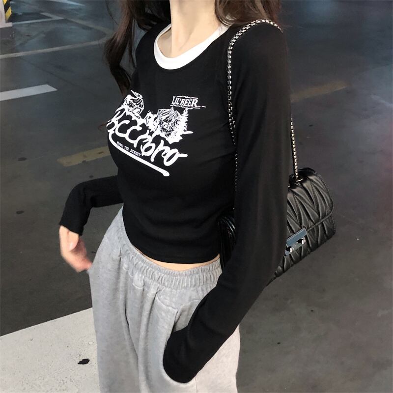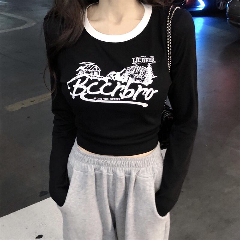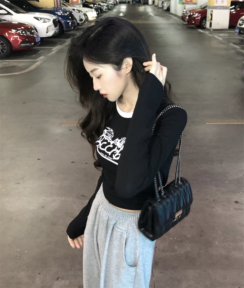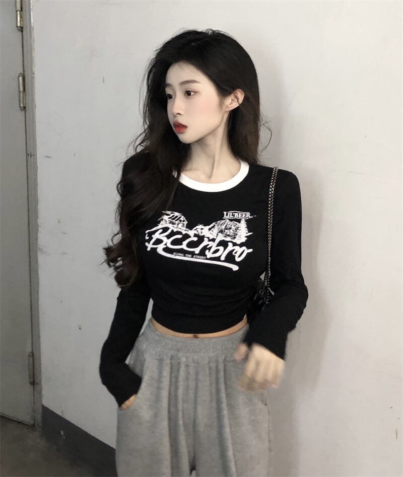 フロントショルダーロングスリーブトップ女性の秋ホットガールショート Tシャツシックなセンスシンナータイト底入れシャツイン 長袖 オータム 秋物 7460078015148634 | framboise21