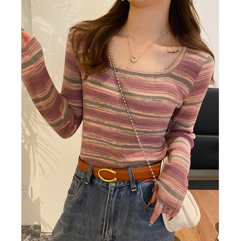 カラフル ストライプ ニット セーター レディース 秋冬 スクエアネック セーター 洋風 オールマッチ スリム スリム 長袖 ボトムス トップス ロング オータム 秋物 ウィンター 冬物 スクウェア 7460024491308406 | framboise21