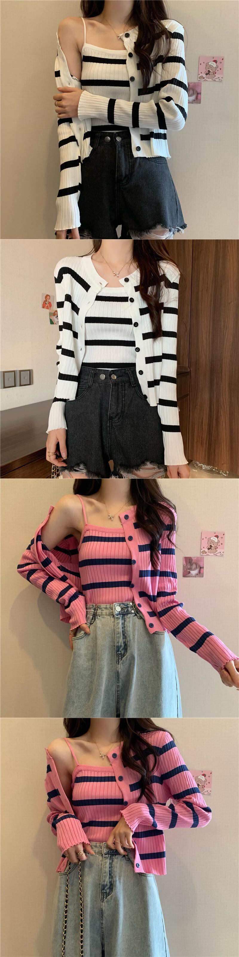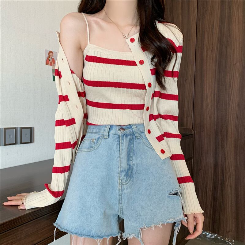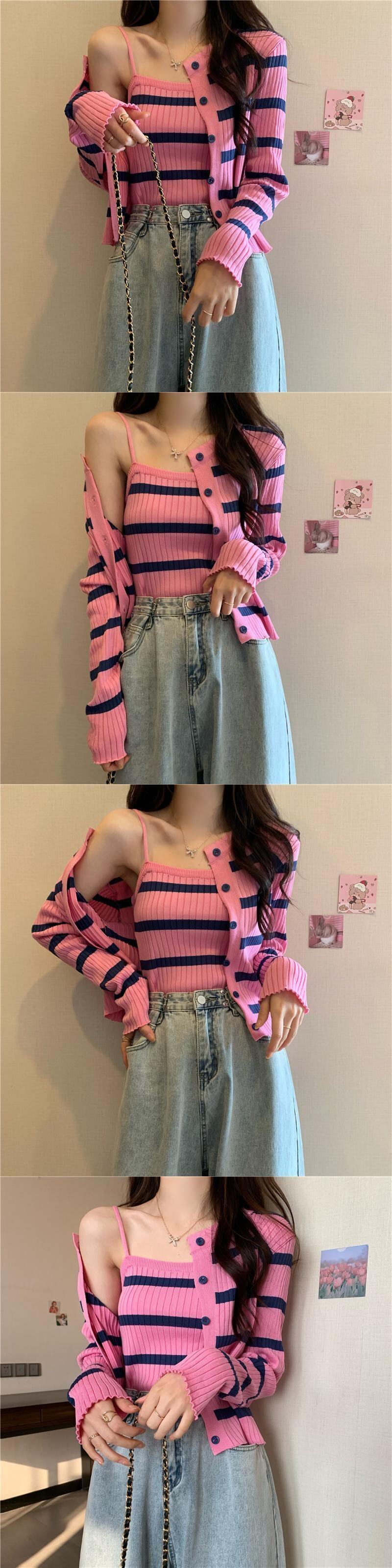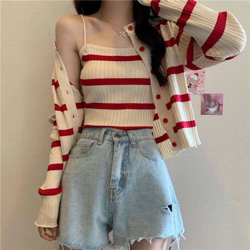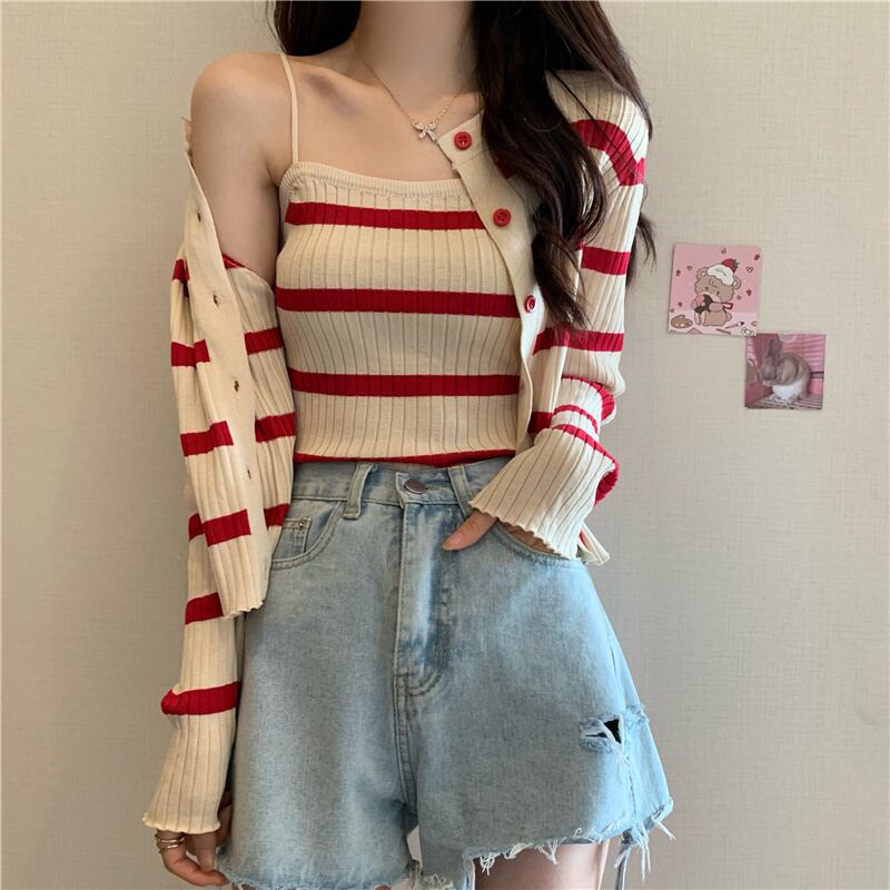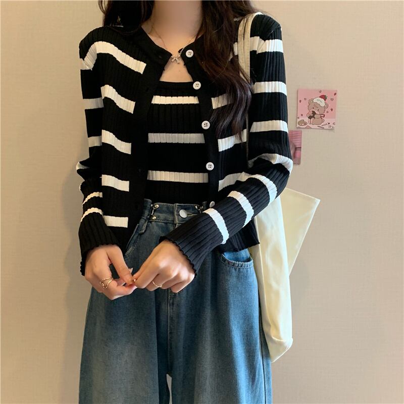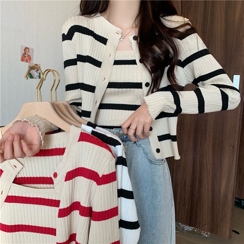 秋の新作長袖ニットカーディガンの女装ジャケットのデザインは、縞模様のキャミソールのツーピースの潮流の小グループです。 ロング オータム 秋物 ストライプ 746009732811967 | framboise21