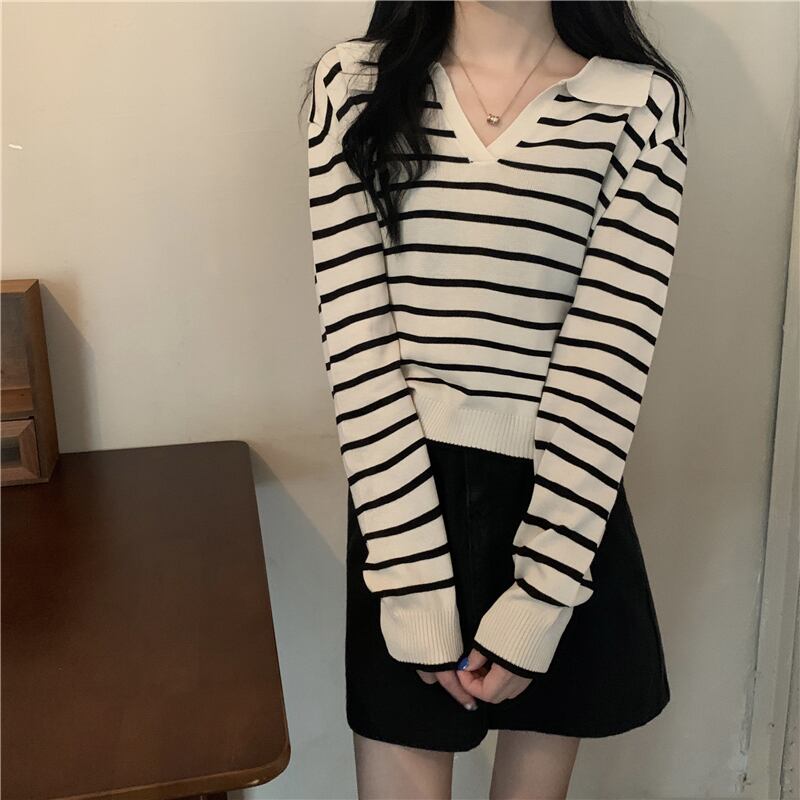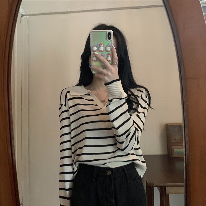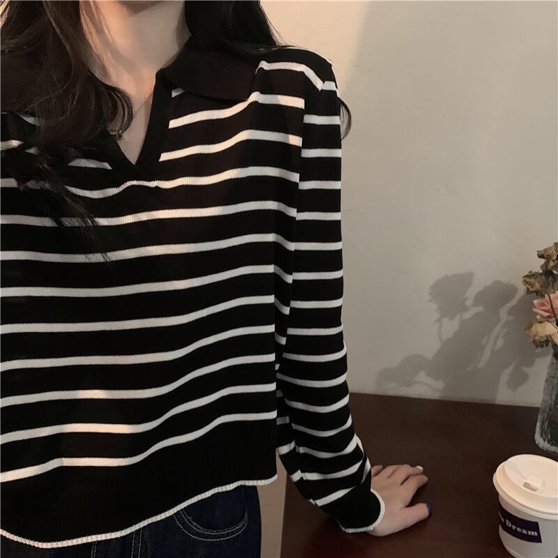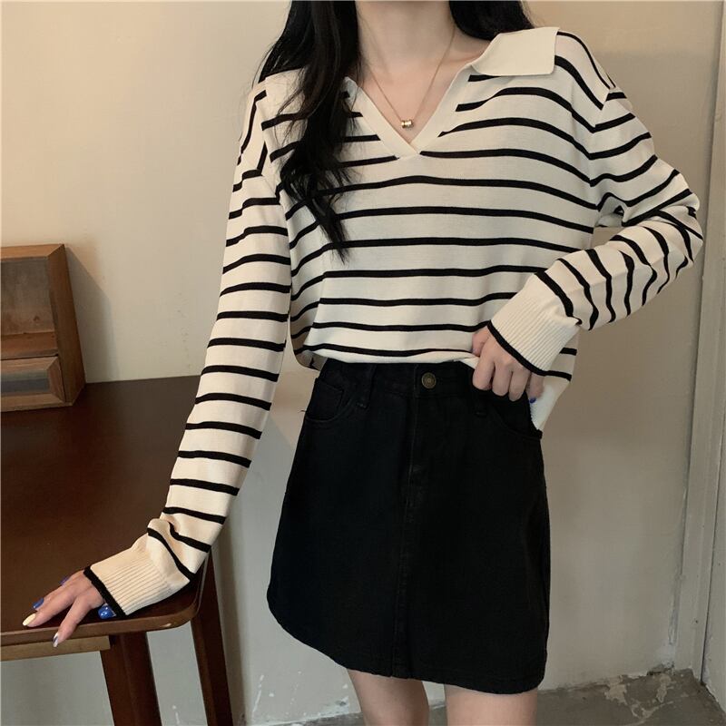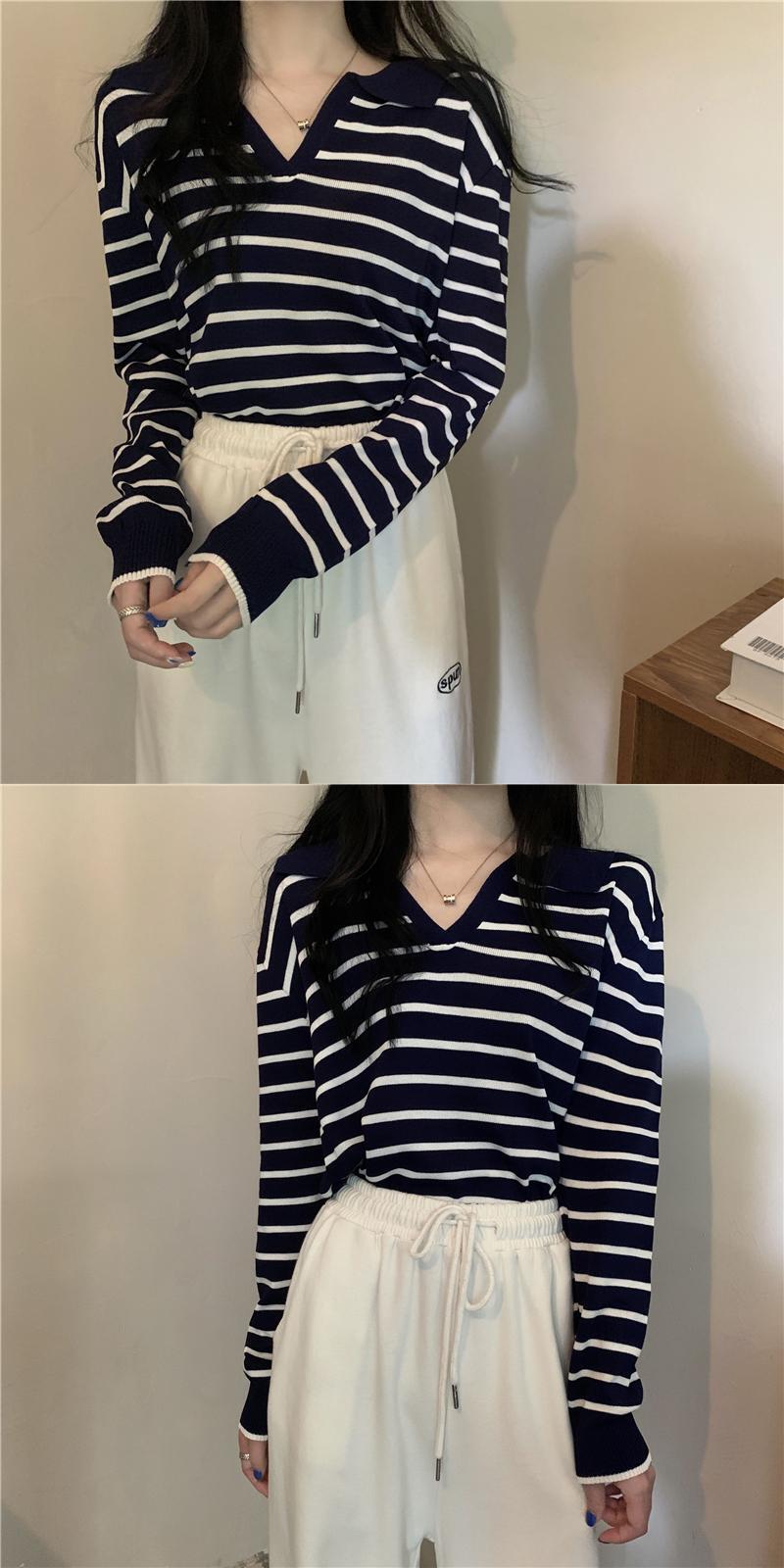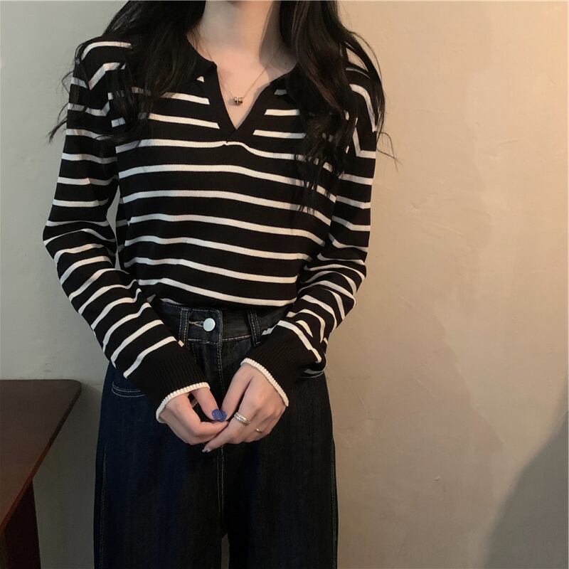初秋冬新作 ストライプ ポロ衿 ニット ボトムス シャツ レディース エインスタイル 薄手 インナー セーター 長袖 Tシャツ トップス ロング オータム 秋物 ウィンター 冬物 7460027280750347 | framboise21