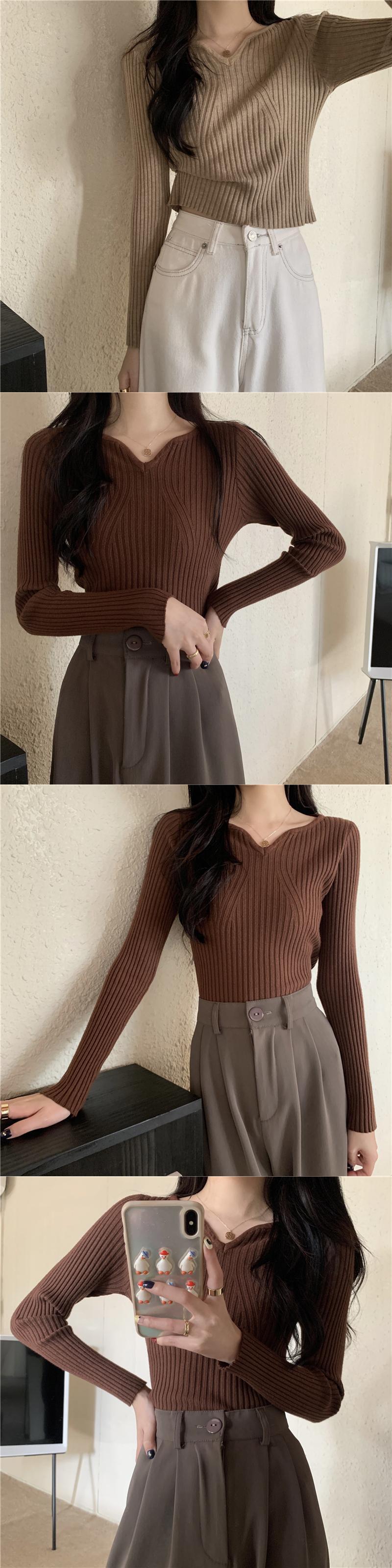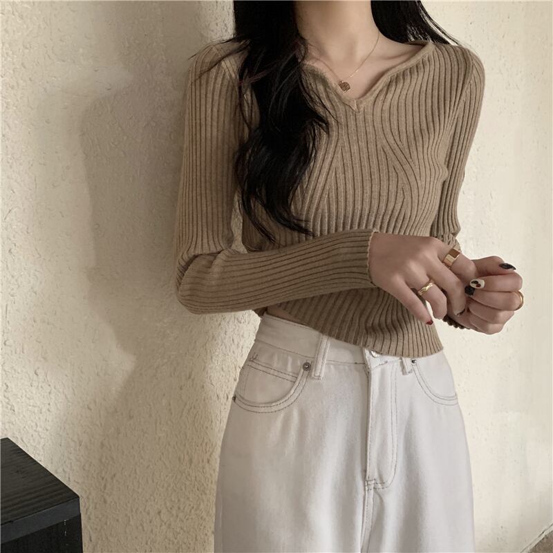 Vネックボトムスシャツレディース秋冬eignスタイルハイエンド自己修養ショートピットストリップセーター長袖ニットトップブラック ロング オータム 秋物 ウィンター 冬物 7460047987352227 | framboise21