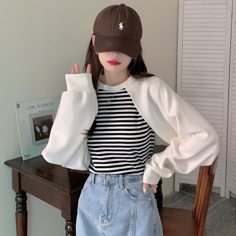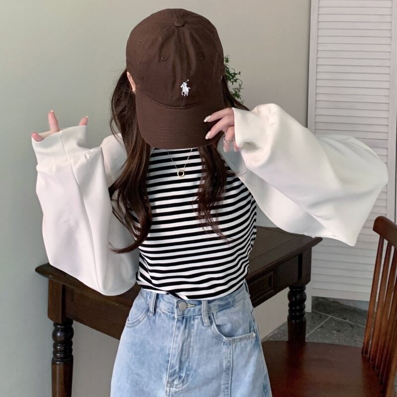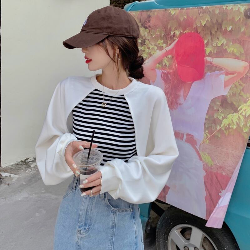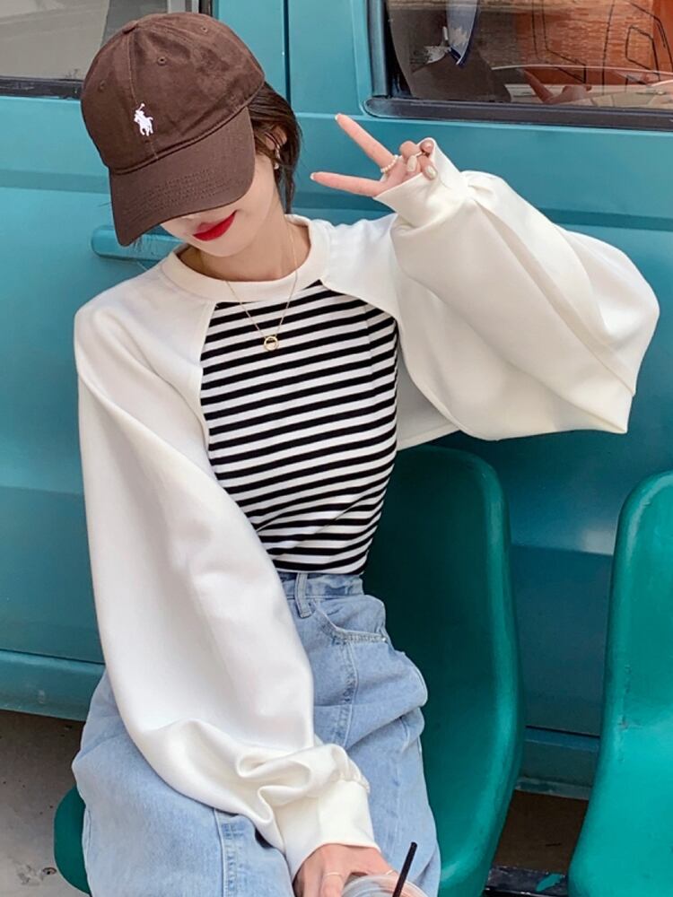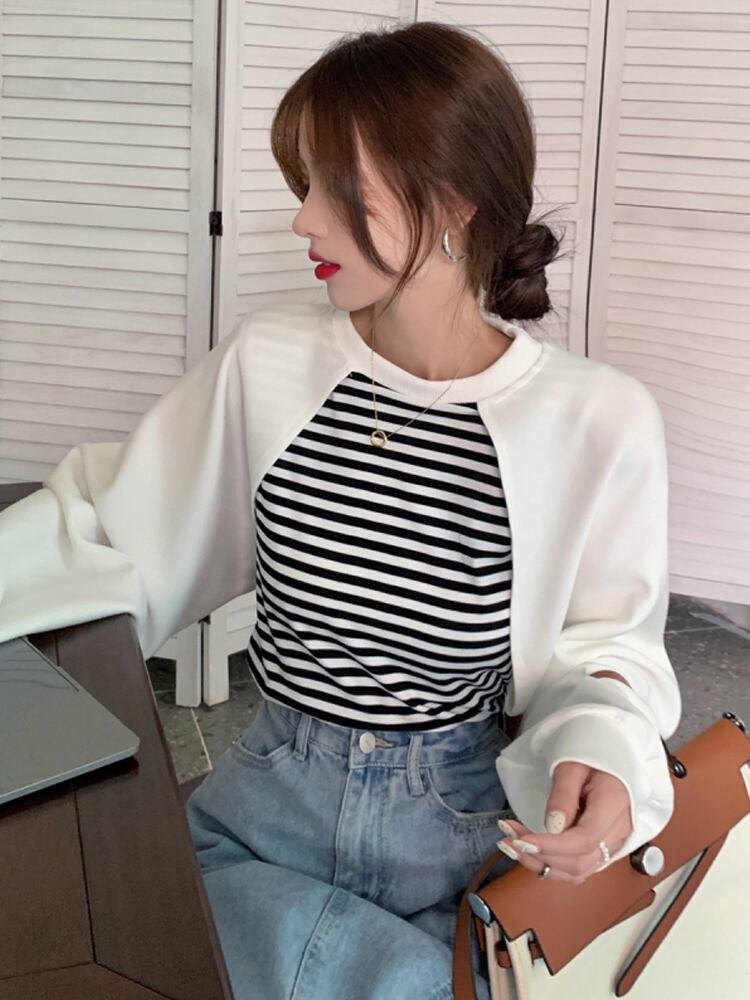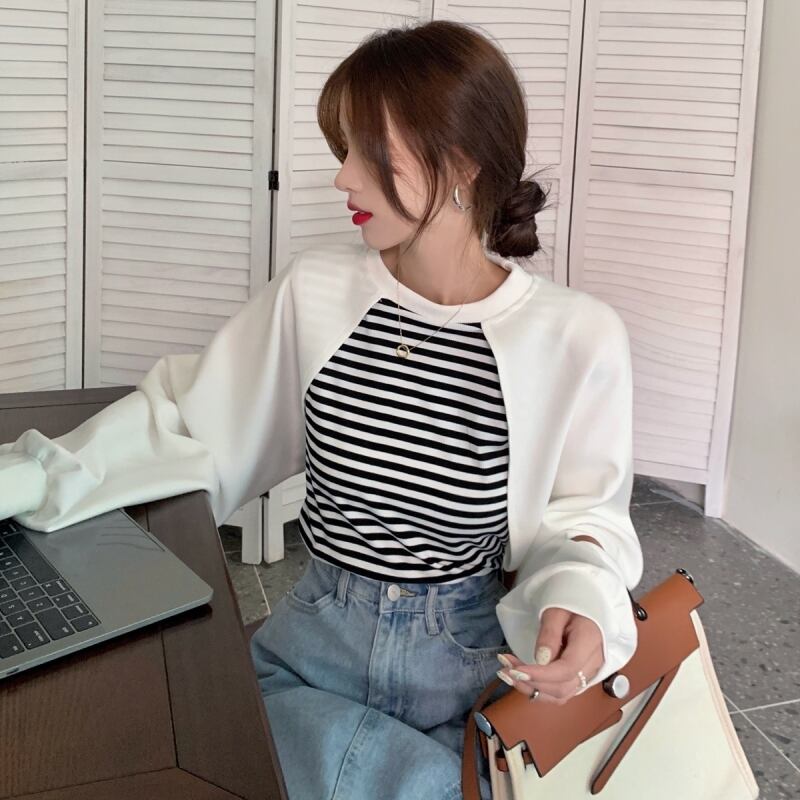 ホワイトストライプシャツレディース春秋フェイクツーピース長袖トップデザインシックファッションスリムショートTシャツ ロング スプリング 春物 オータム 秋物 7460084886224013 | framboise21