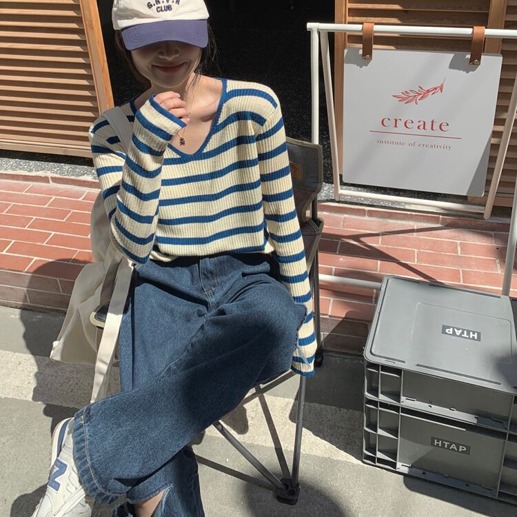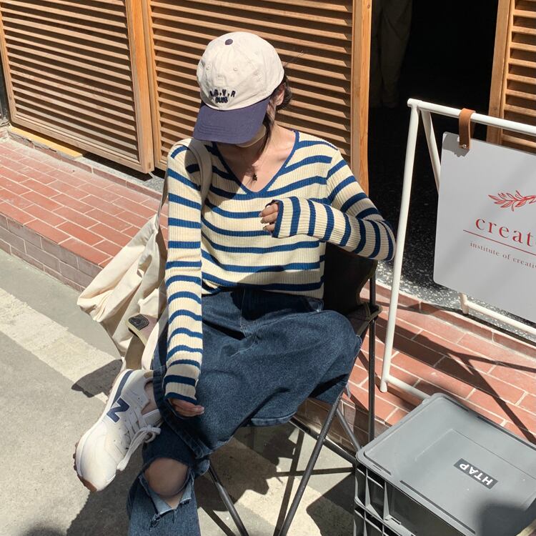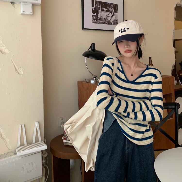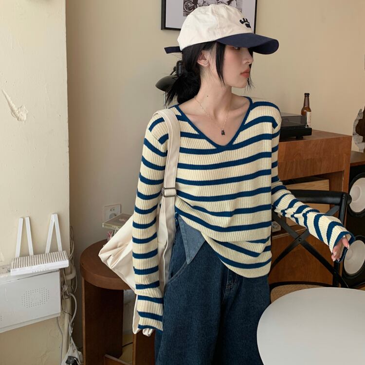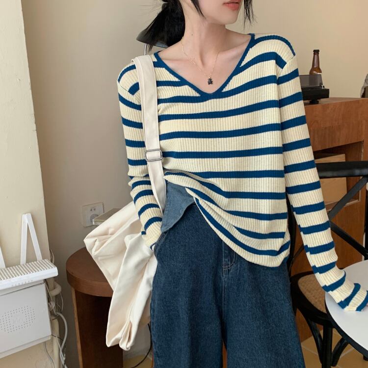 2022 秋の新作 v ネックストライプニット底入れシャツ女性の洋風デザインスリムフィット長袖トップトレンディ ロング オータム 秋物 Vネック 7460060041126346 | framboise21