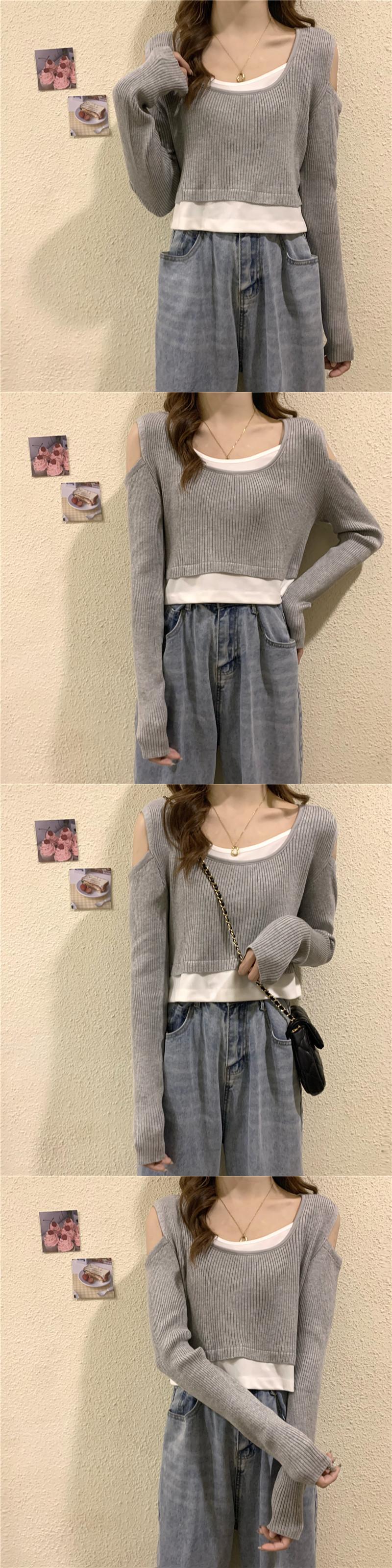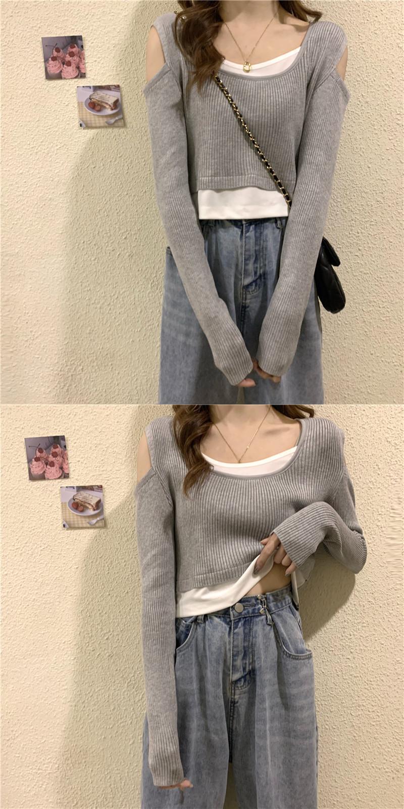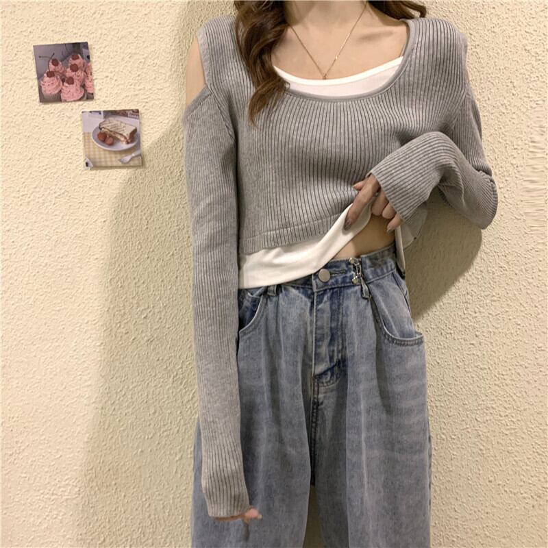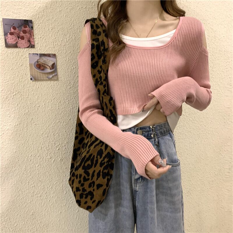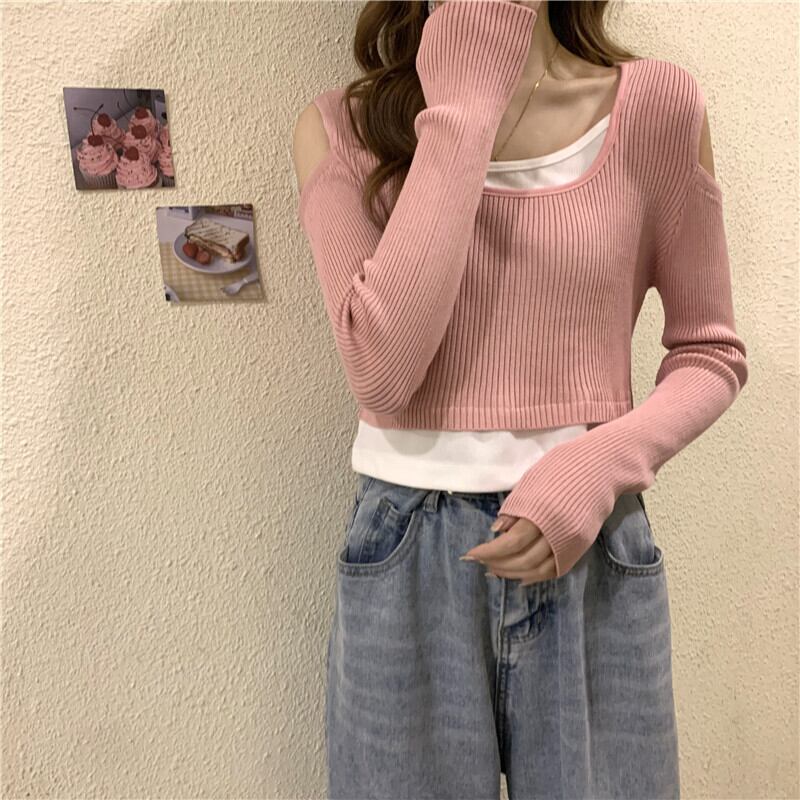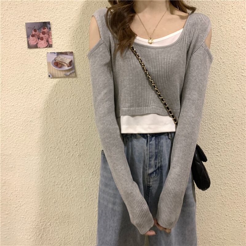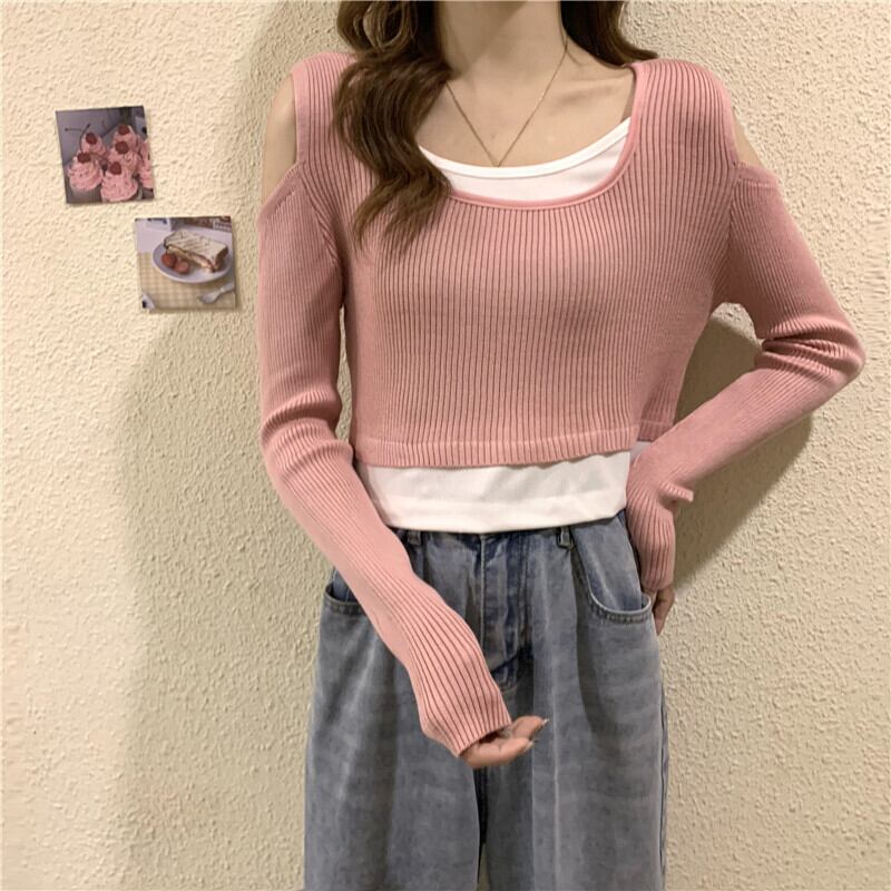 オフショルダー フェイクツーピース 長袖 Tシャツ レディース 2022年春秋新作 ニットセーター ハイウエストパンツ ショートシック トップス トレンド ロング スプリング 春物 オータム 秋物 7460091063512980 | framboise21