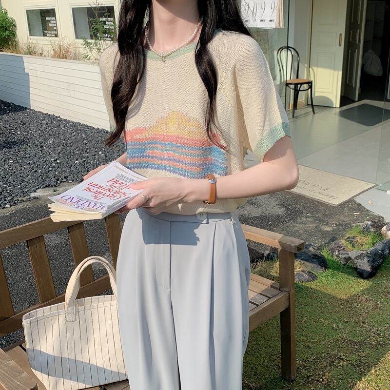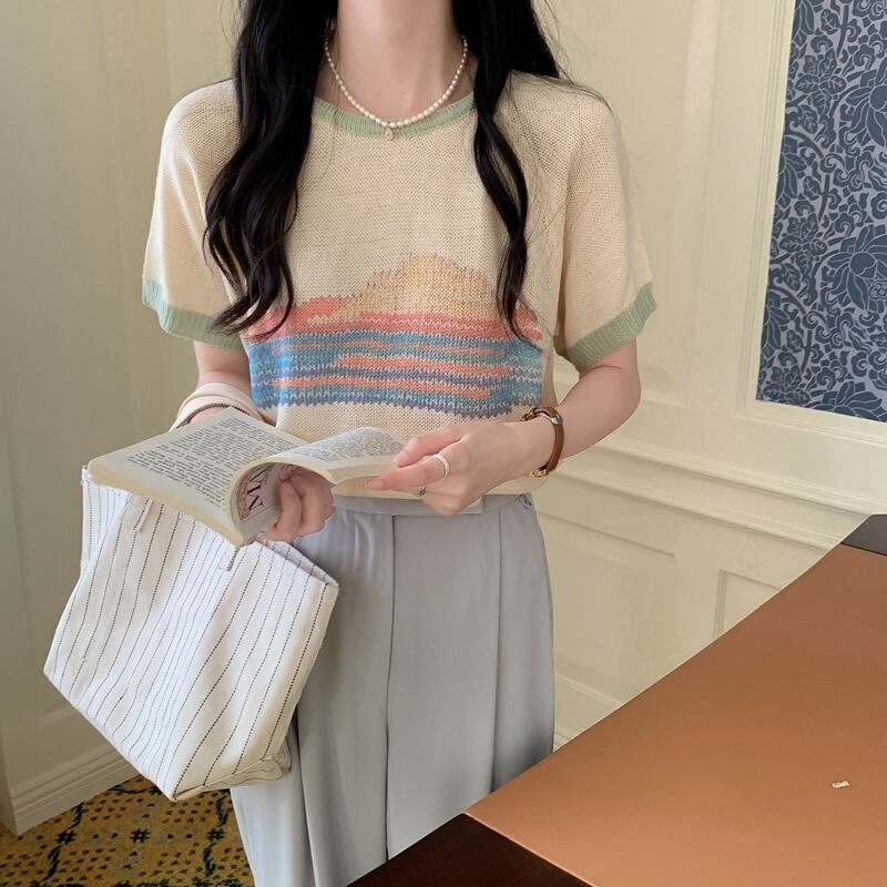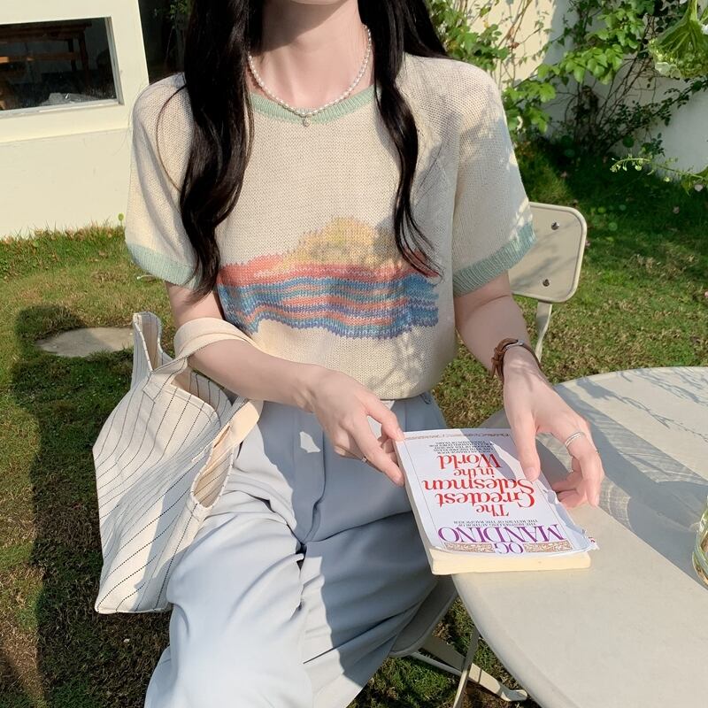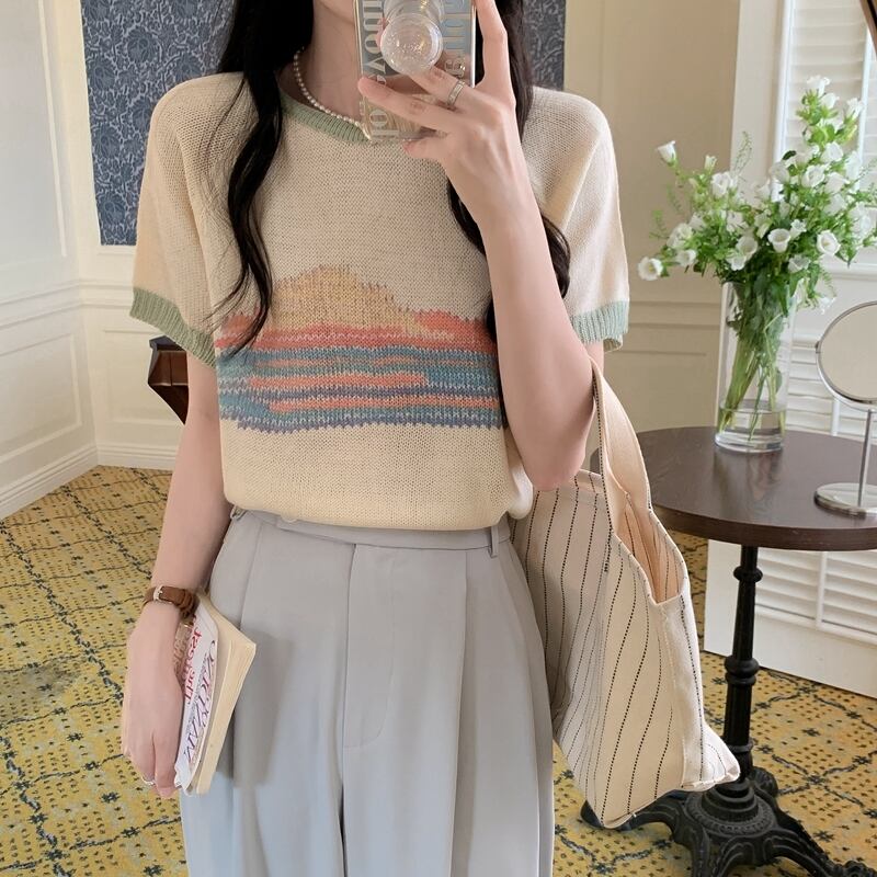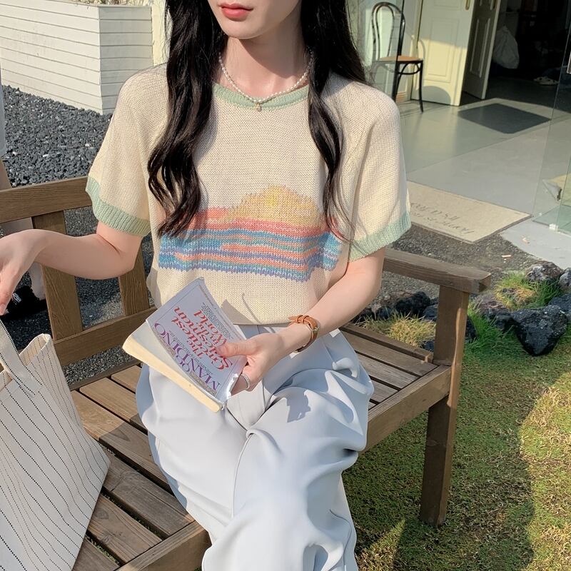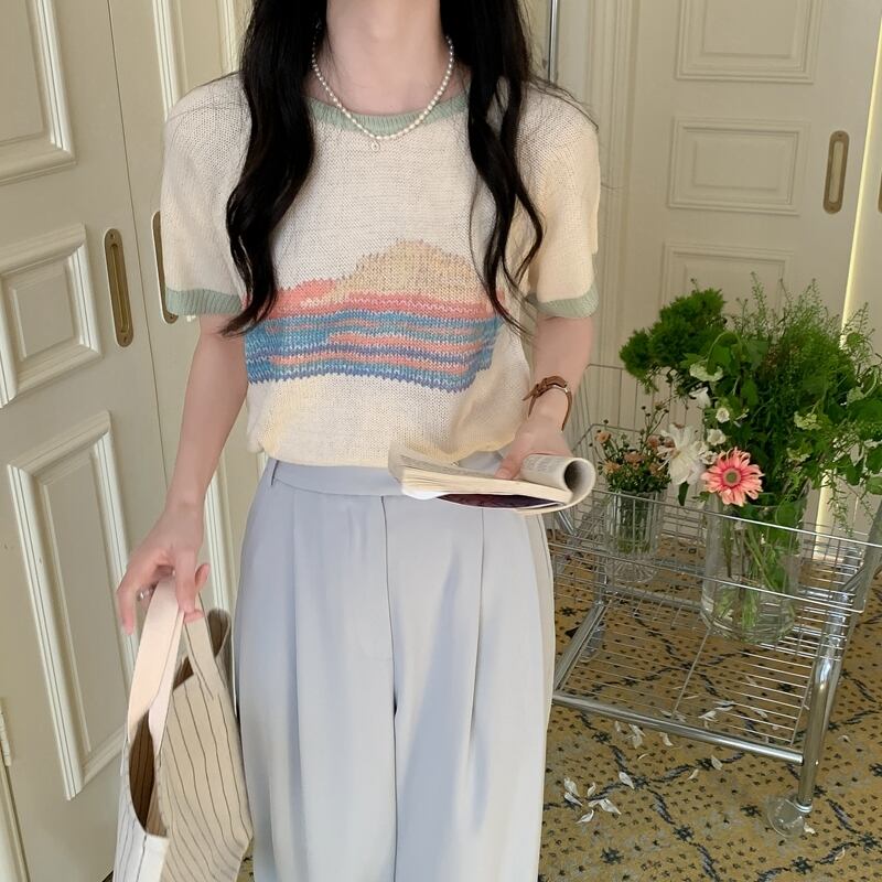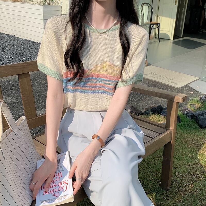 ese sweet コントラストカラー アイスシルクニット 半袖Tシャツ レディース 2022年夏 新デザインセンス ニッチ 薄手 トップス 大人ガーリー スウィート キュート カジュアル サマー 夏物 7460052341686492 | framboise21
