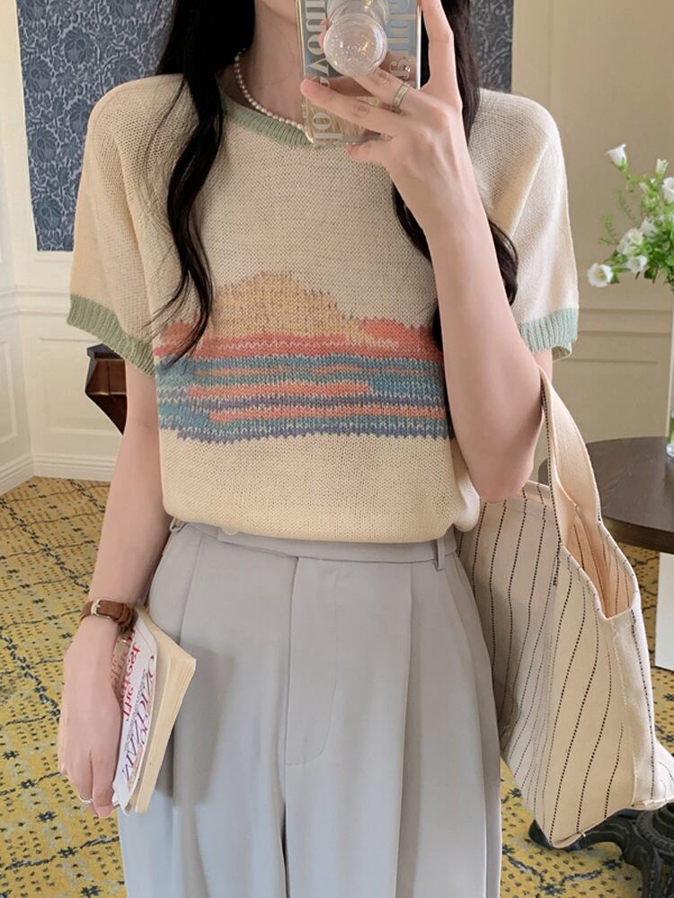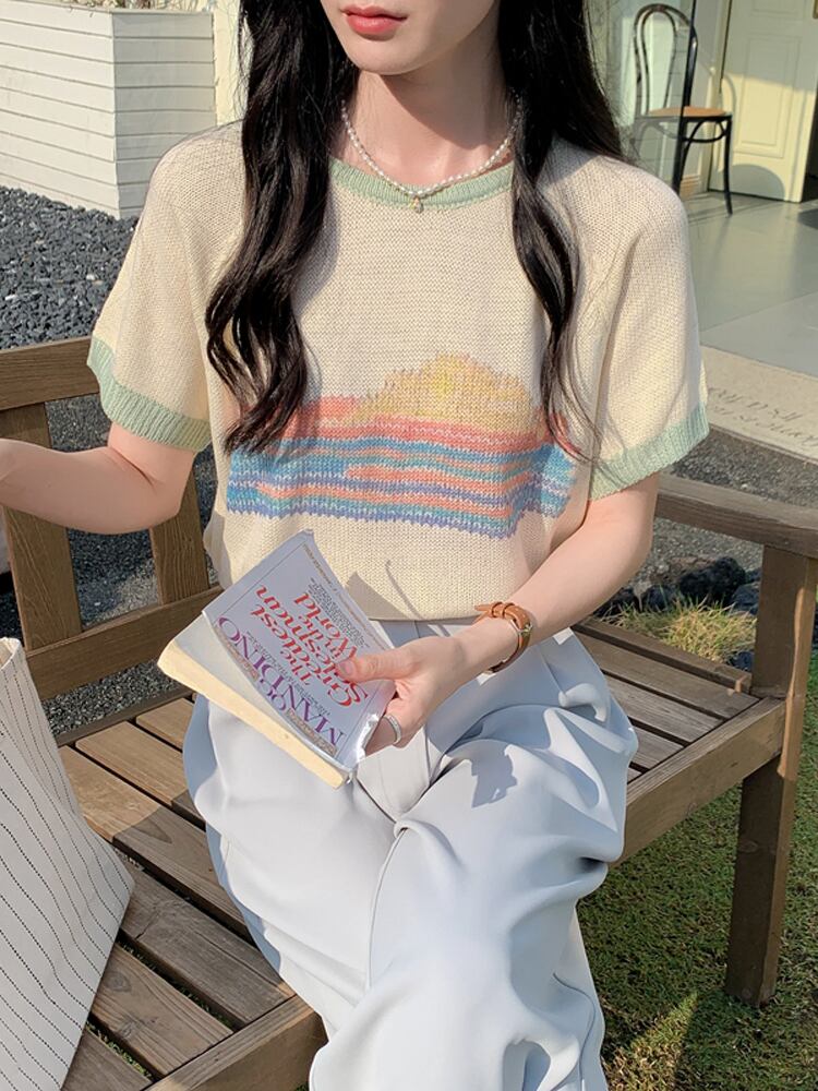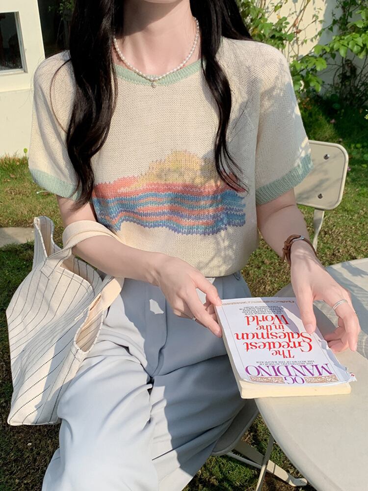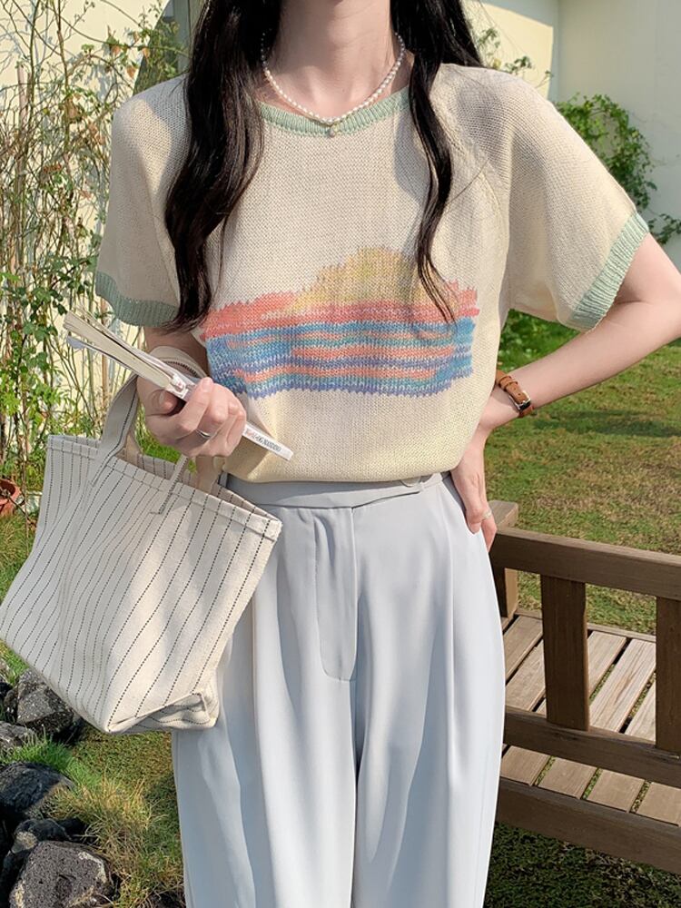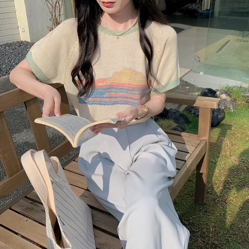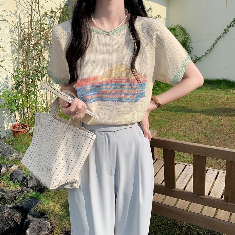 ese sweet コントラストカラー アイスシルクニット 半袖Tシャツ レディース 2022年夏 新デザインセンス ニッチ 薄手 トップス 大人ガーリー スウィート キュート カジュアル サマー 夏物 7460052341686492 | framboise21