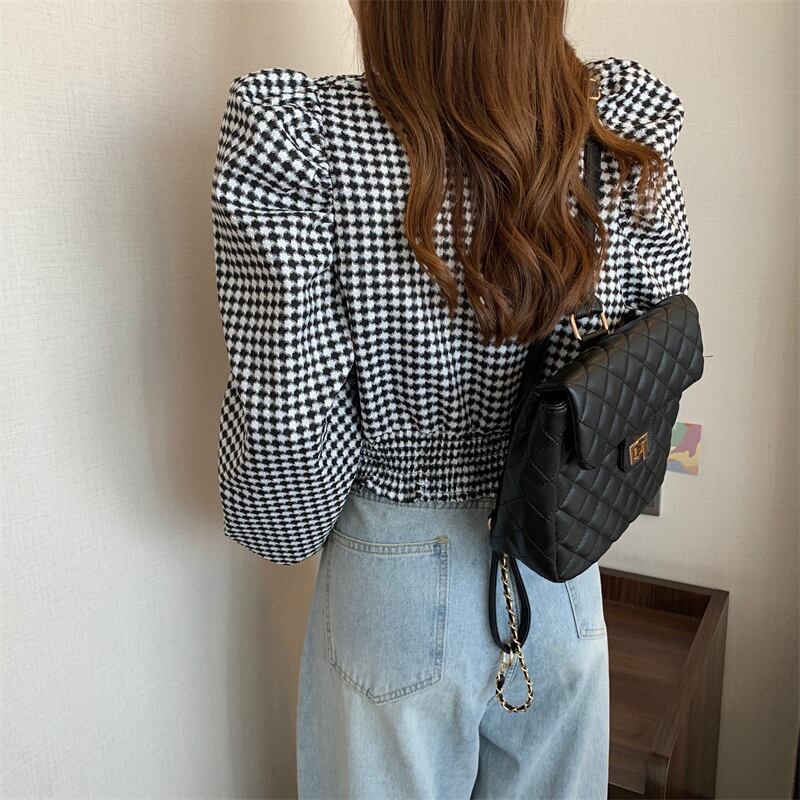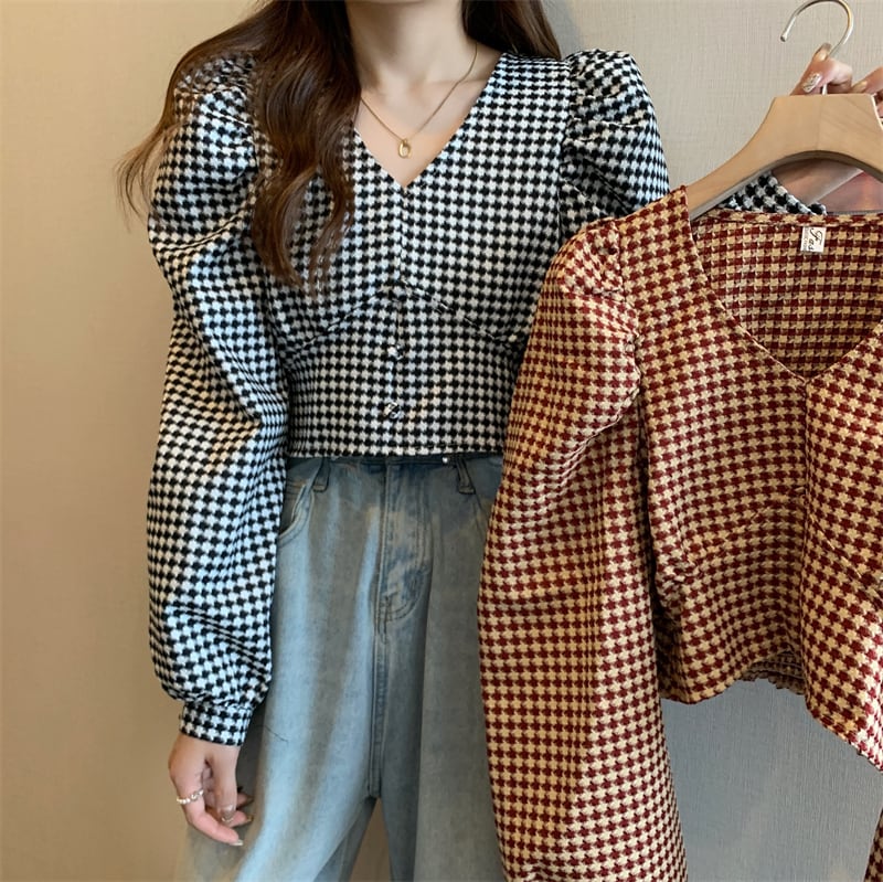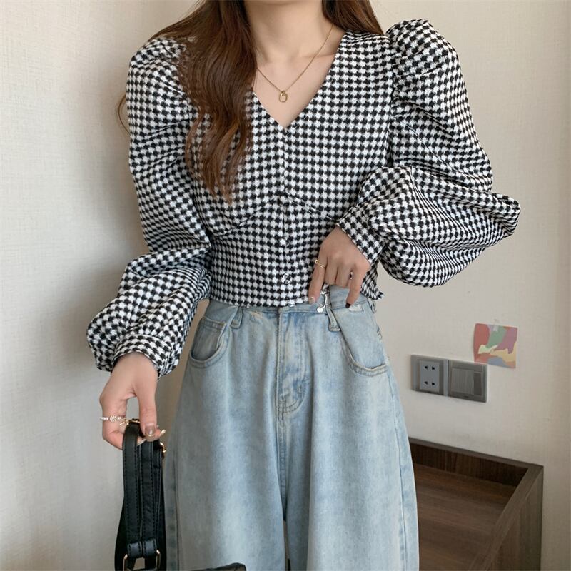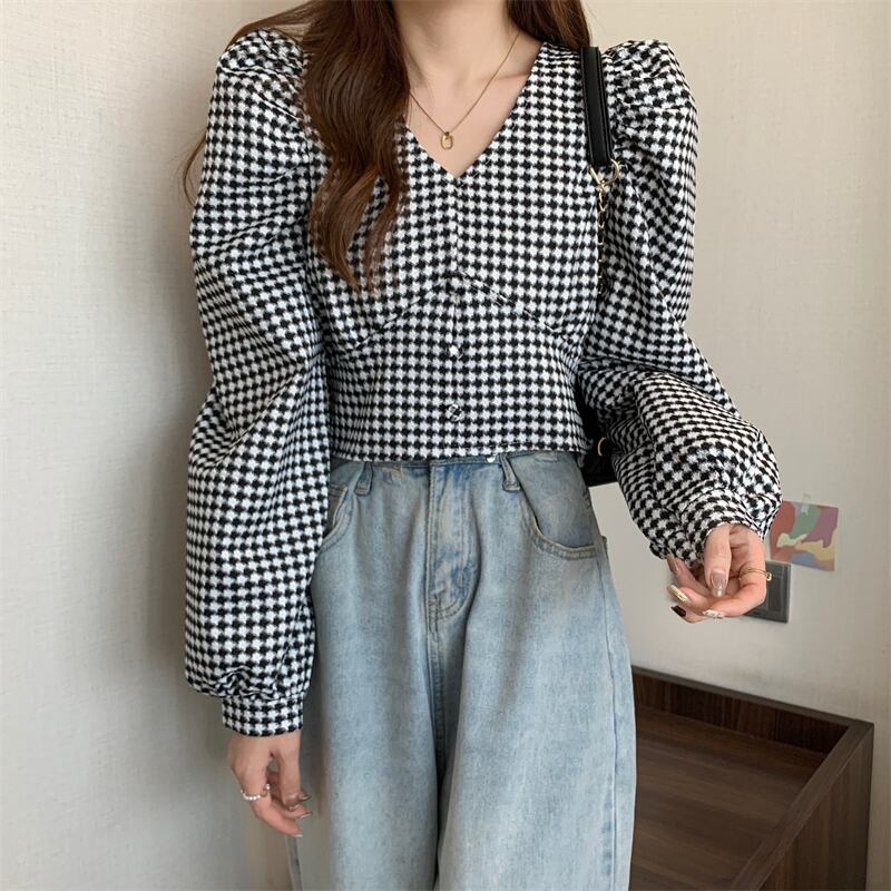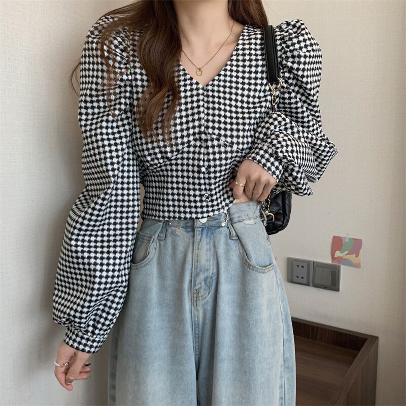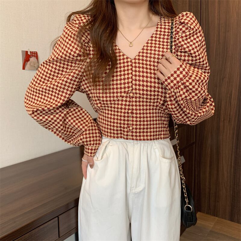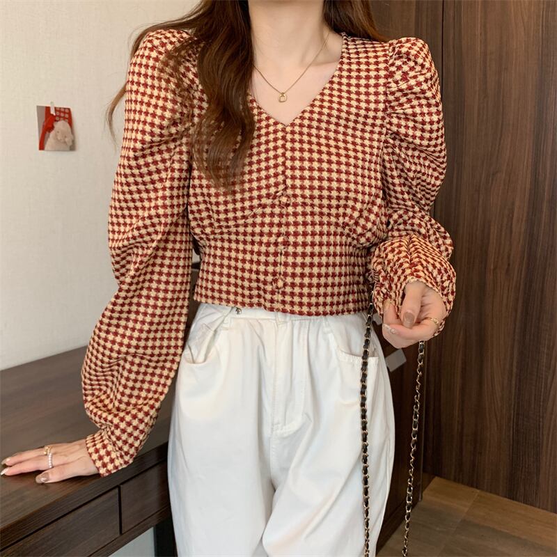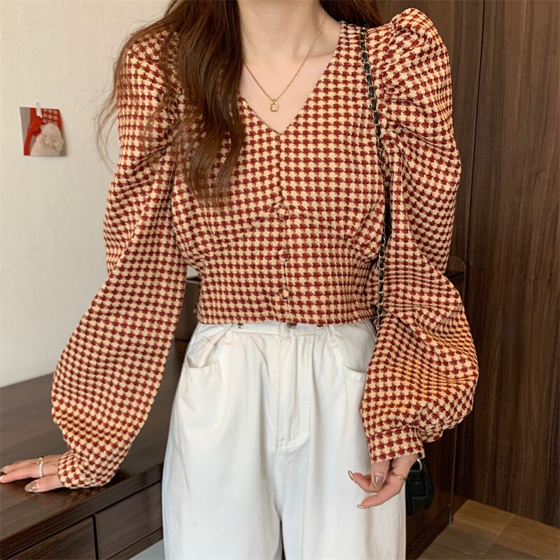 格子縞のシャツの女性の秋の新 2022 レトロシックなデザインウエストショート v ネックバブル長袖トップ ロング オータム 秋物 Vネック 7460052795781337 | framboise21