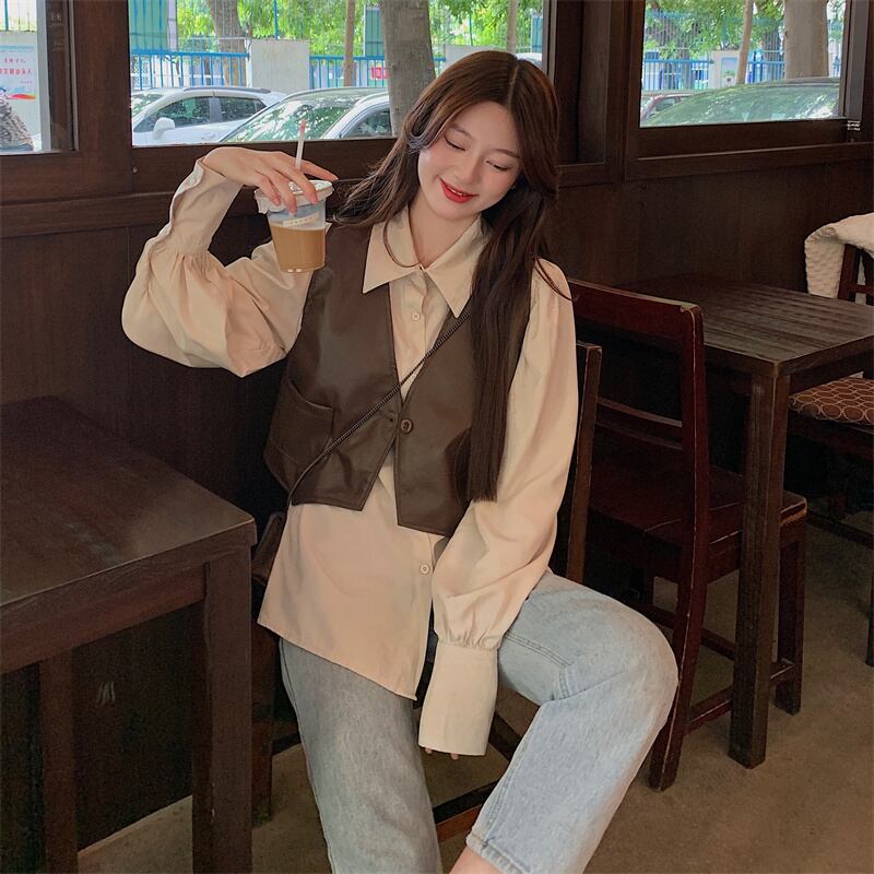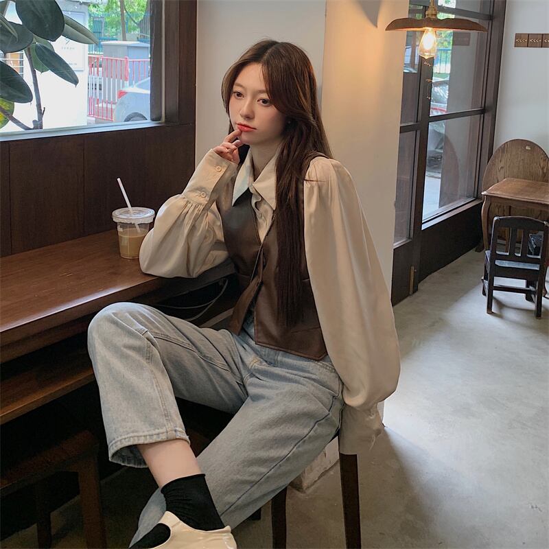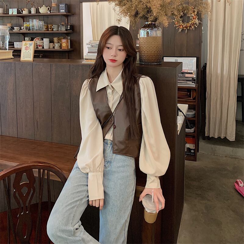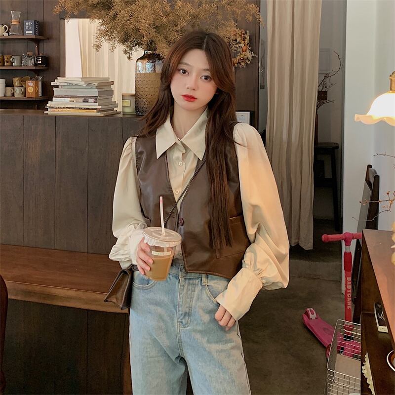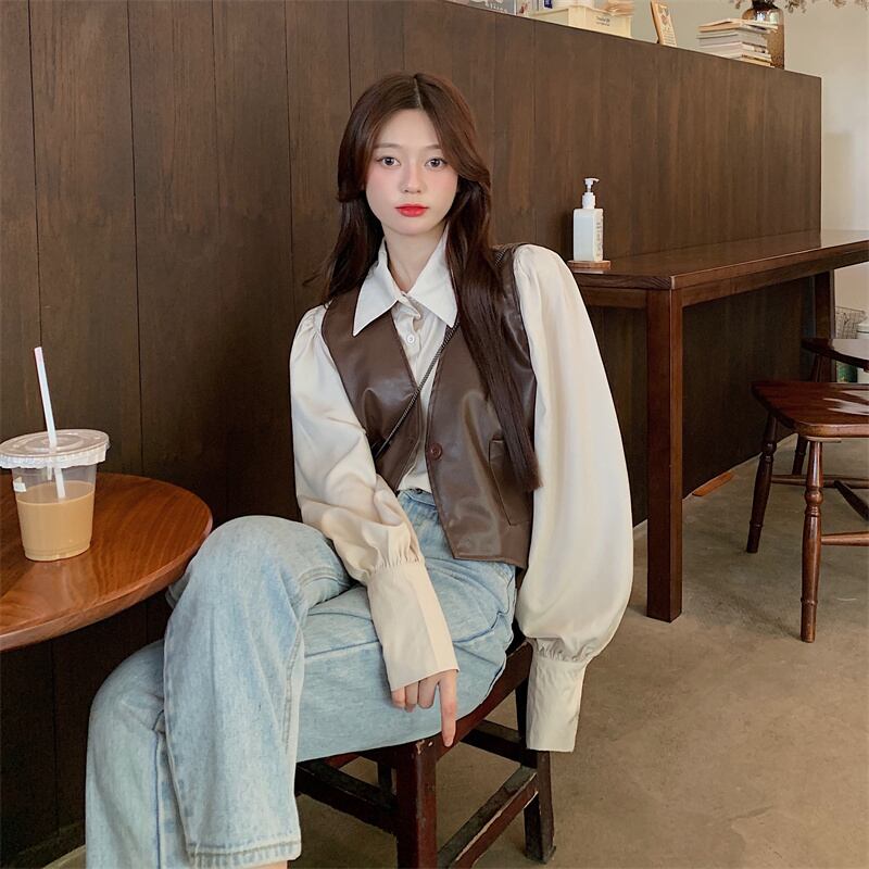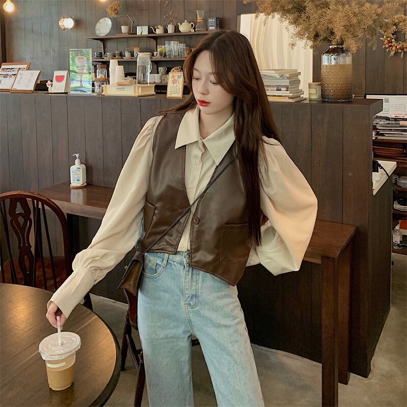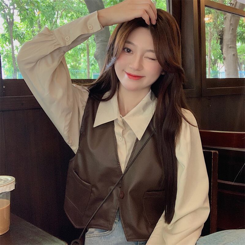 レトロな pu レザー ベスト ベスト女性の初秋のデザイン感覚の外に不規則な短いノースリーブ ベスト ジャケットとの重ね着 ショート 半袖 ハーフスリーブ オータム 秋物 7460068907638771 | framboise21