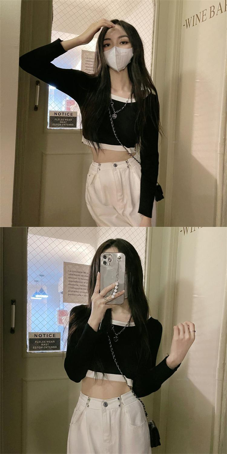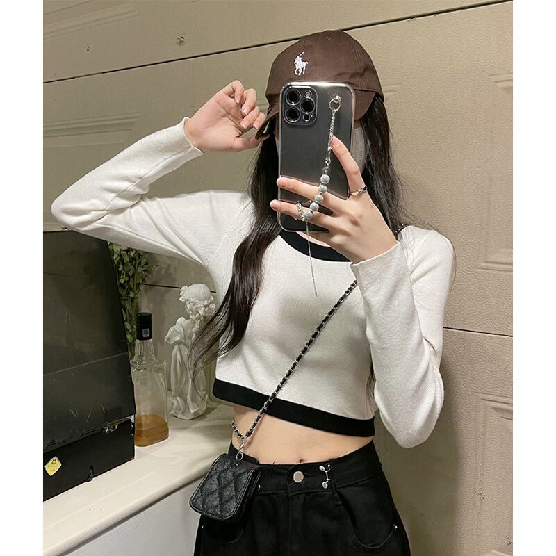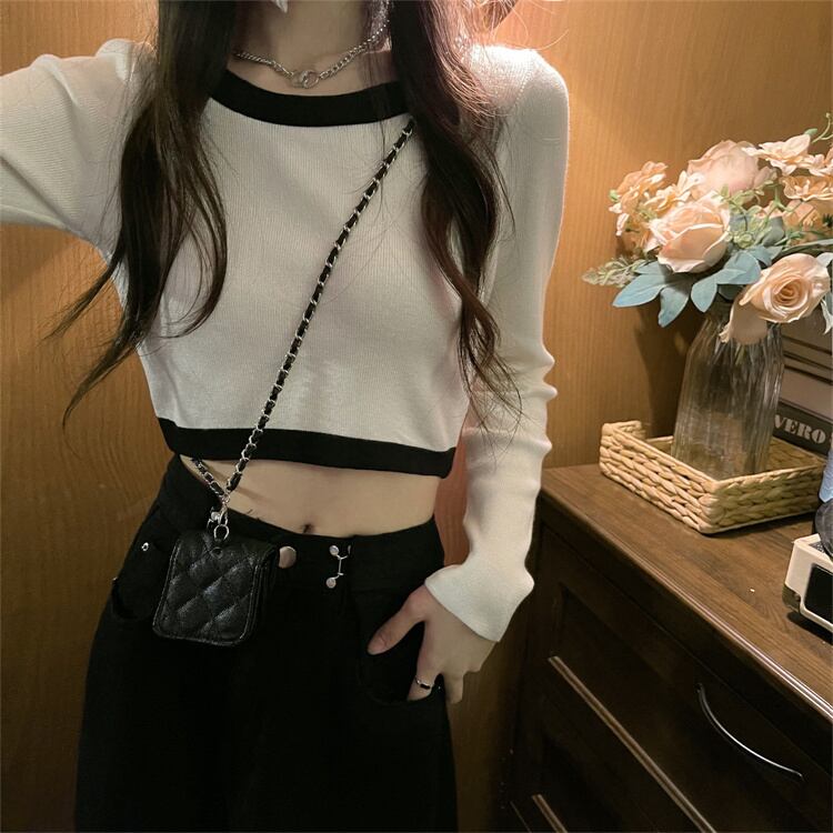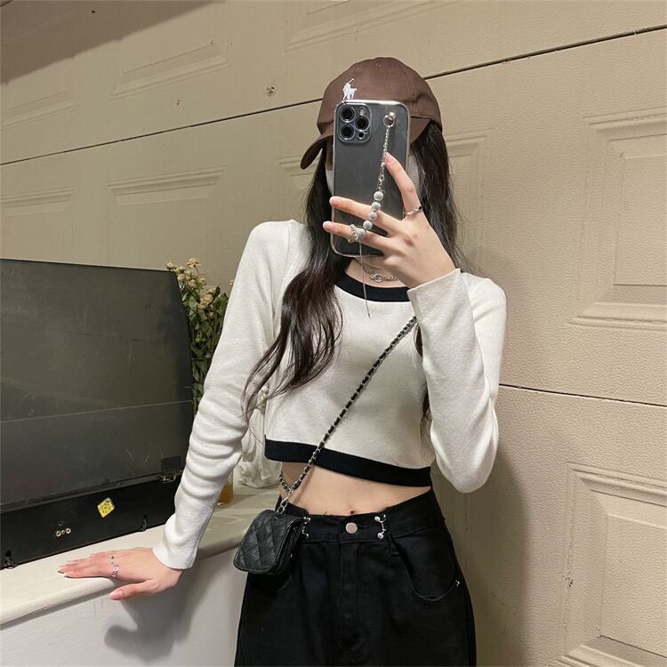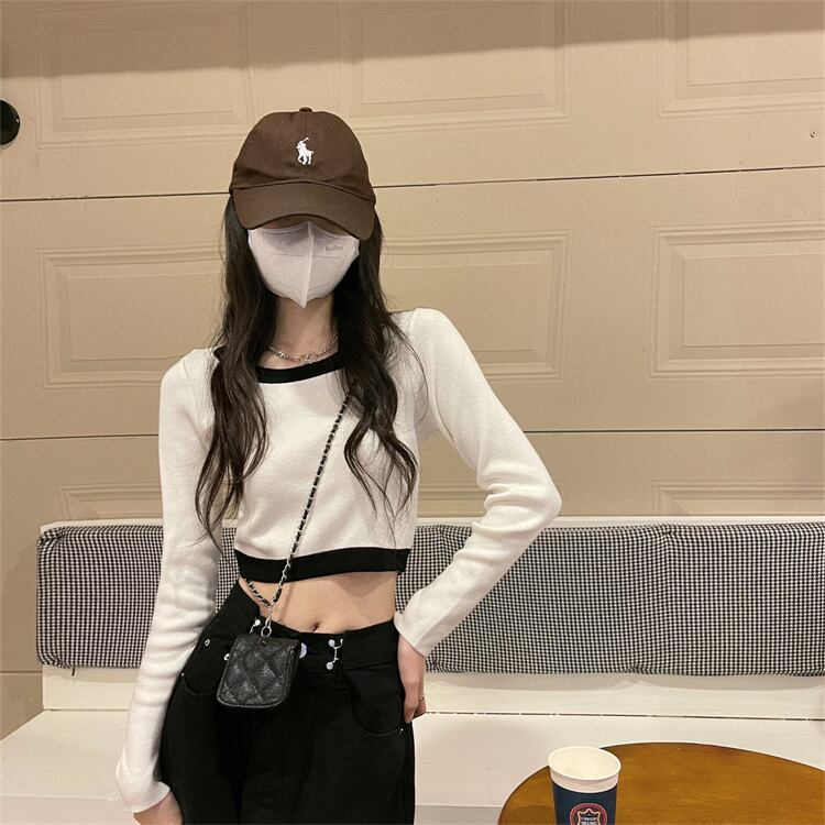 ショート甘辛いへそニットセータートップハイウエストインタイドボトミングシャツ春と秋スリム白長袖 tシャツ女性 ハイウェスト ロング ホワイト 大人ガーリー スウィート キュート カジュアル スプリング 春物 オータム 秋物 7460018901060336 | framboise21