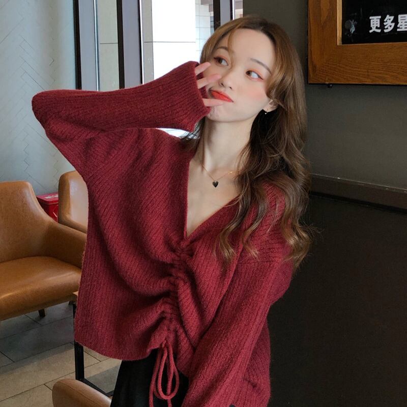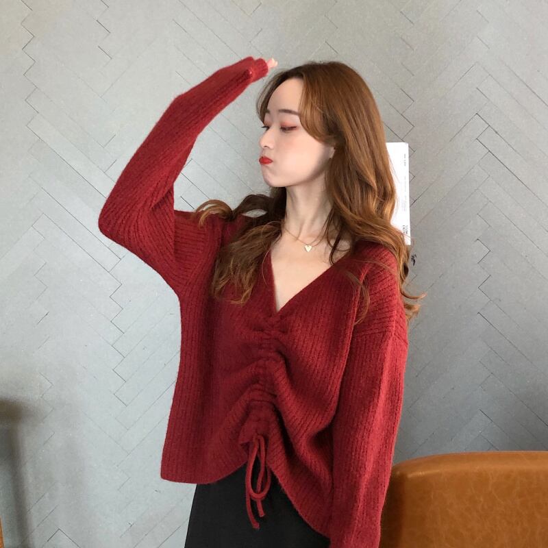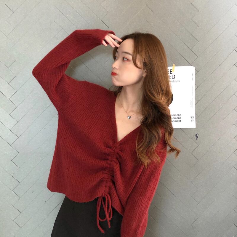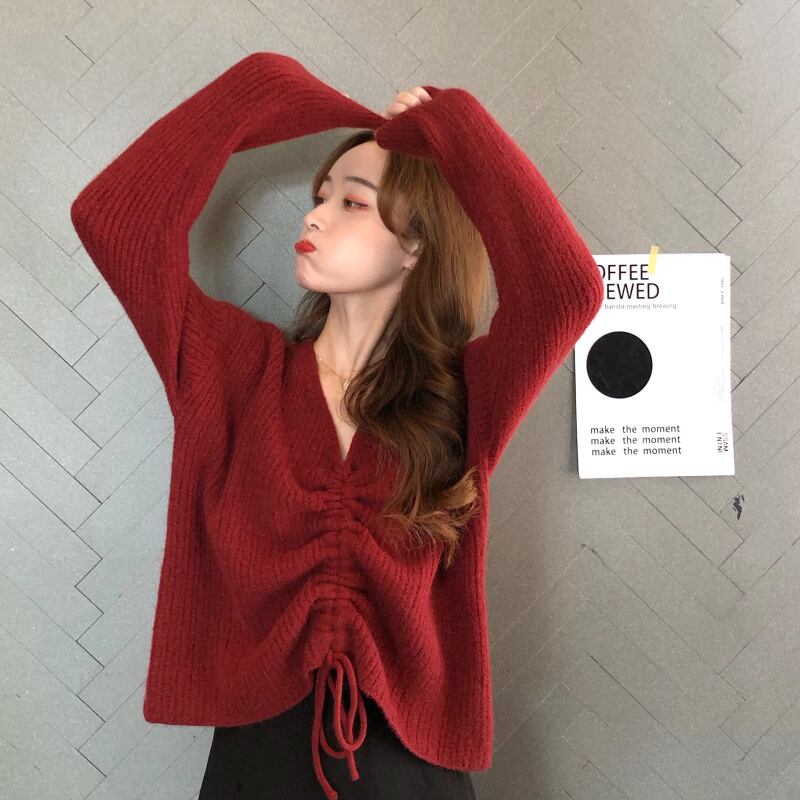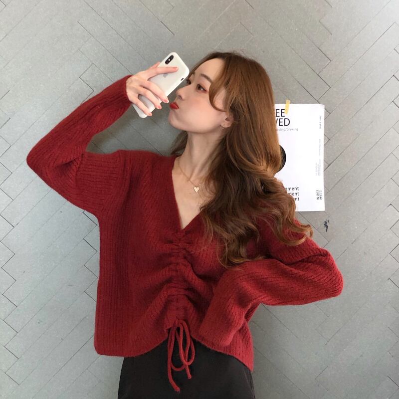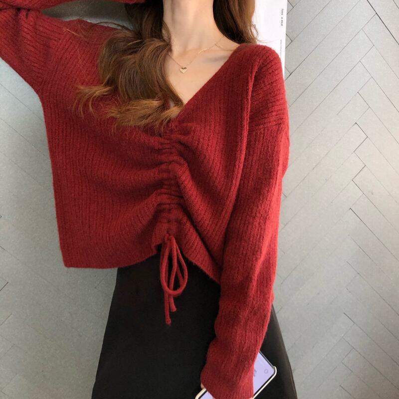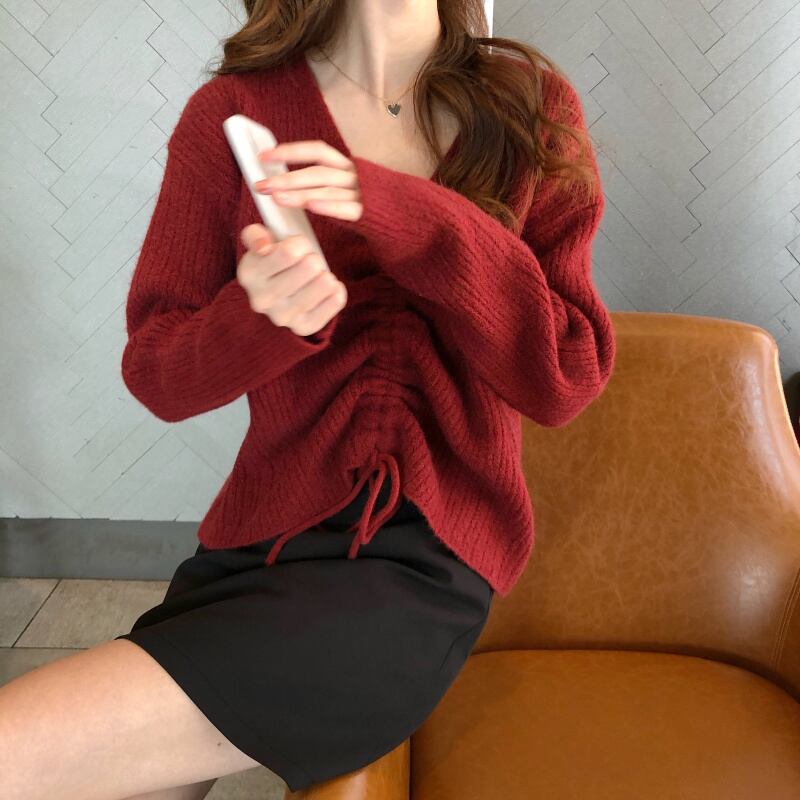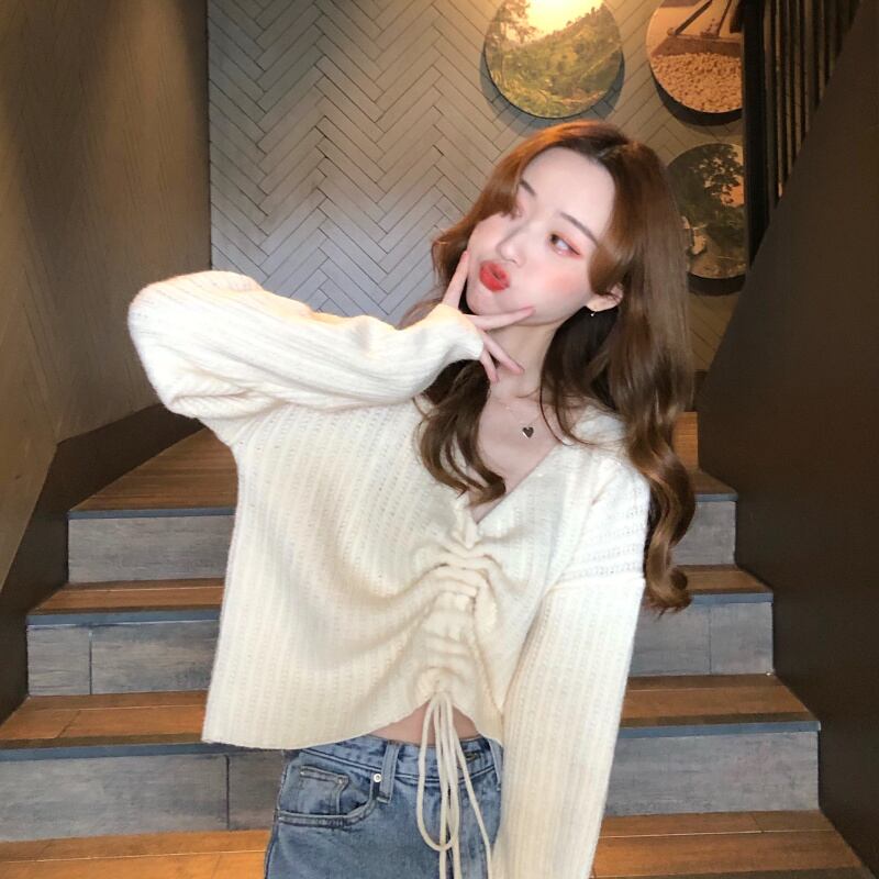プリーツ 巾着 ニット セーター トップス レディース 春秋 新作 ゆったり アウター オールマッチ 短め 長袖 Vネック セーター ショート ロング スプリング 春物 オータム 秋物 7460073979348674 | framboise21