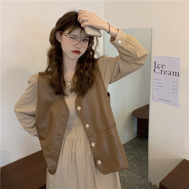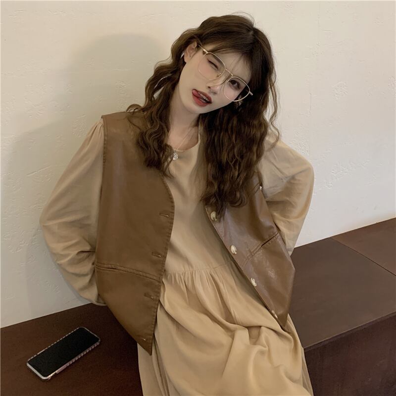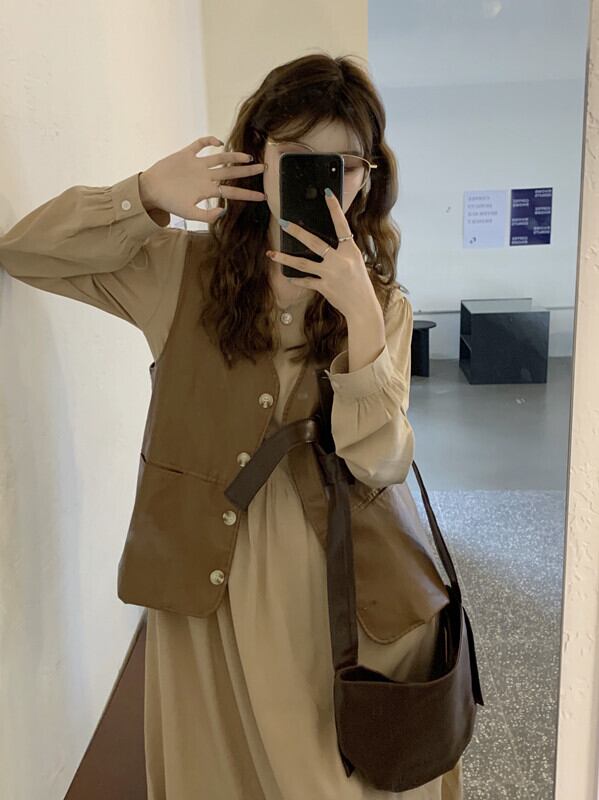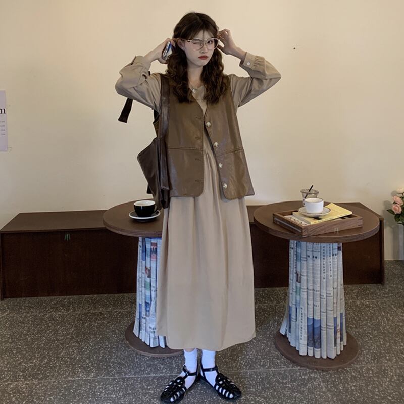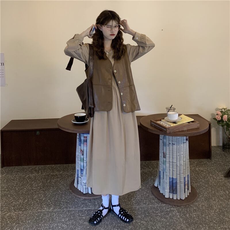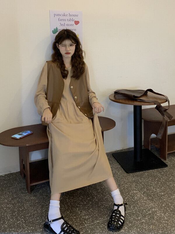 色:アプリコットドレス,コーヒーカラーのレザーベスト