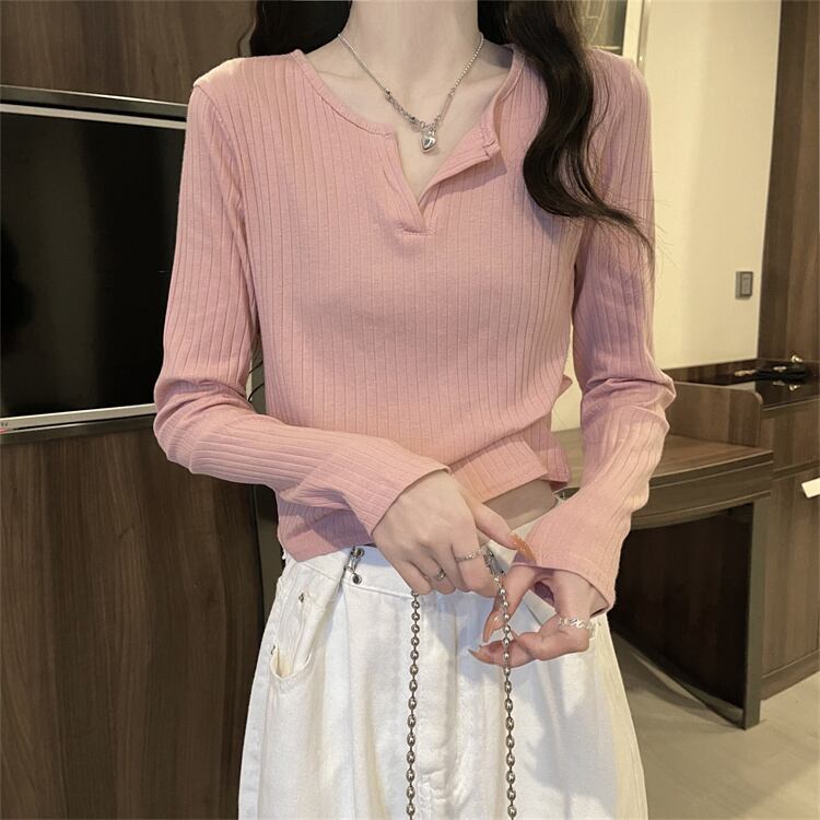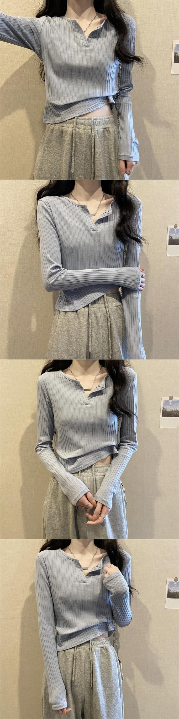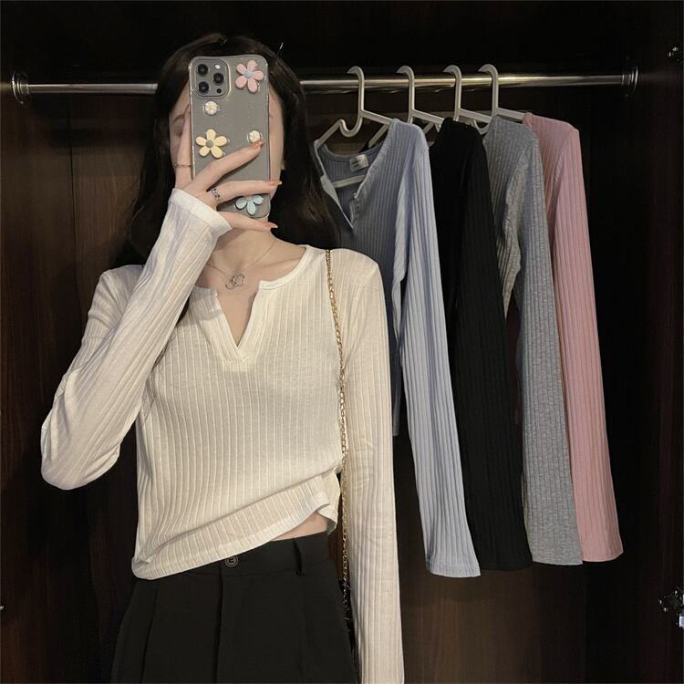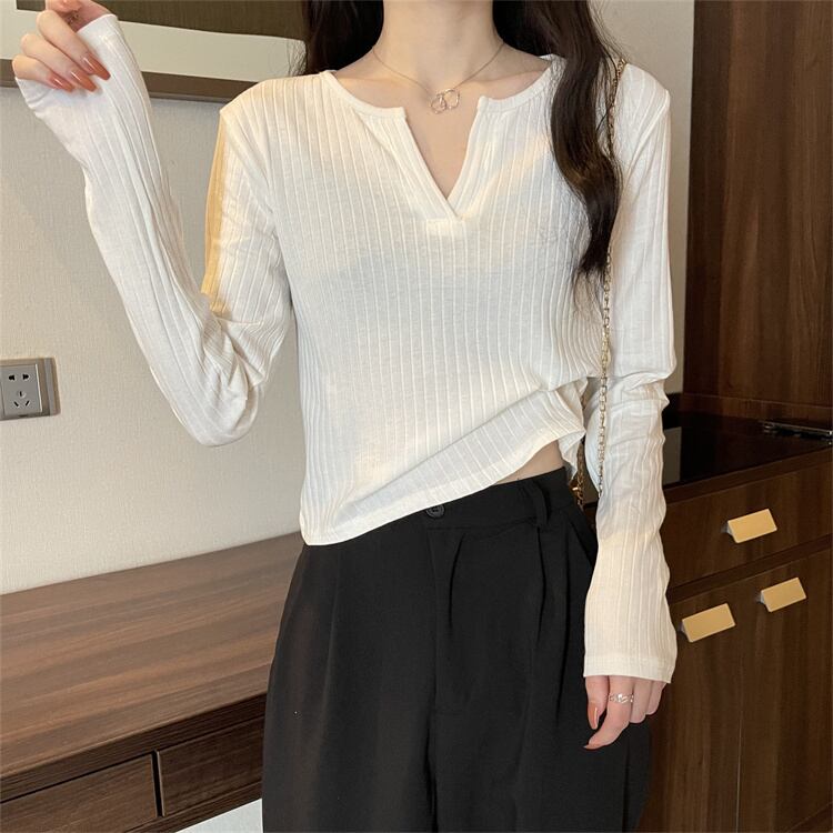 白い短いVネックのボトムスシャツの女性の秋のスーツに長袖のTシャツと秋の服を着て、外でトップのニッチな服を着ています ショート ロング ホワイト オータム 秋物 746004959089894 | framboise21