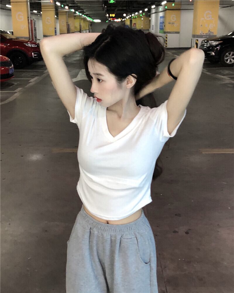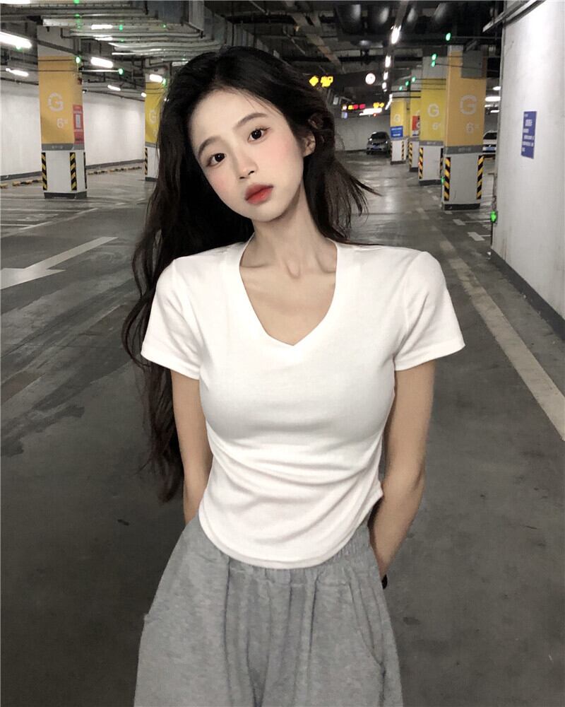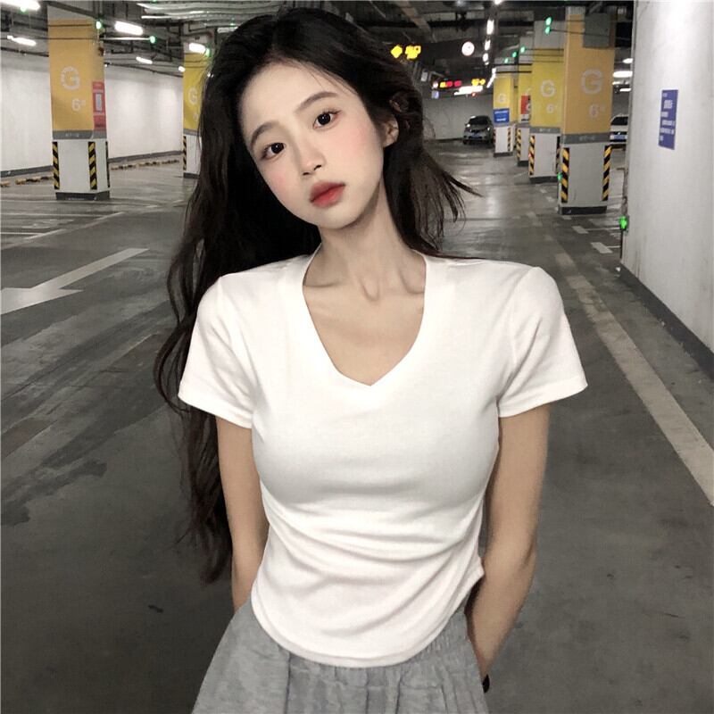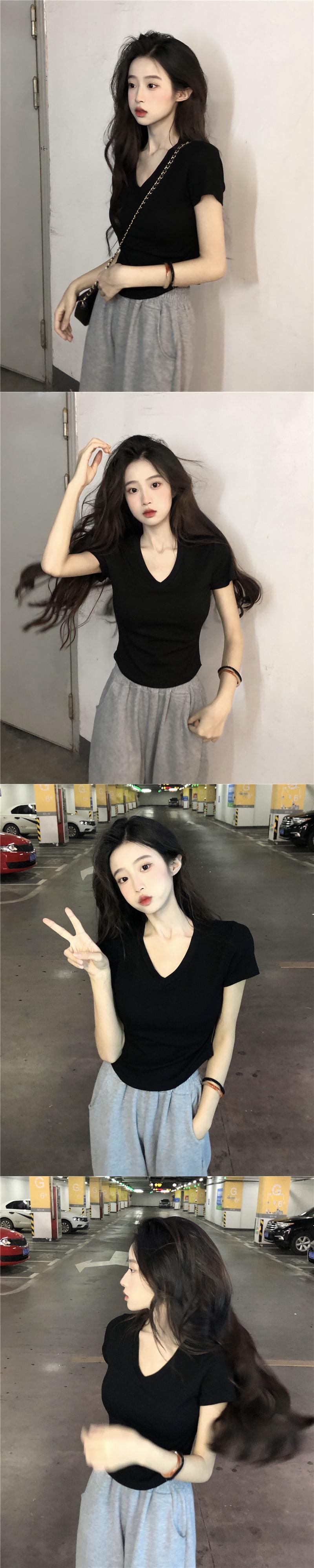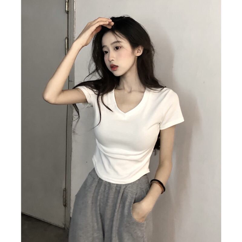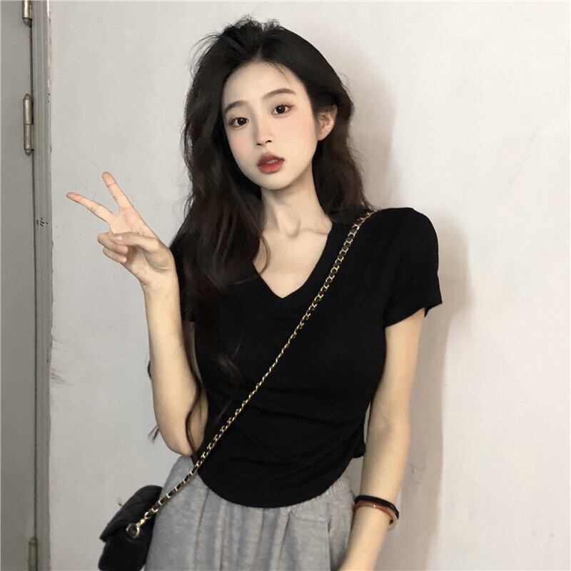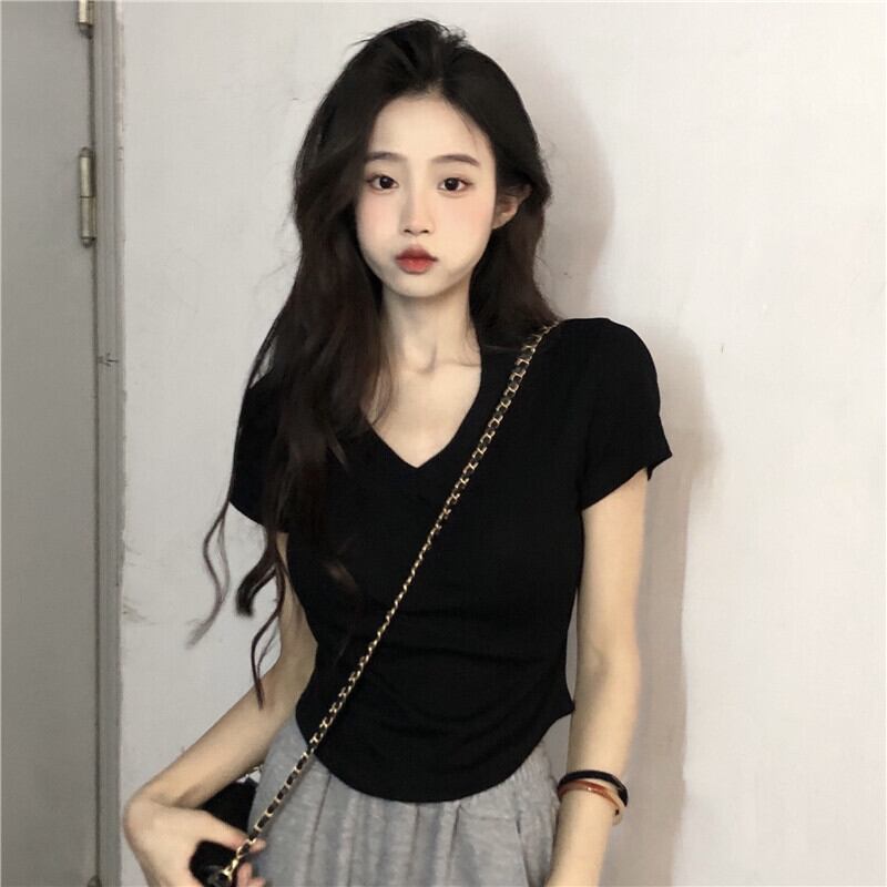 Vネック カーブヘム デザイン イレギュラー 半袖 フロントショルダー Tシャツ 夏 シック スリム フィッシュボーン ショート トップス レディース 薄手 サマー 夏物 746004062510128 | framboise21