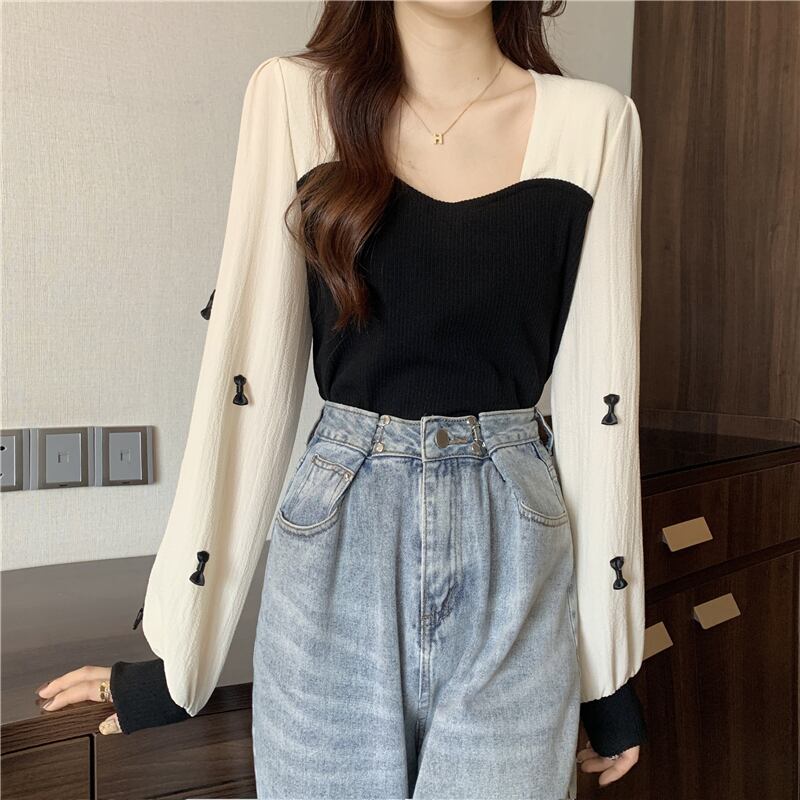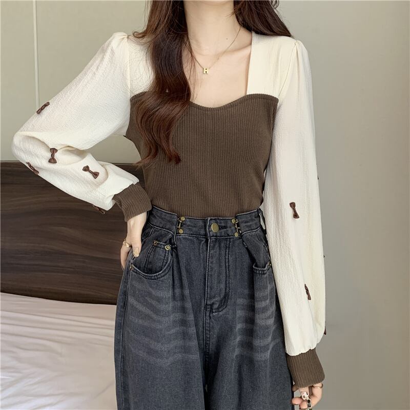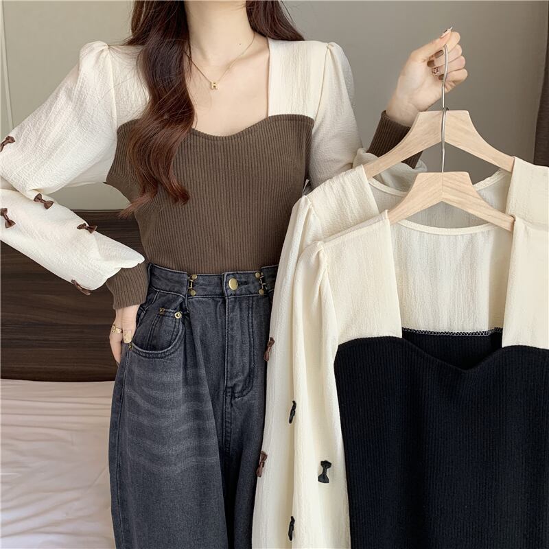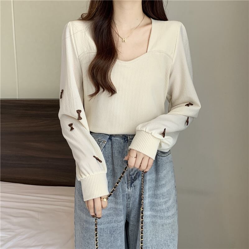 フレンチスクエアネックシフォンステッチニットセーターレディース春秋ソルトシリーズデザインスモールスリムスリムショートトップ スプリング 春物 オータム 秋物 スクウェア 746002520762871 | framboise21