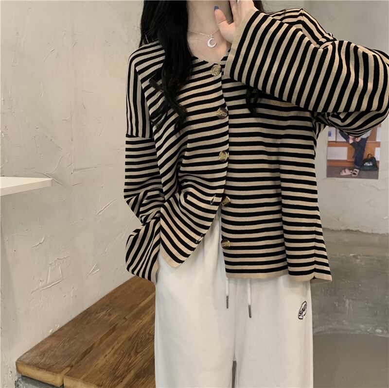 ニットカーディガンの女性の2022年秋の新しい薄いセクションのゆったりとした薄いバージョンのファッションレトロなストライプの長袖コート ロング オータム 秋物 7460083421997599 | framboise21