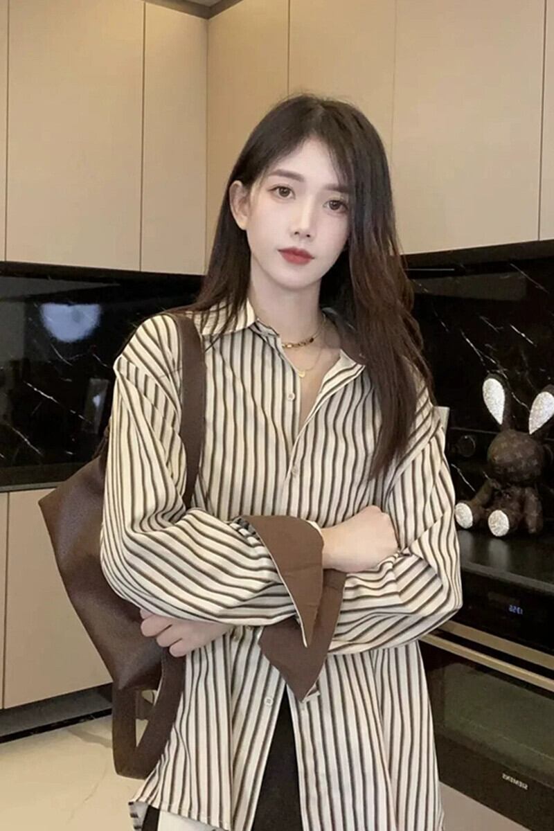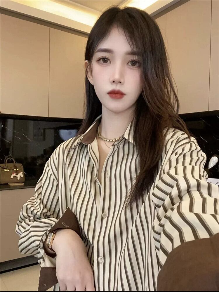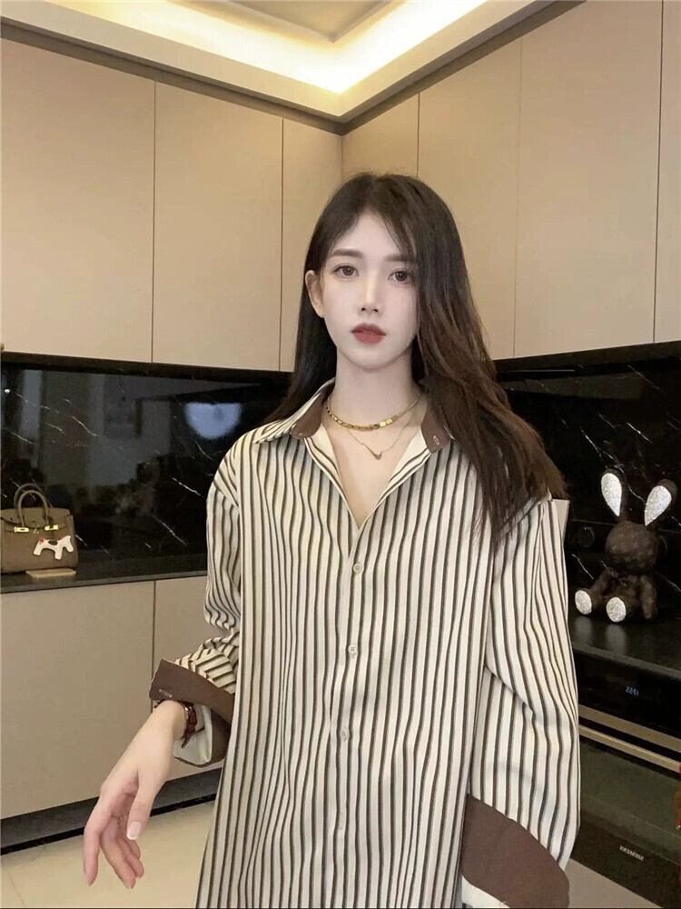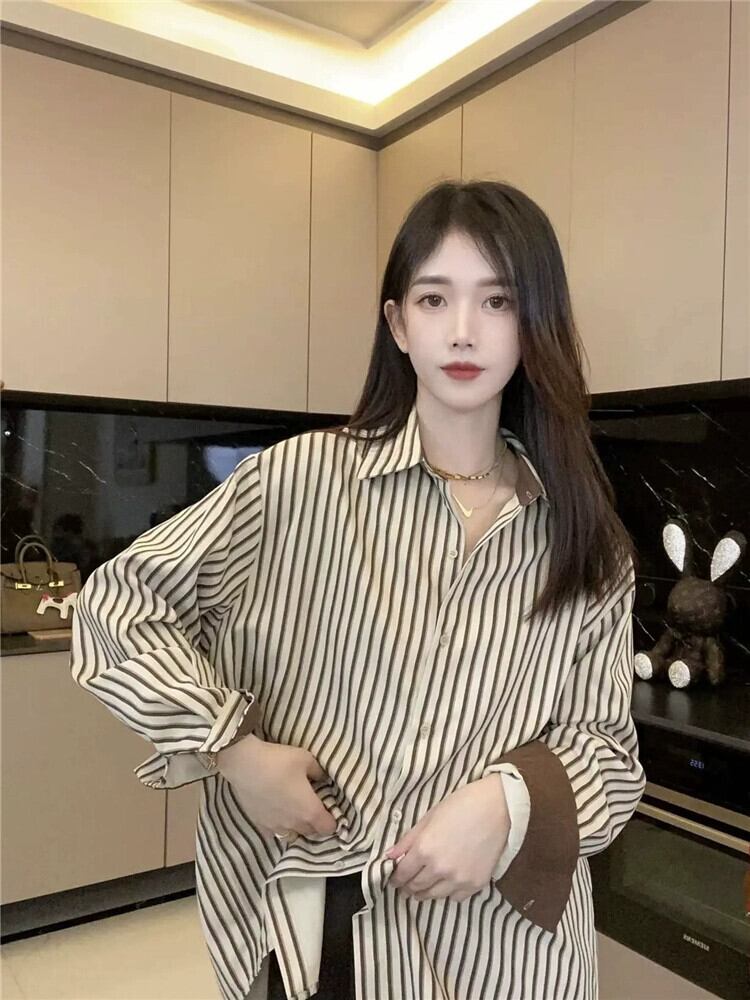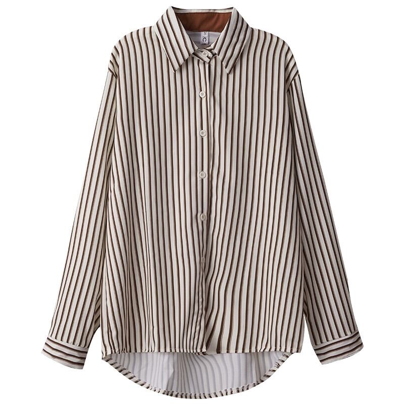 ミドル丈ストライプシャツレディース春秋フレンチレトロデザインセンスゆったり怠惰なスタイルレイヤード長袖シャツジャケット ロング レッド スプリング 春物 オータム 秋物 7460027035814912 | framboise21