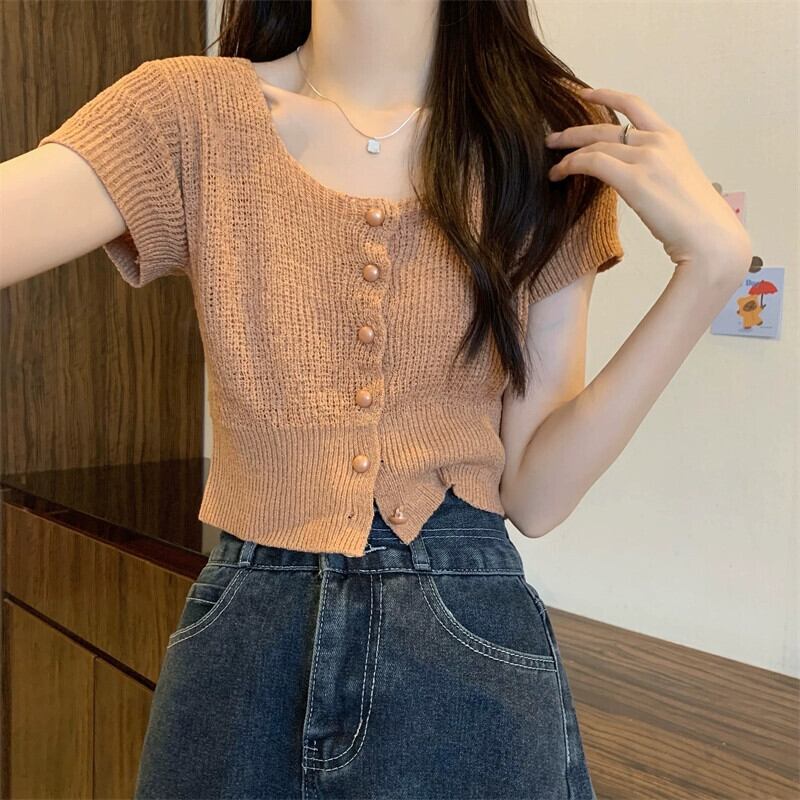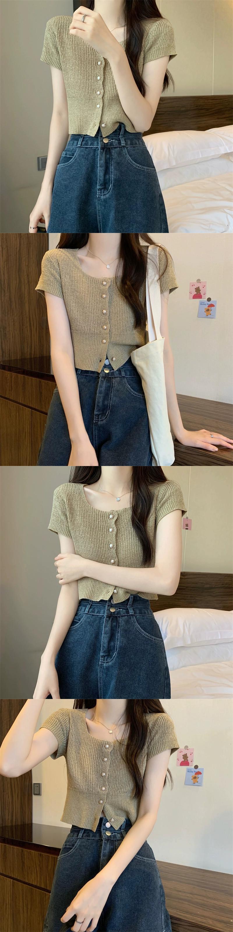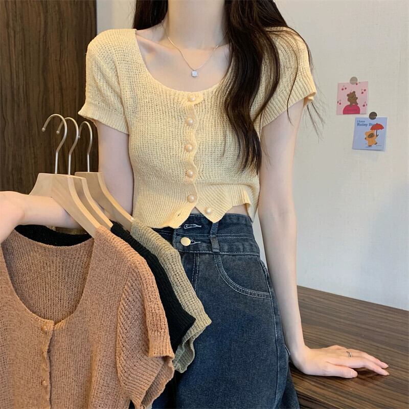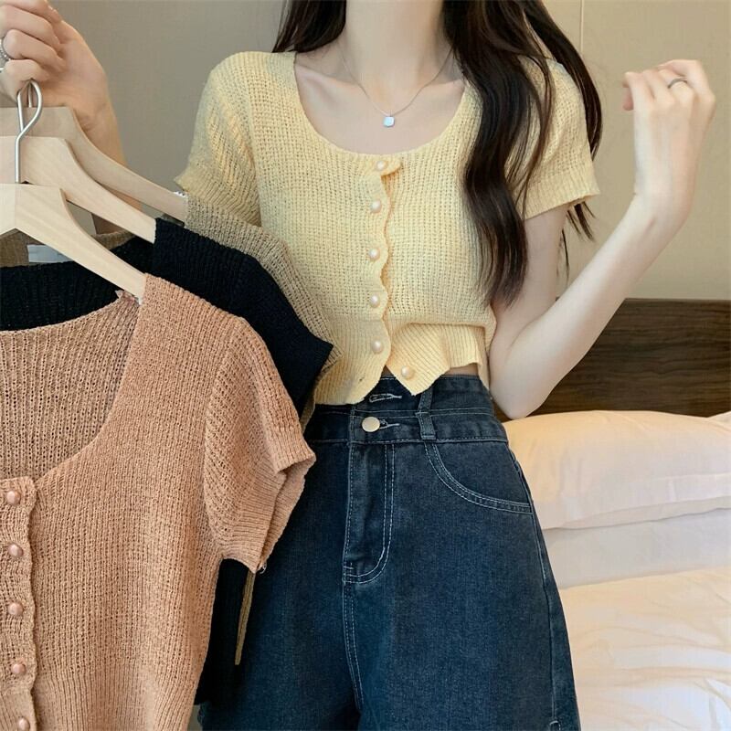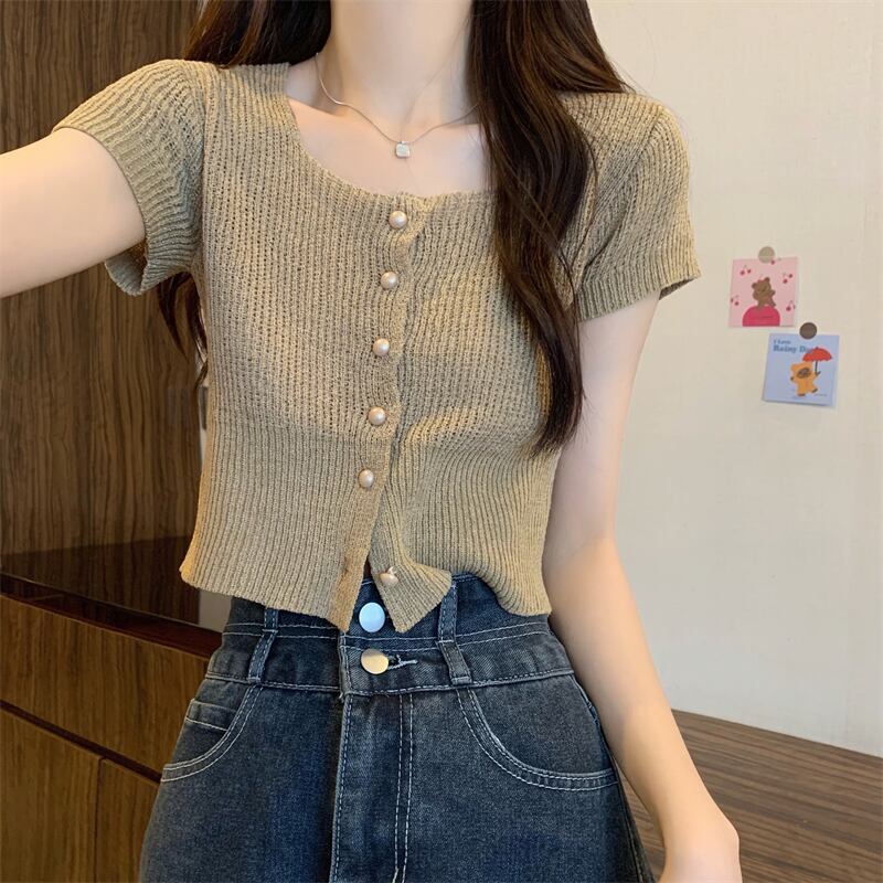 フロントショルダー半袖 tシャツの女性のスリムアイスシルクニットカーディガン夏薄部ハイウエストショートトップ 2023 新しい ハイウェスト サマー 夏物 7460062539603351 | framboise21