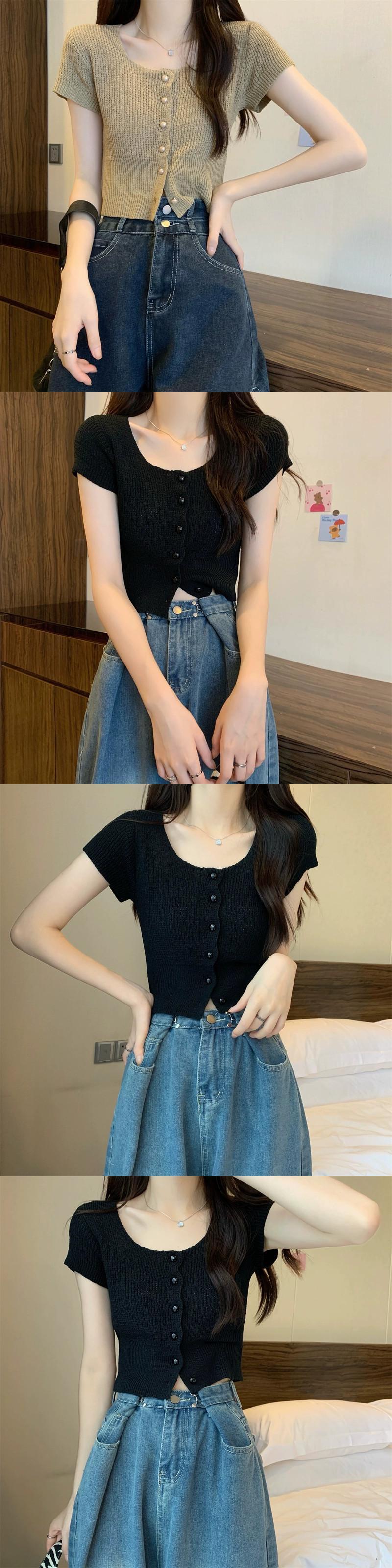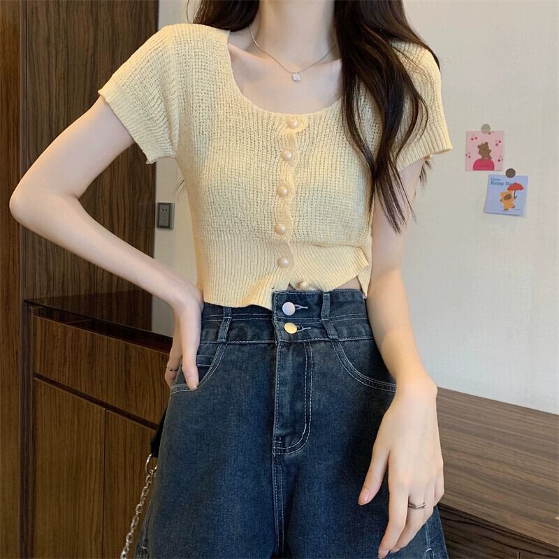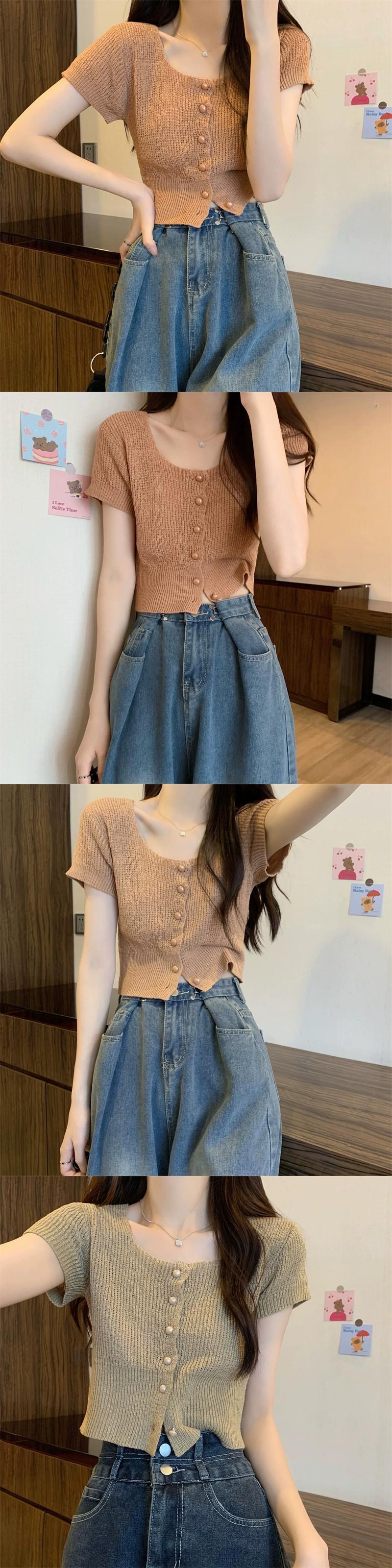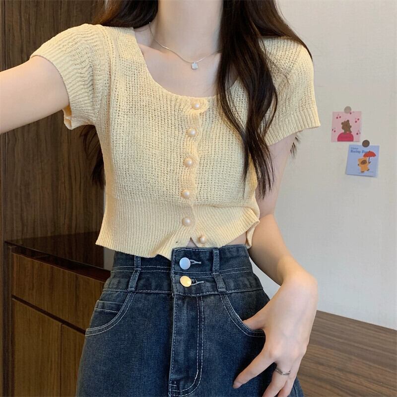 フロントショルダー半袖 tシャツの女性のスリムアイスシルクニットカーディガン夏薄部ハイウエストショートトップ 2023 新しい ハイウェスト サマー 夏物 7460062539603351 | framboise21