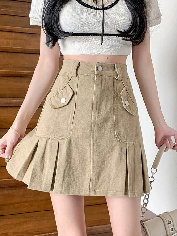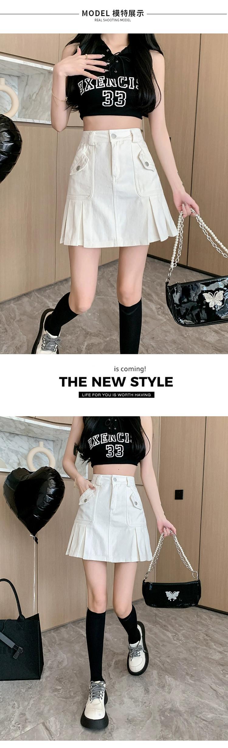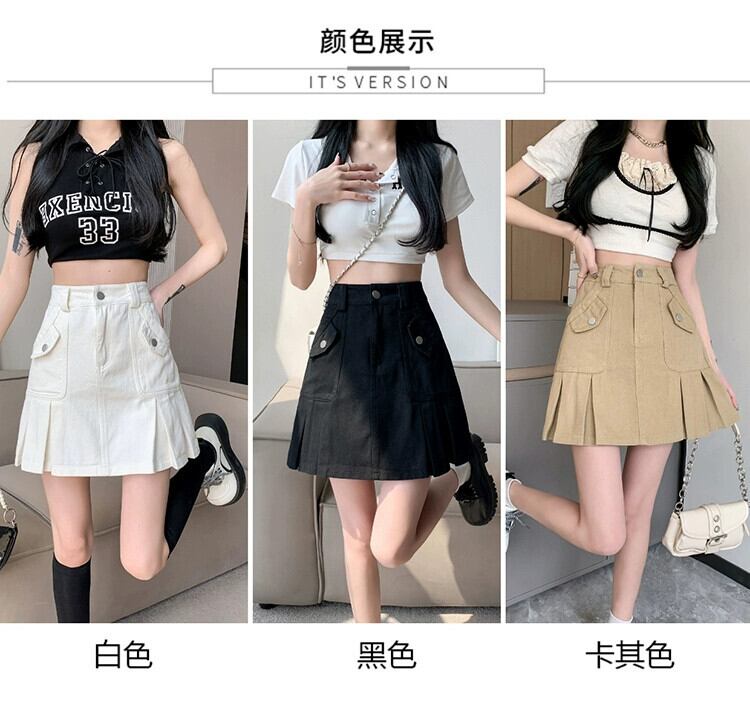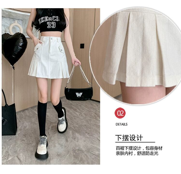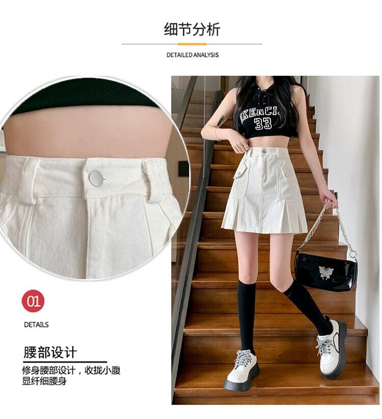 ホワイトデニムスカートレディース夏ハイウエストバッグヒップスカートデザインは薄くて万能なAラインプリーツショートスカートに見えます ハイウェスト サマー 夏物 746003727079728 | framboise21