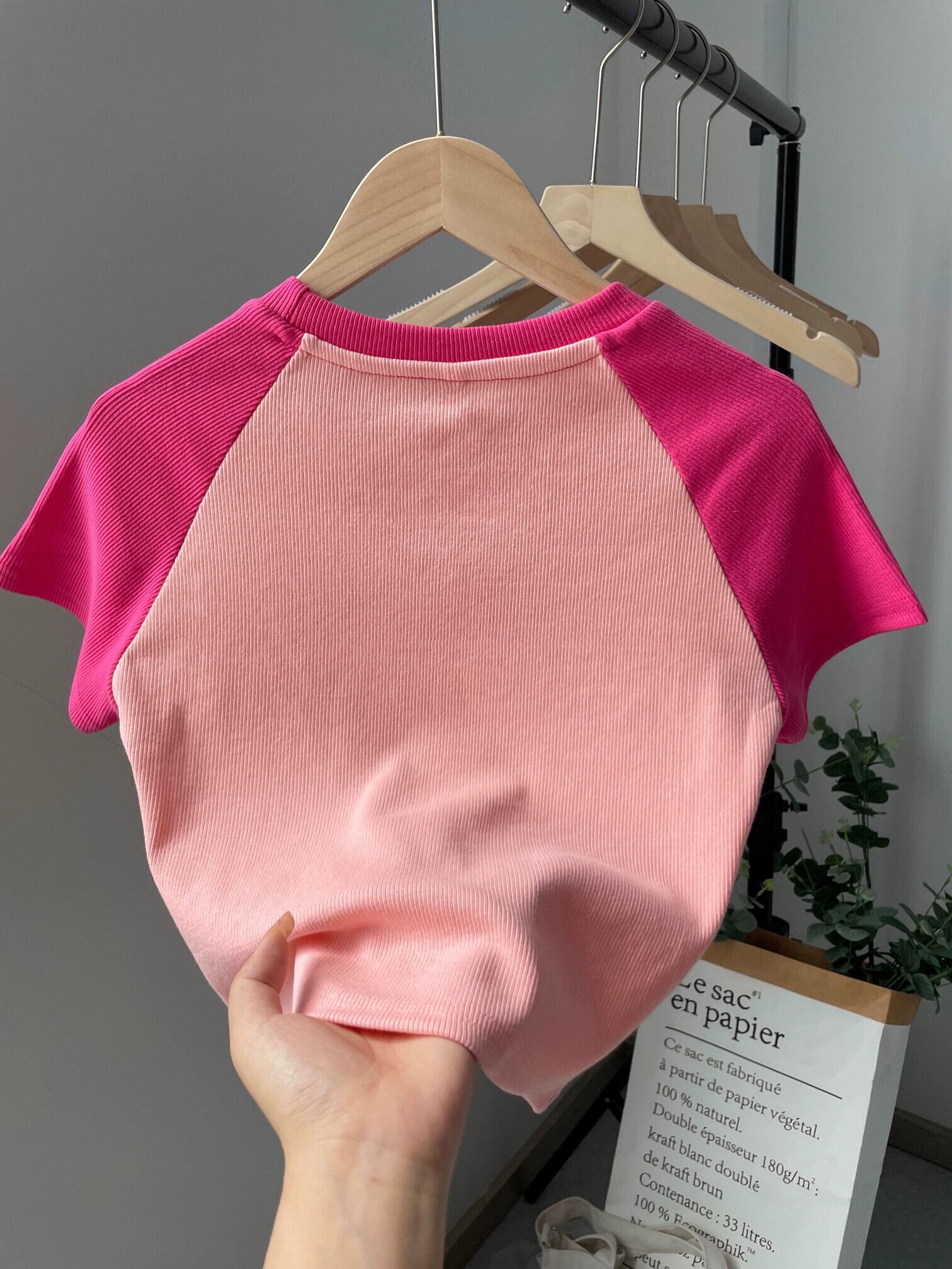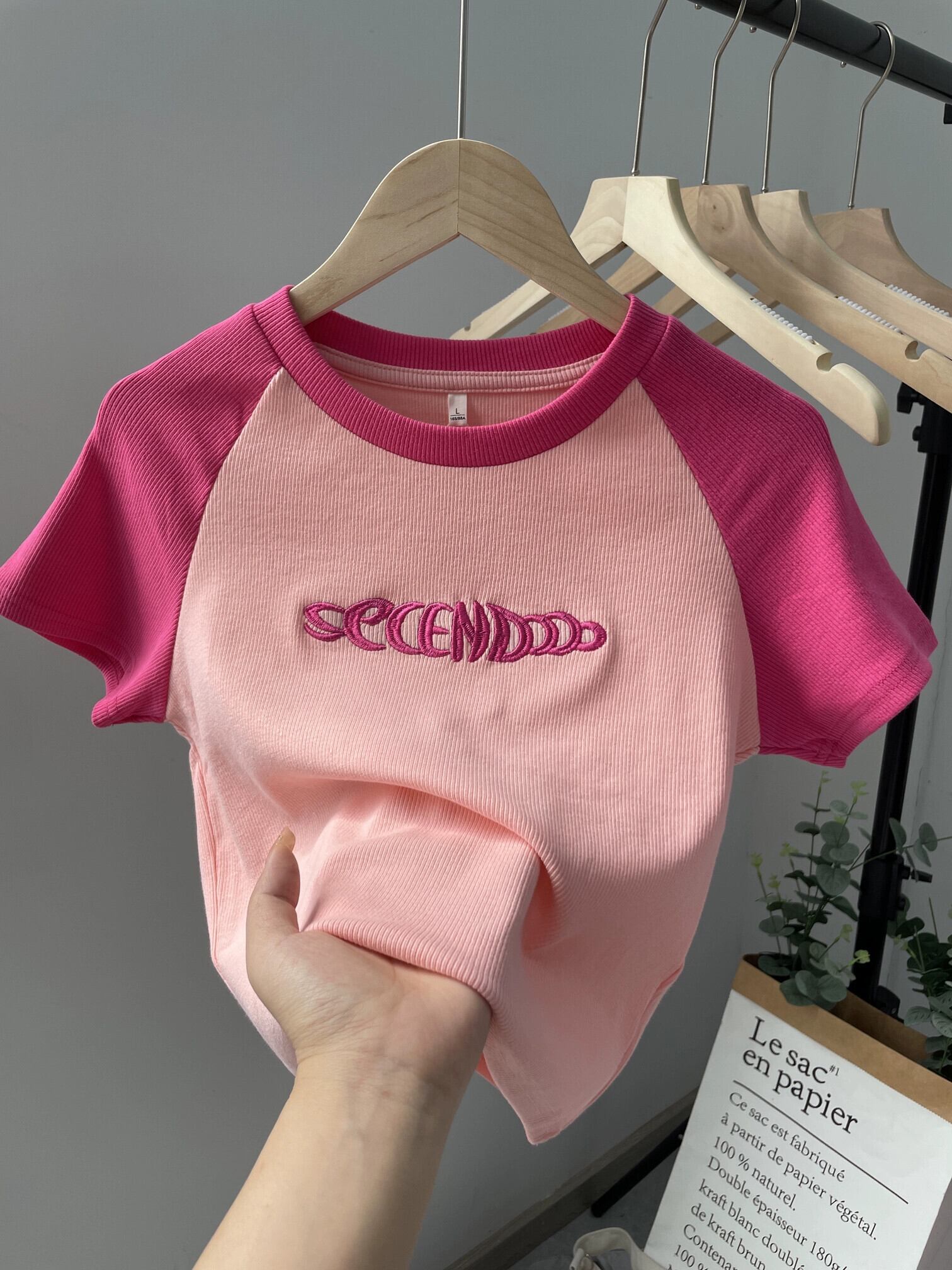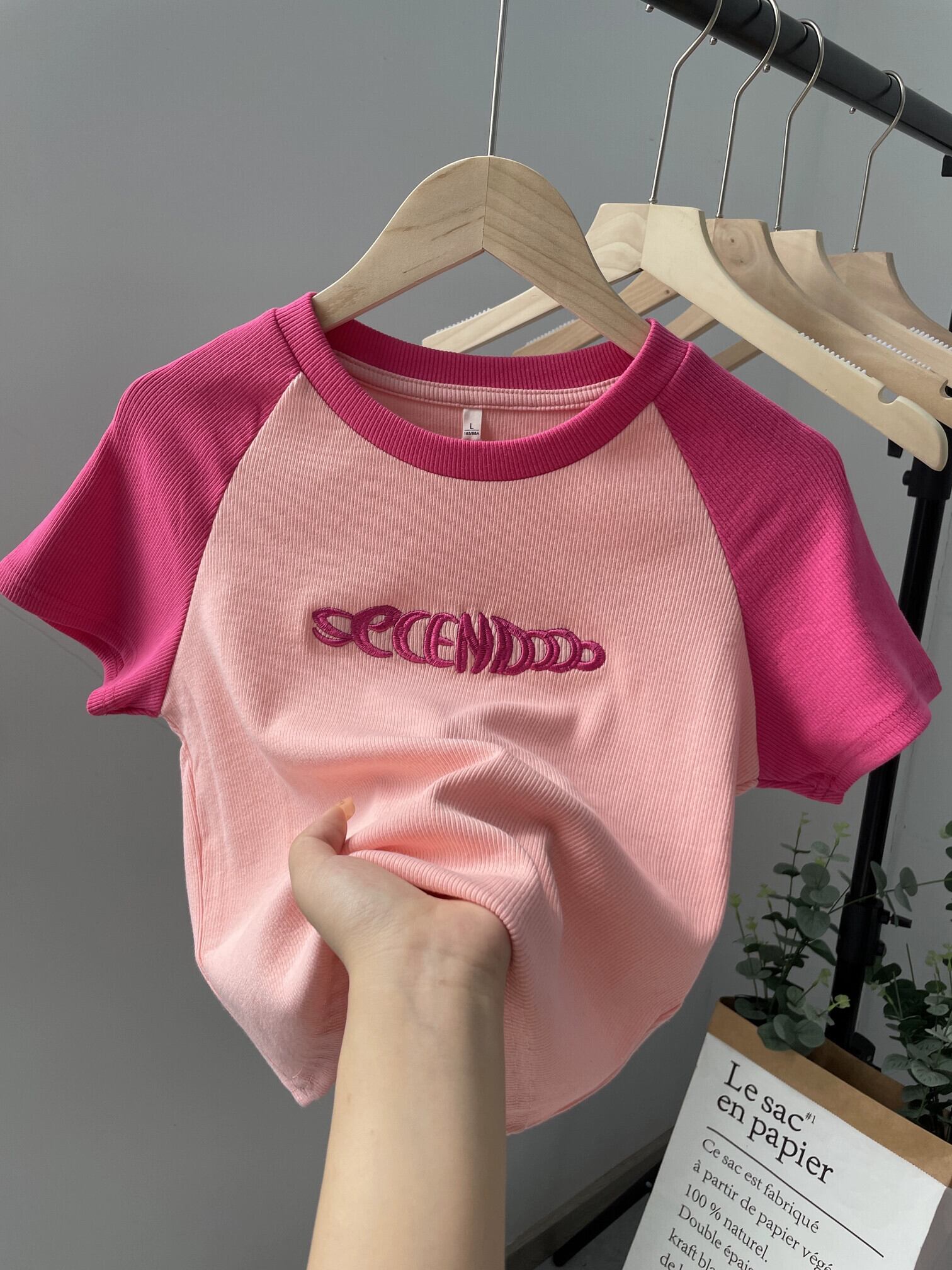 フロントショルダー ラグランショルダー 半袖 Tシャツ レディース 夏 デザイン 修身感 スリム ハイウエスト ショート ローズレッド ラウンドネック トップス イン ハイウェスト サマー 夏物 Oネック 7460046999668873 | framboise21