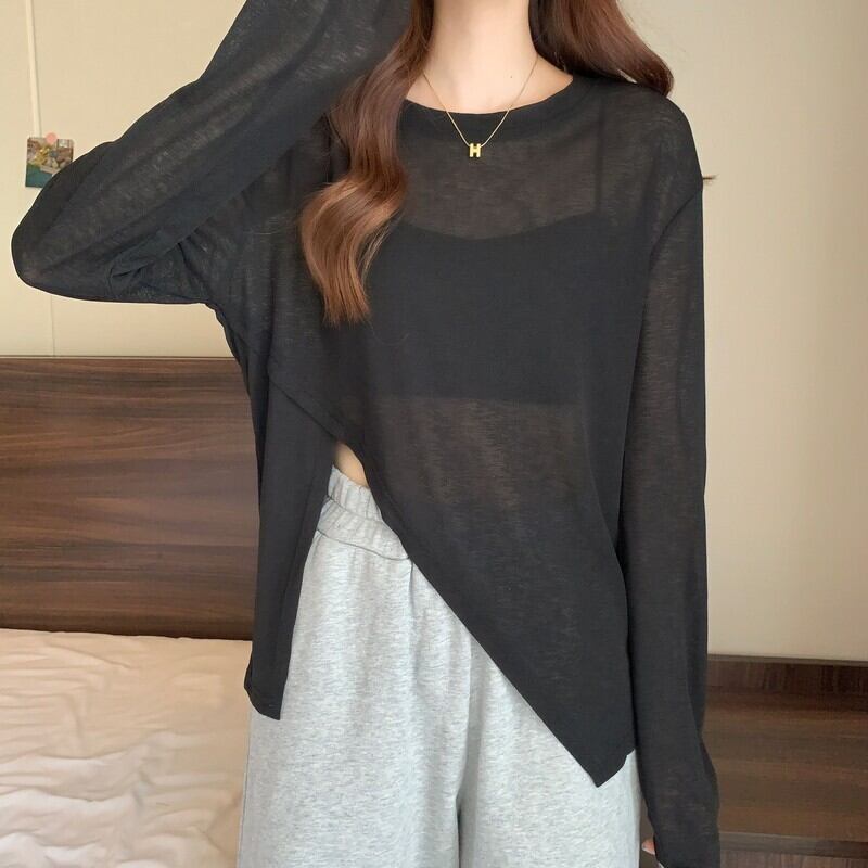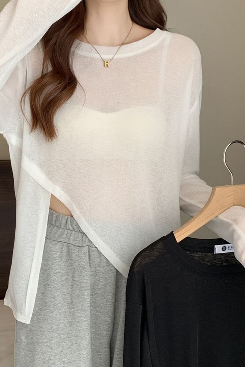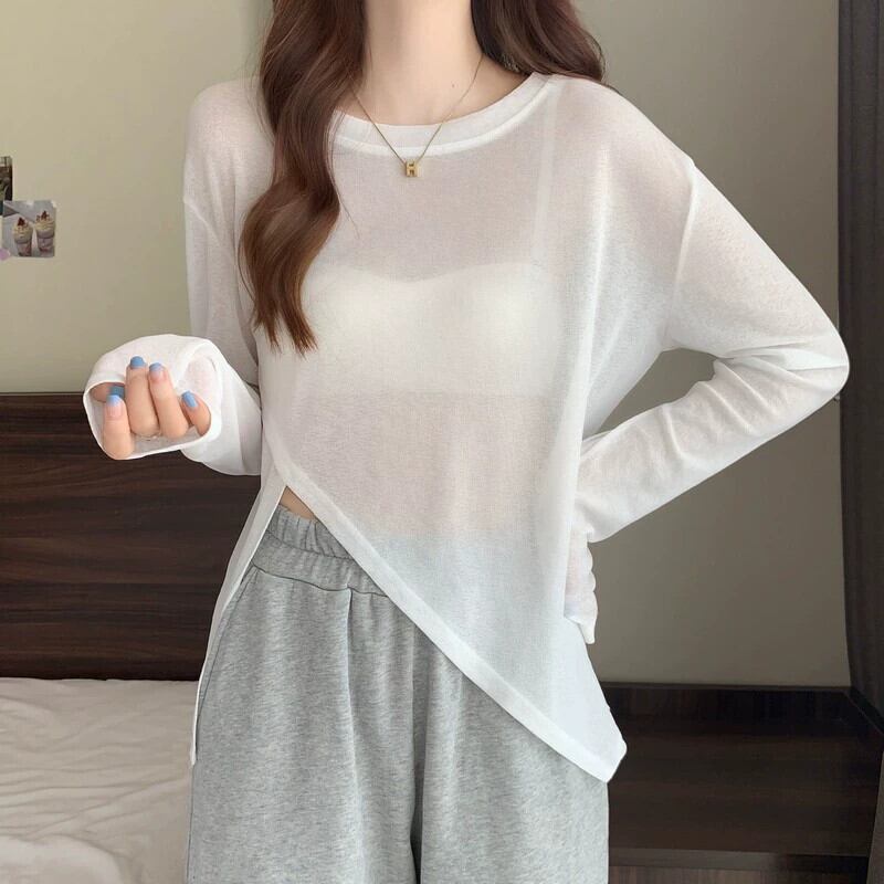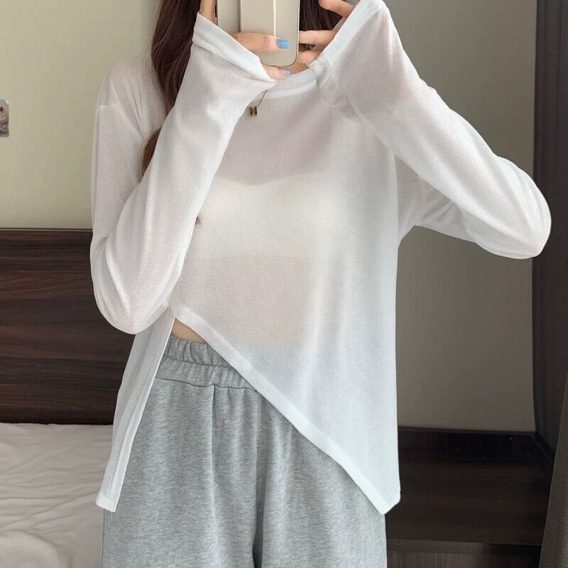 ホワイトアイスシルク長袖Tシャツレディース夏ルーズカジュアル怠惰な薄セクション日焼け止めブラウス不規則なスプリットトップス ロング サマー 夏物 746004142521882 | framboise21