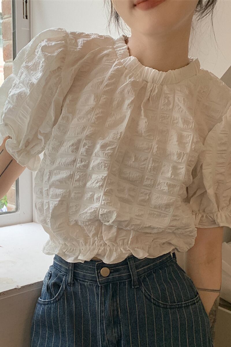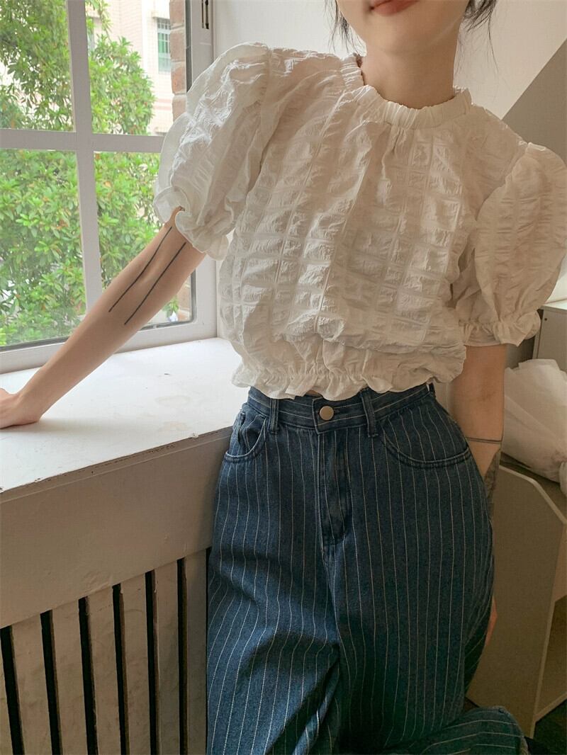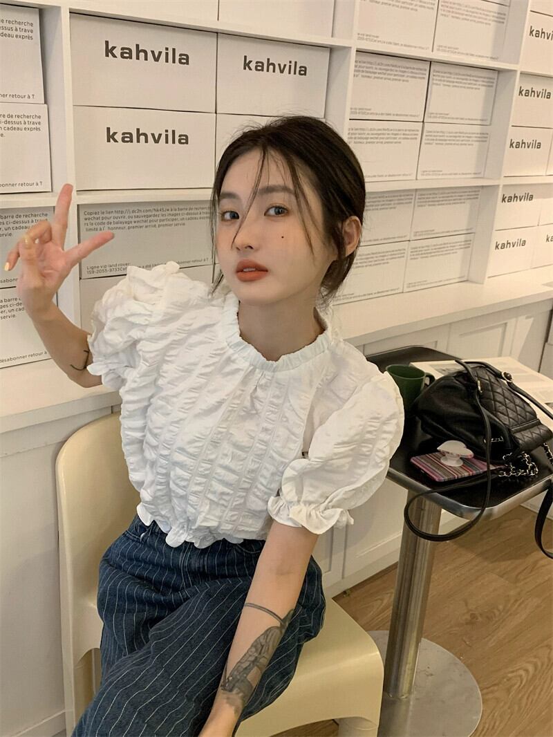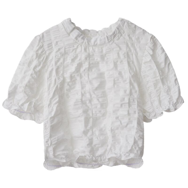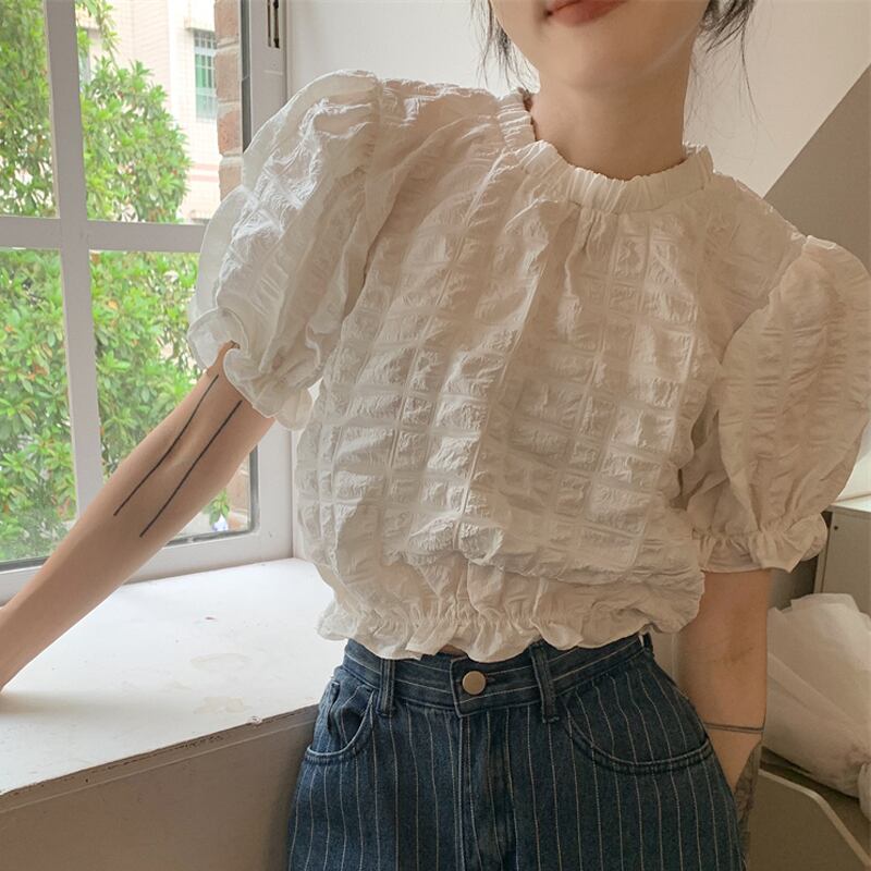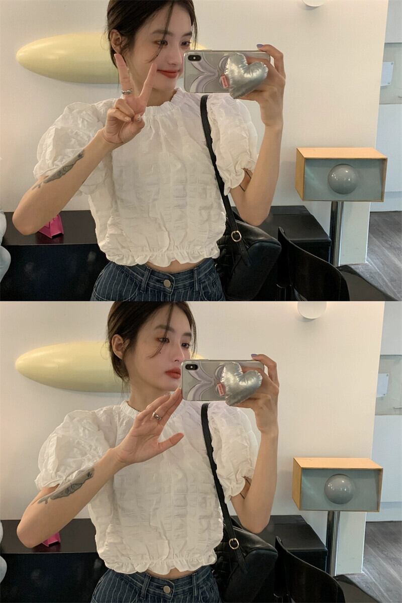 テクスチャード半袖シャツ女性の夏のデザインファッションアインスタイルシックなハイウエストショートプリーツパフスリーブトップ ハイウェスト レッド サマー 夏物 746002968088157 | framboise21