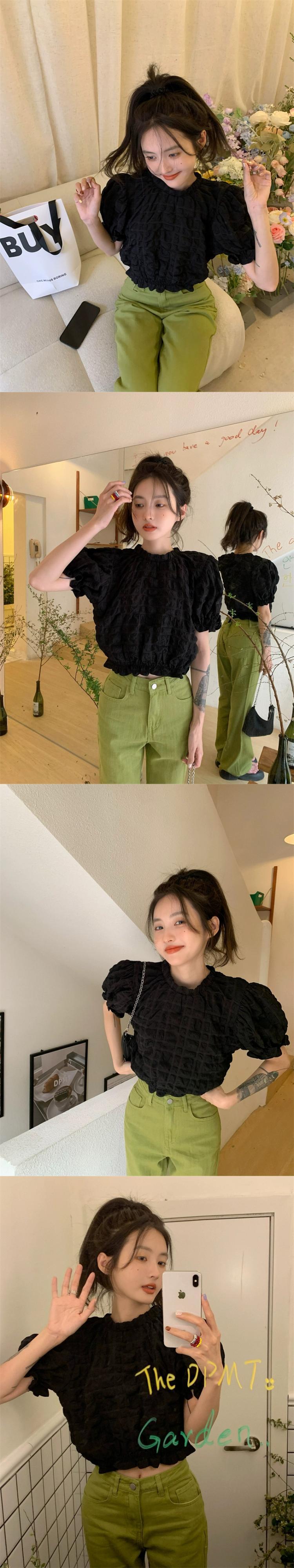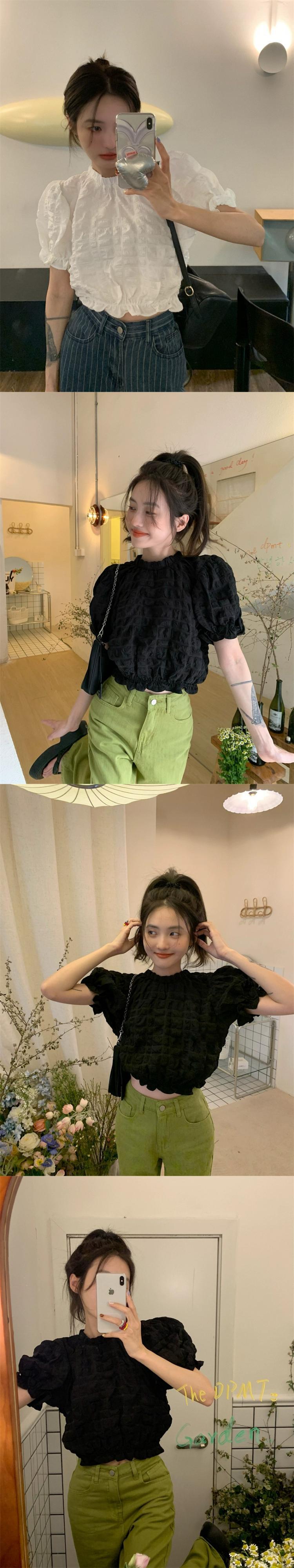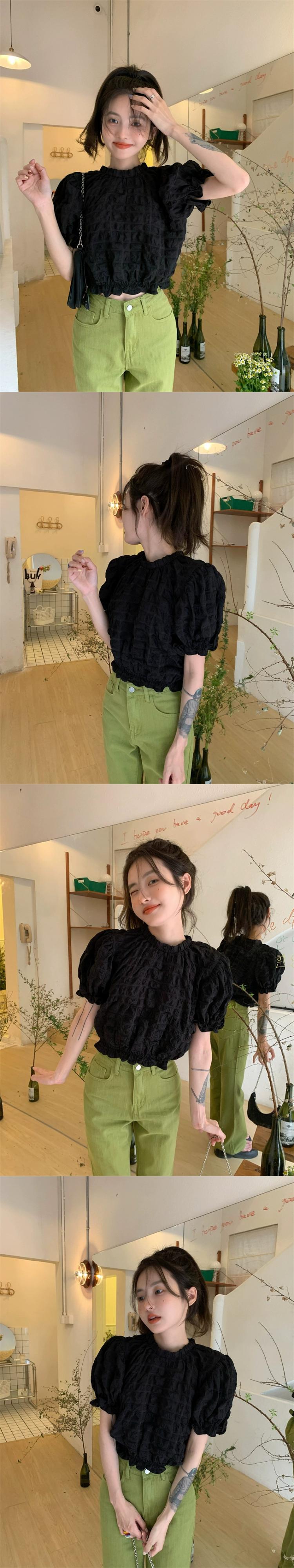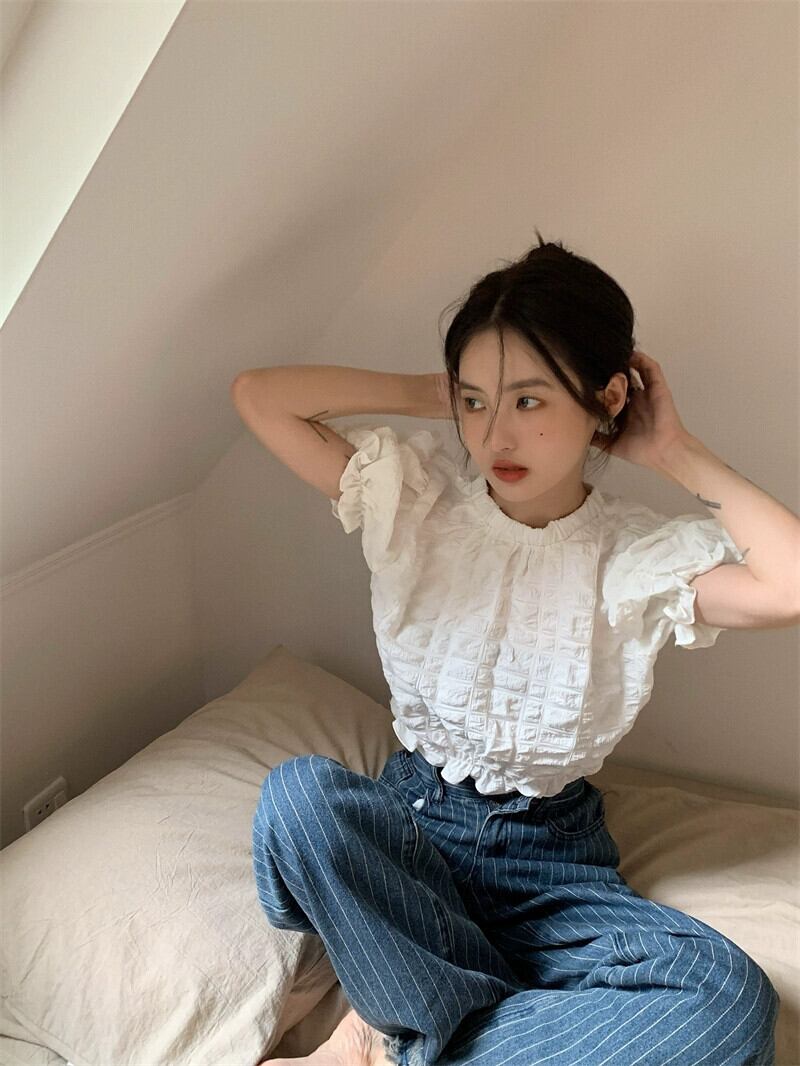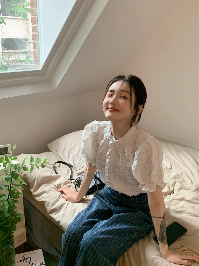 テクスチャード半袖シャツ女性の夏のデザインファッションアインスタイルシックなハイウエストショートプリーツパフスリーブトップ ハイウェスト レッド サマー 夏物 746002968088157 | framboise21