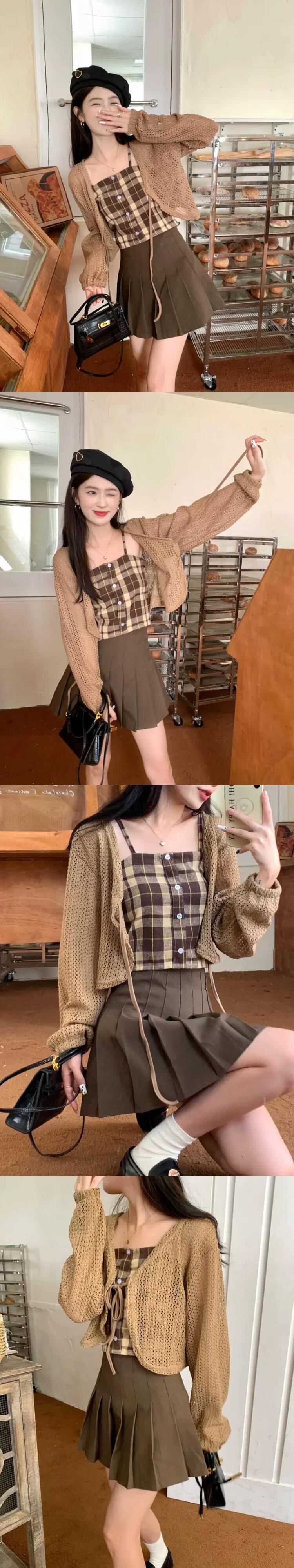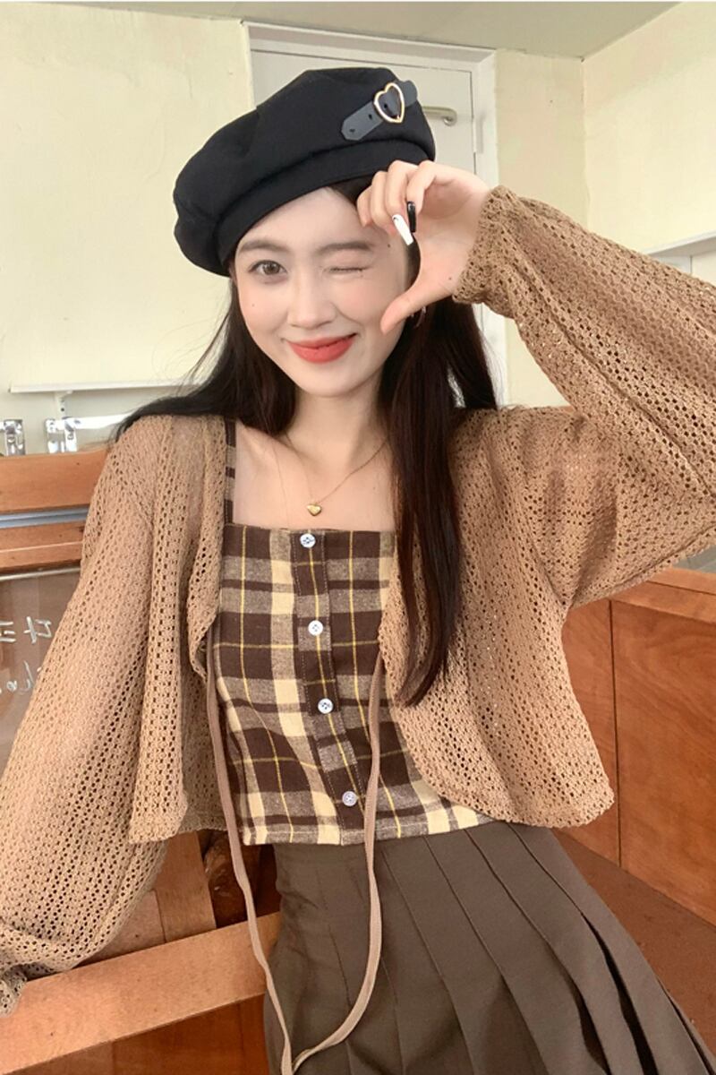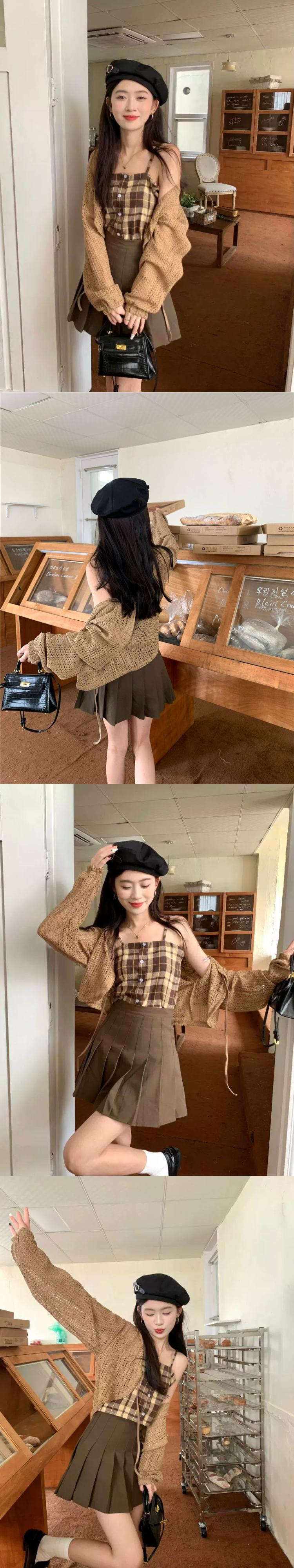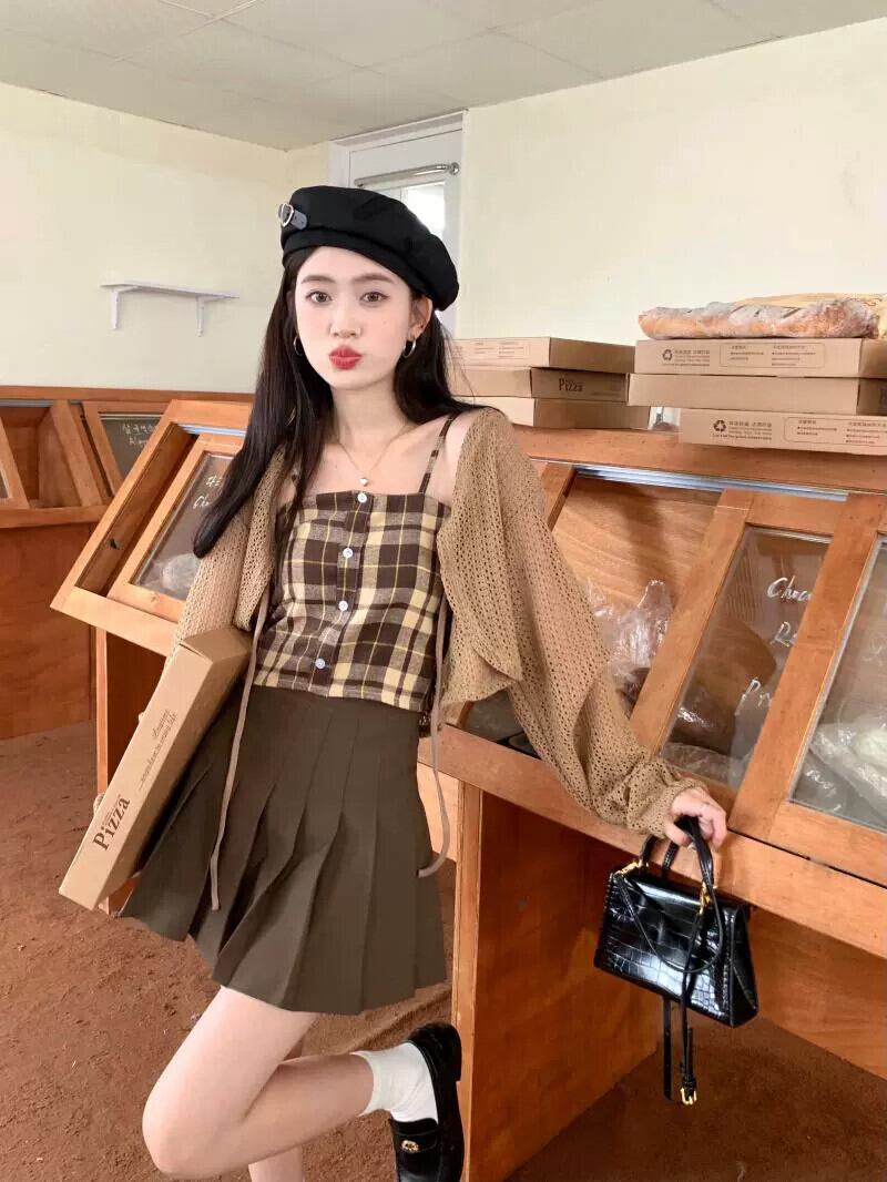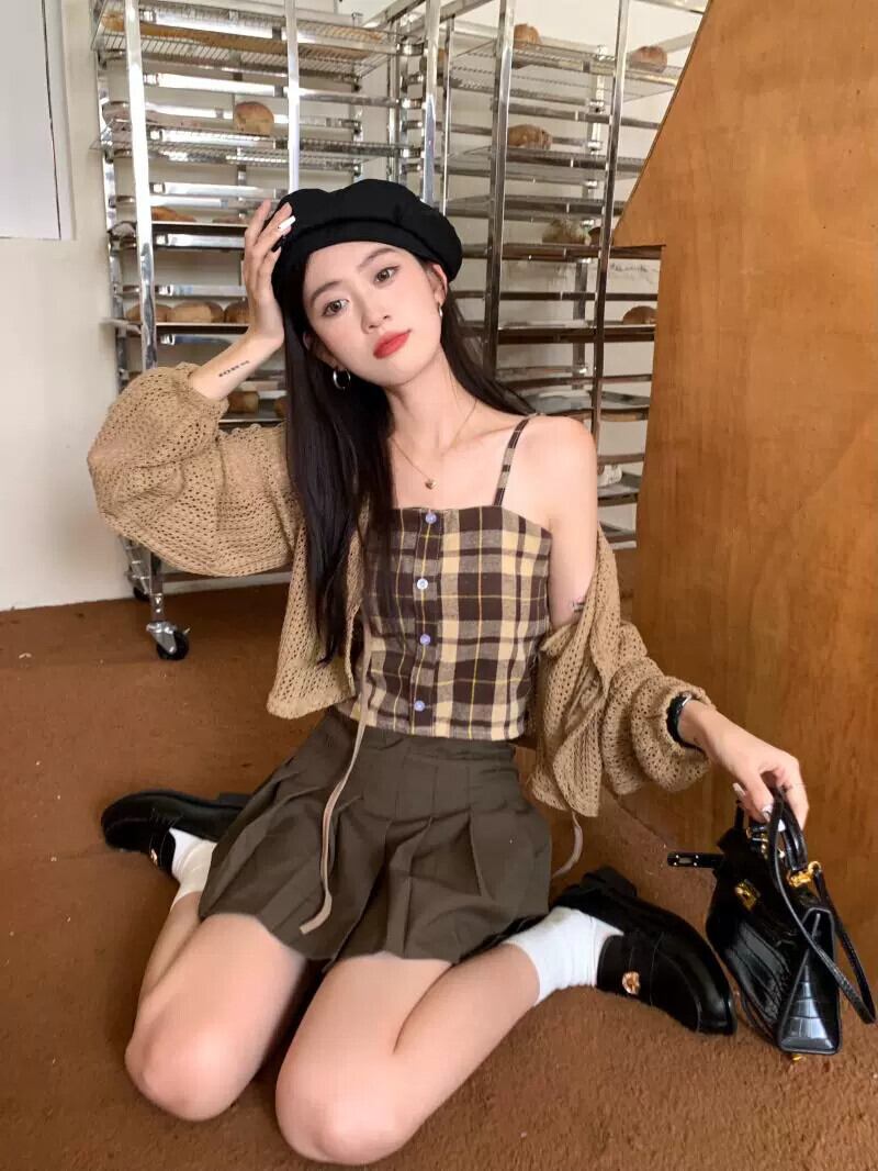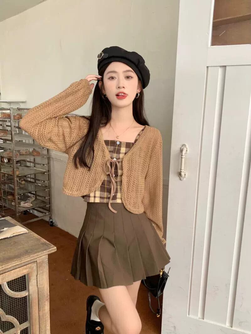 中空ストラップ日焼け止めニットカーディガンジャケット女性の夏の新しいチェック柄サスペンダープリーツスカートスリーピーススーツ サマー 夏物 7460056347679454 | framboise21