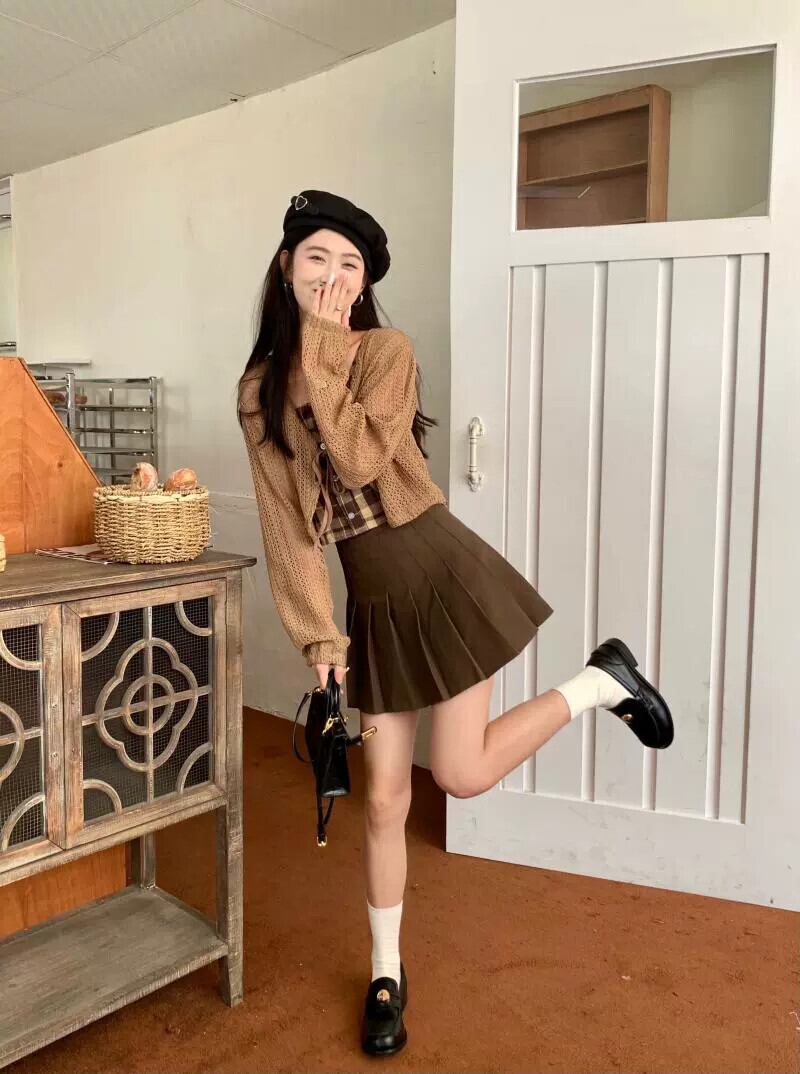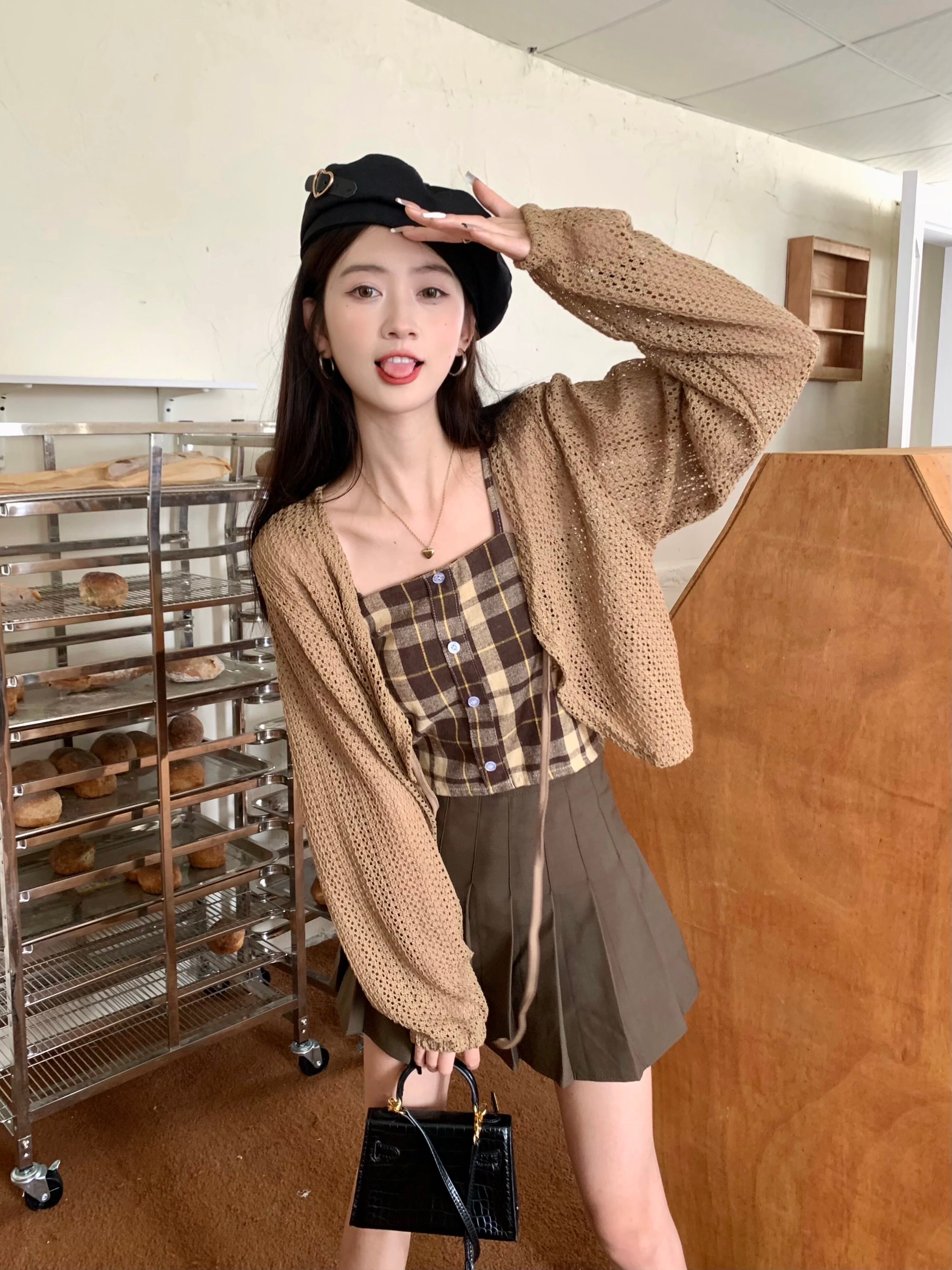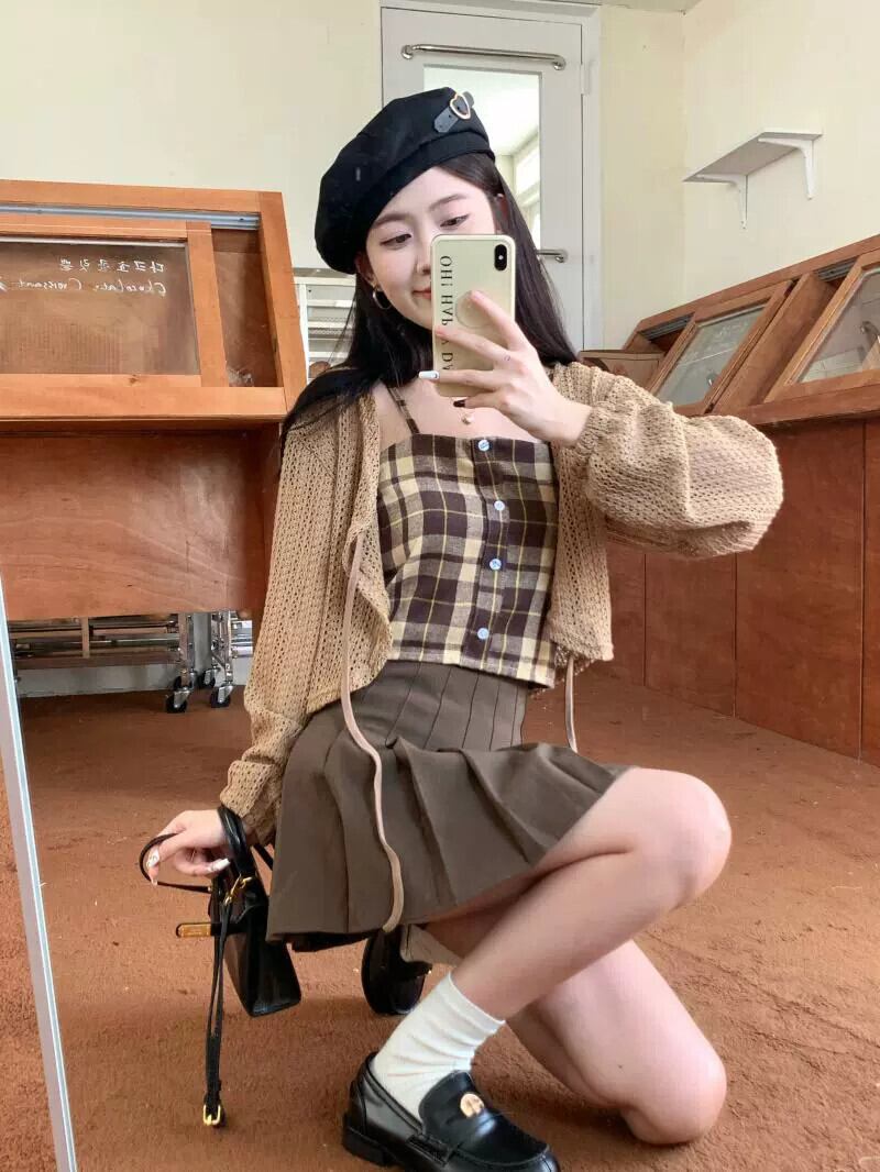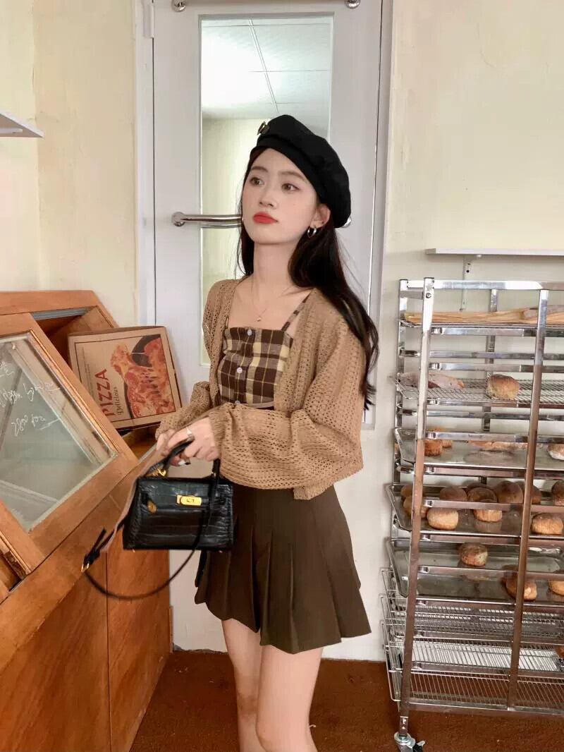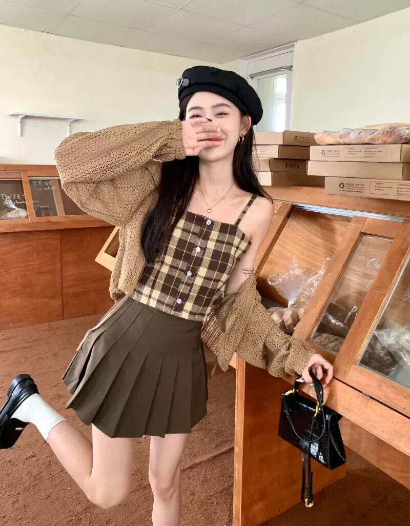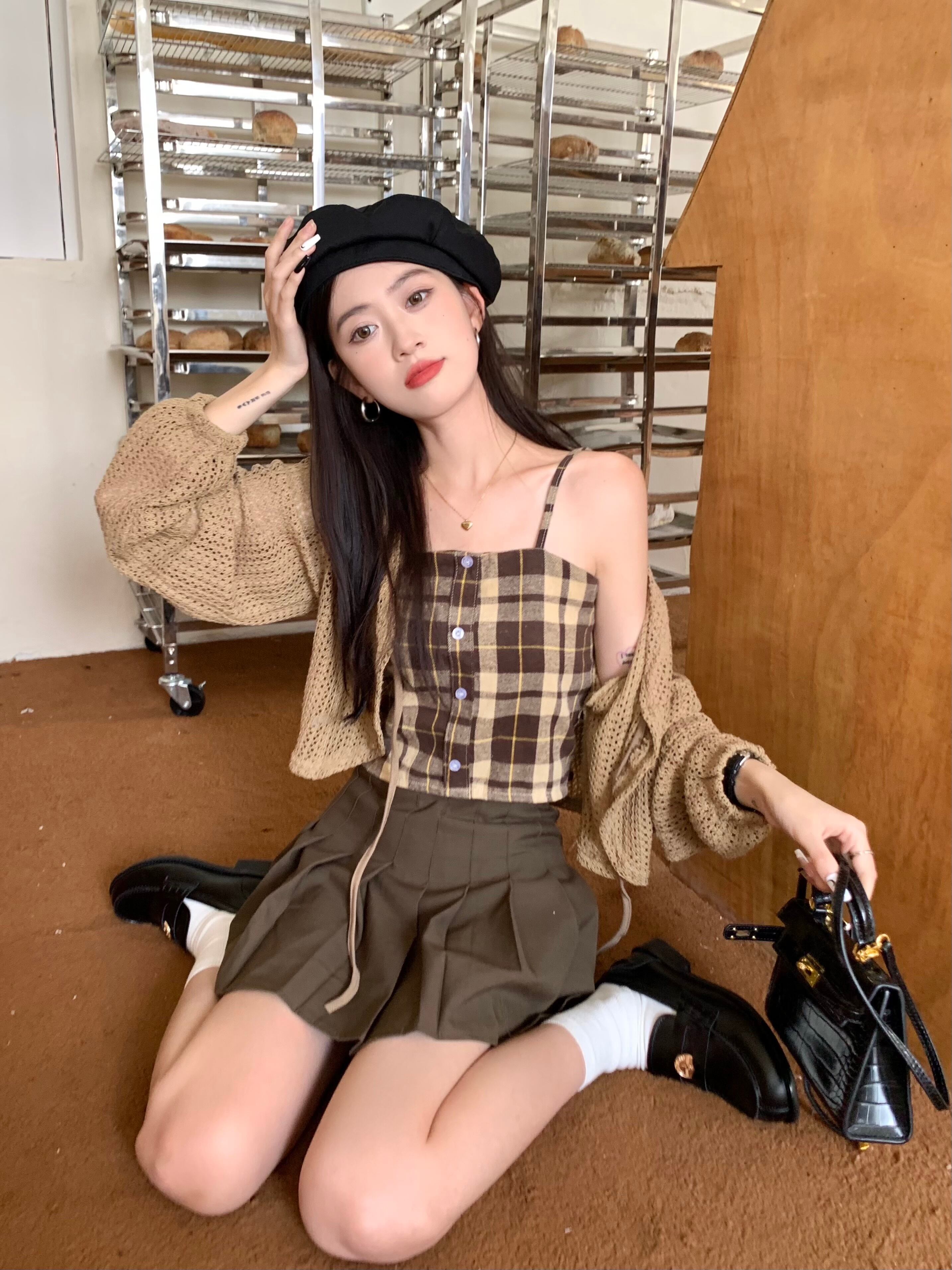 中空ストラップ日焼け止めニットカーディガンジャケット女性の夏の新しいチェック柄サスペンダープリーツスカートスリーピーススーツ サマー 夏物 7460056347679454 | framboise21