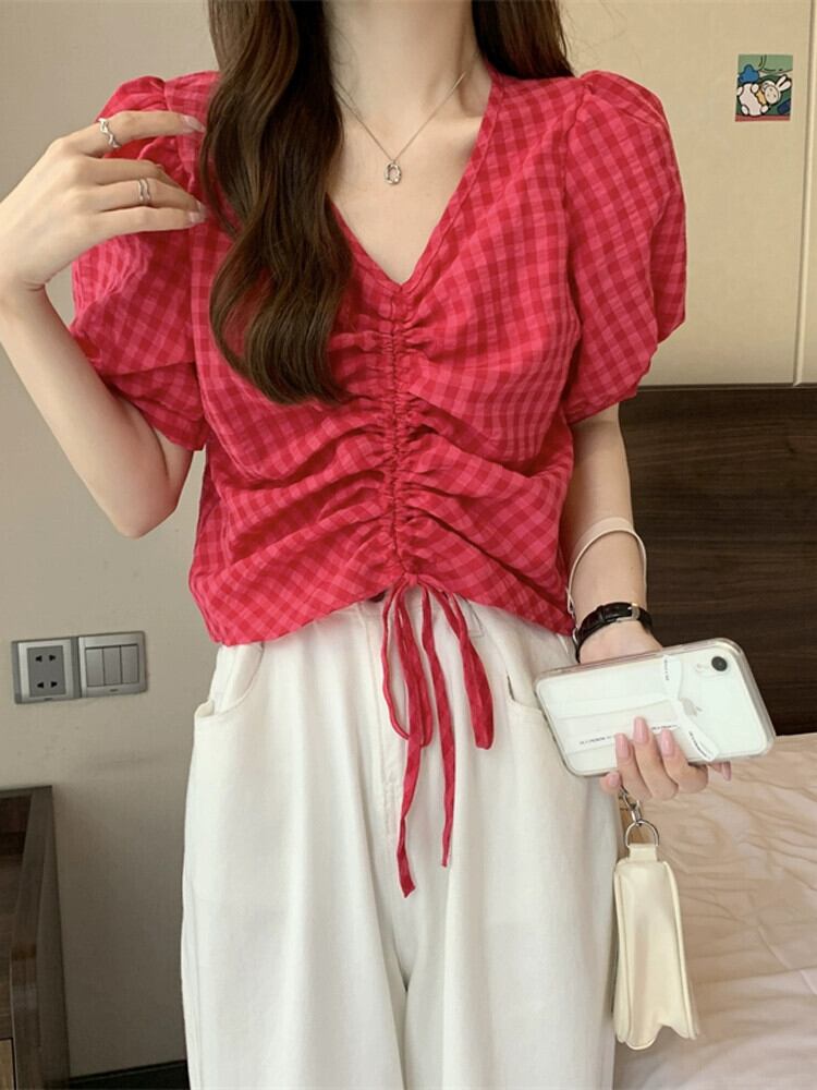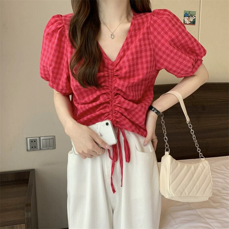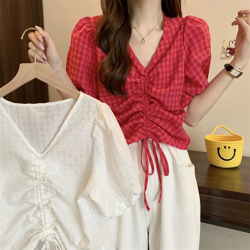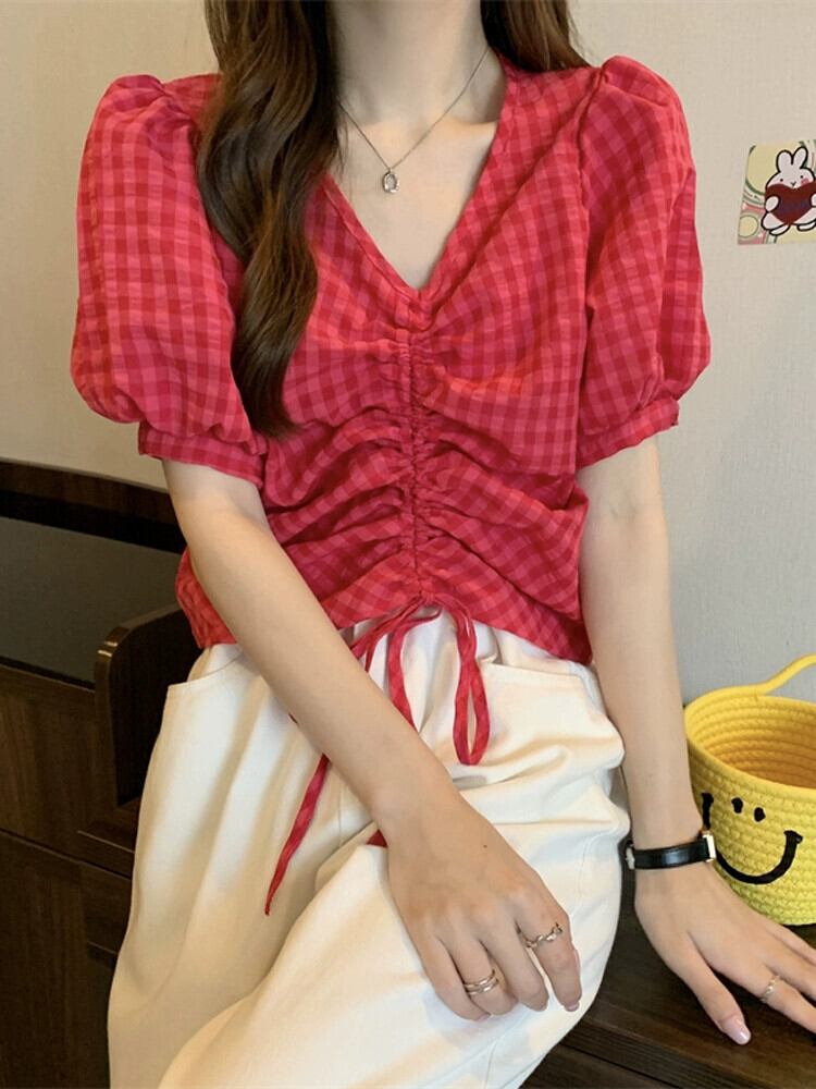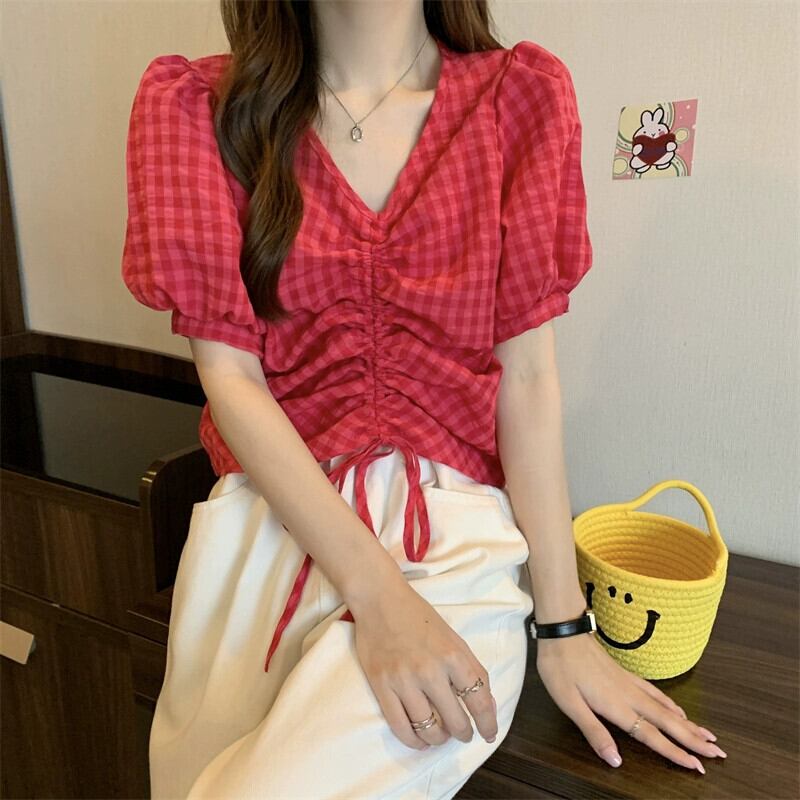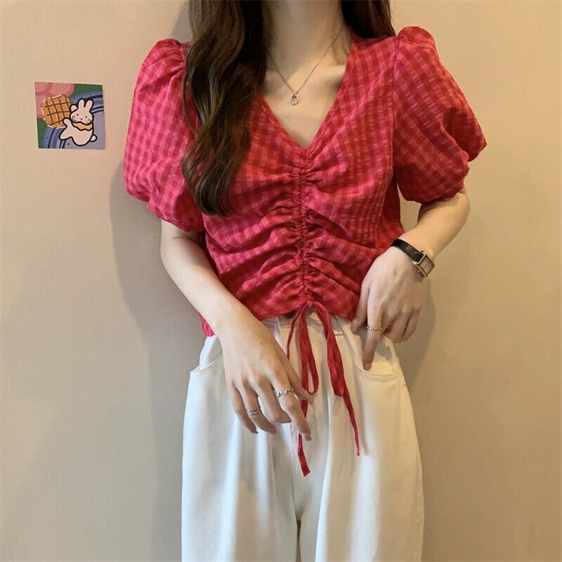 チェック柄パフスリーブシャツレディース夏ユニークシックニッチオールマッチ半袖シャツショートドローストリング V ネックトップ サマー 夏物 Vネック 7460084941179490 | framboise21