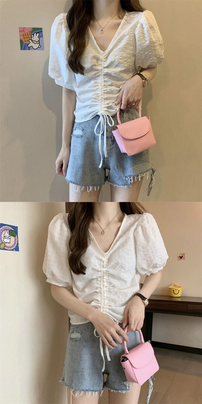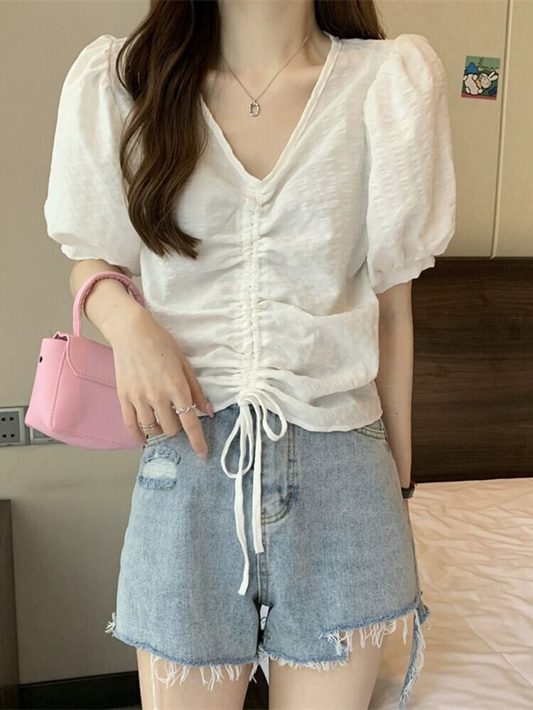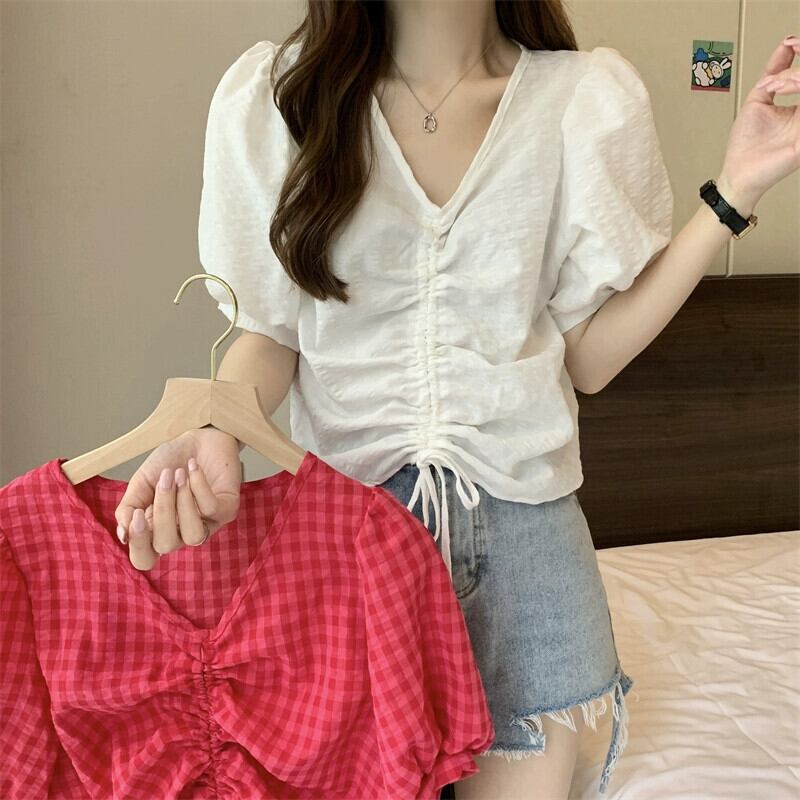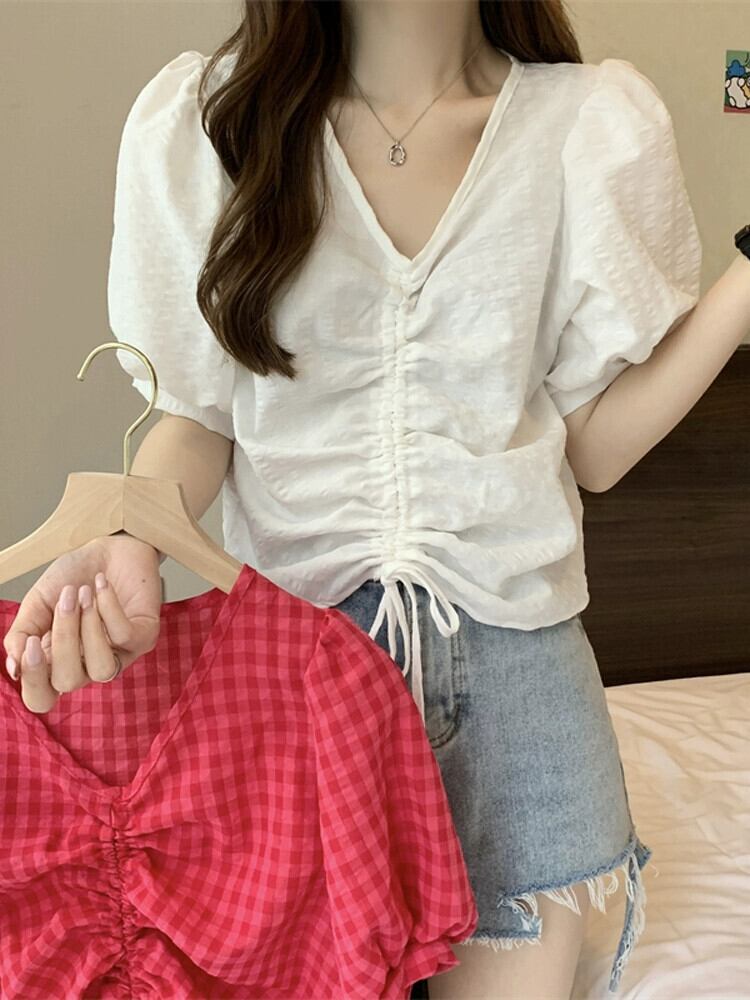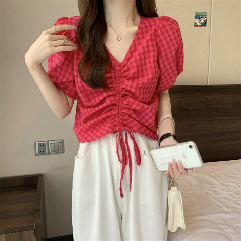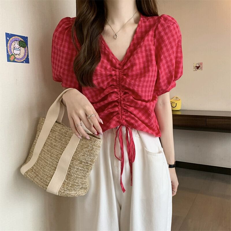 チェック柄パフスリーブシャツレディース夏ユニークシックニッチオールマッチ半袖シャツショートドローストリング V ネックトップ サマー 夏物 Vネック 7460084941179490 | framboise21